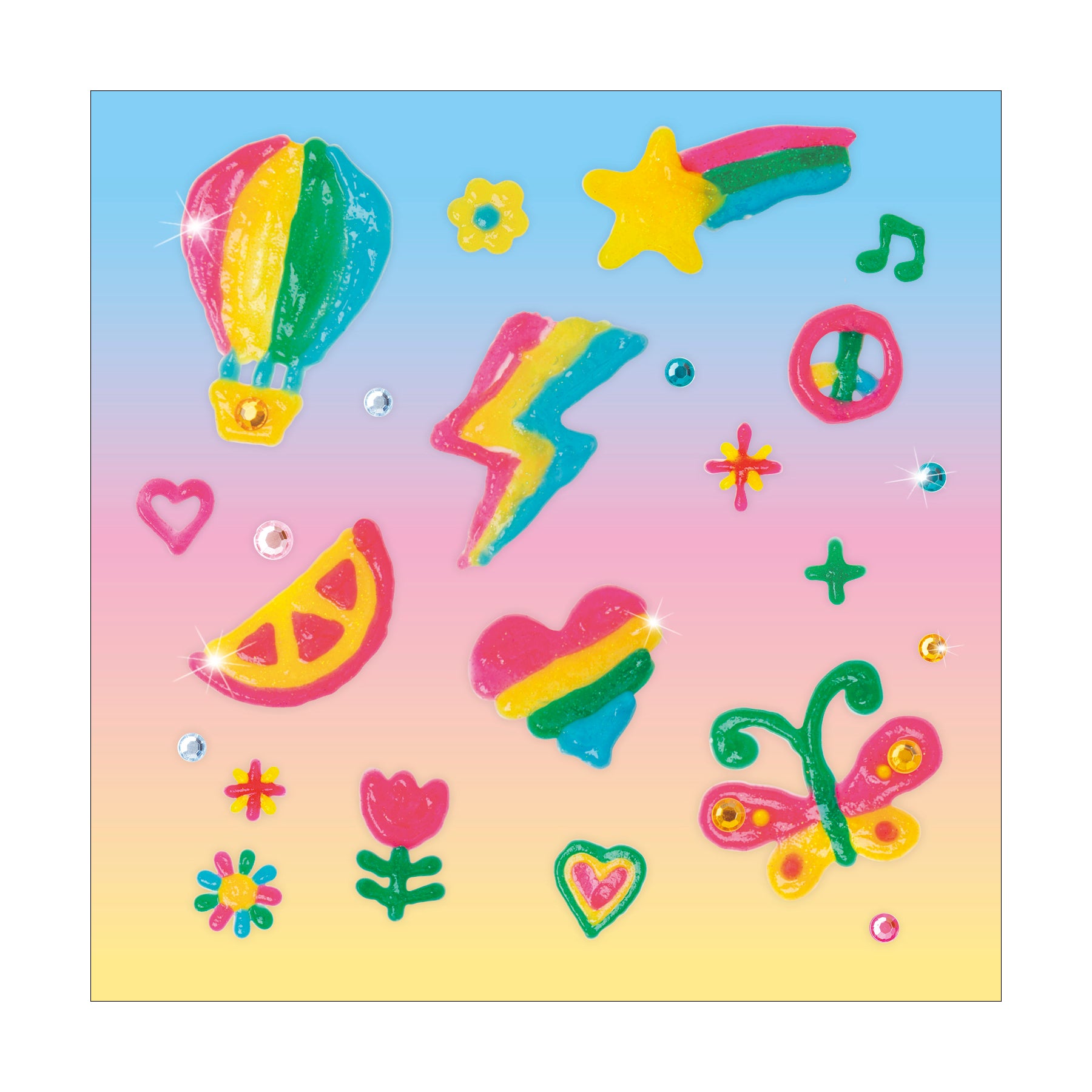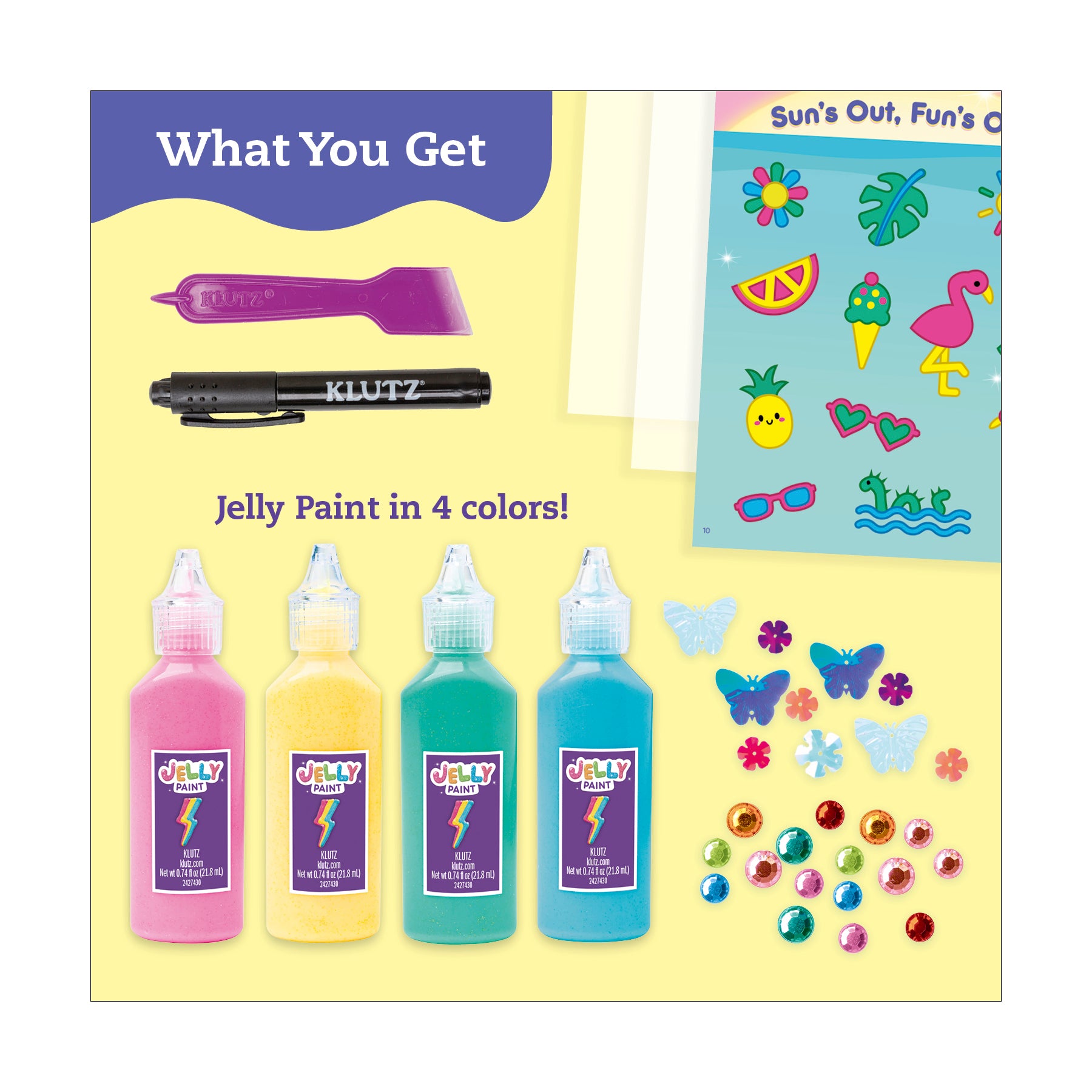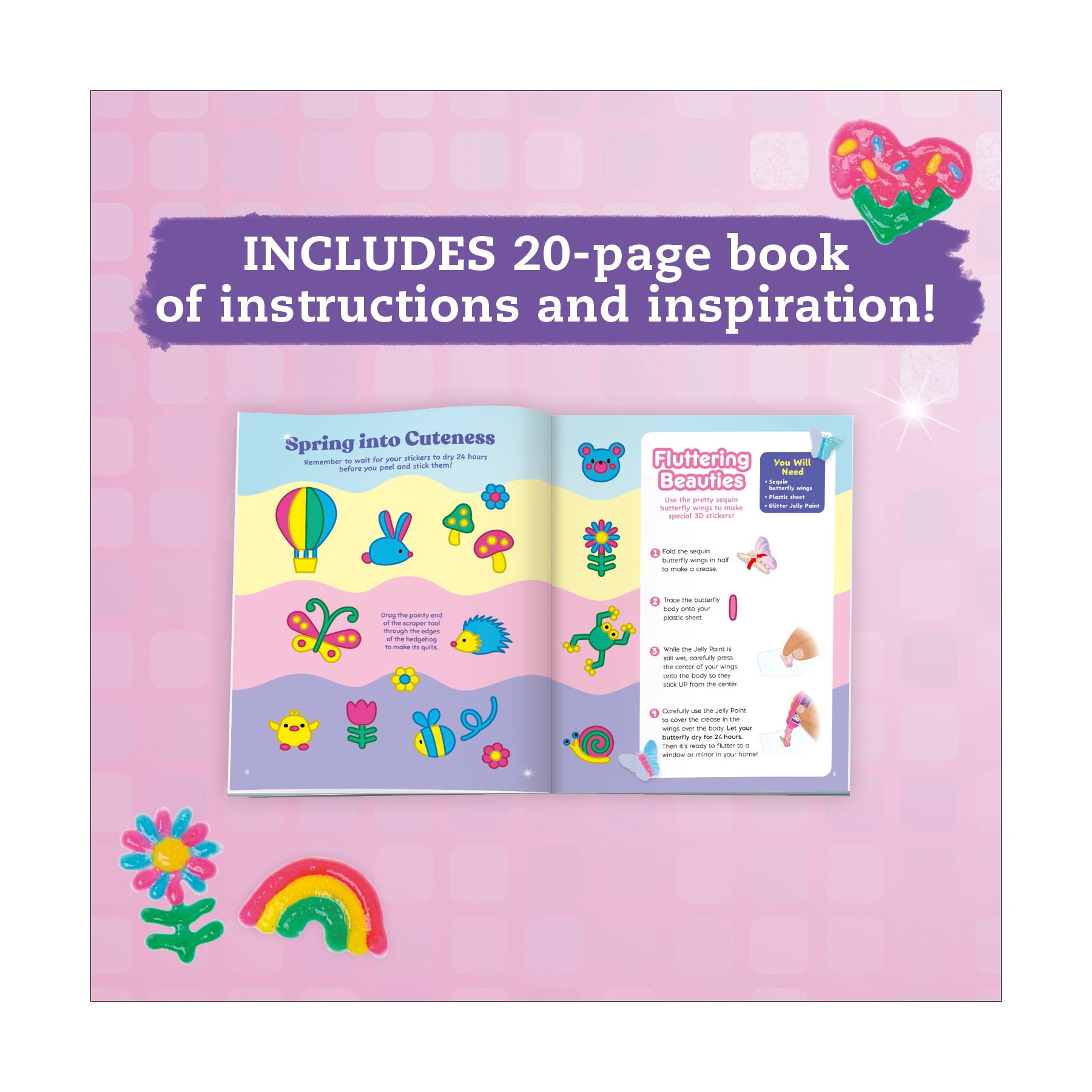 Contents include: 20-Page Book of Ideas and Inspiration, Jelly Paint in 4 Colors, 2 Plastic Sheets, Mini Marker, Scraper Tool, 36 Rhinestones, 10 Butterfly Sequins, 15 Flower Sequins