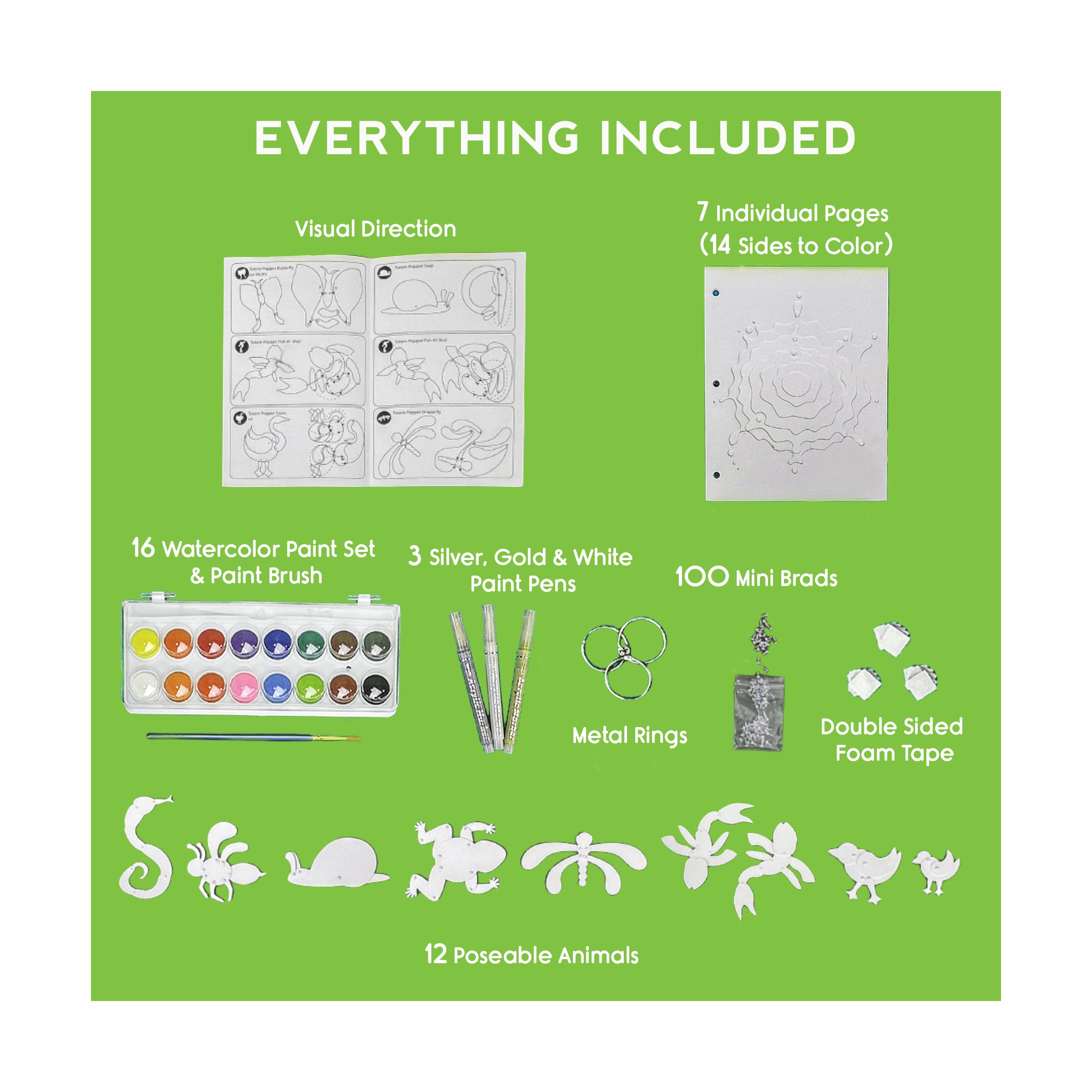 Contents include: 8.5" x 11" 3D Tunnel Book (7 pgs), 12 8.5" x 11" Totem Poppet Figures, 100 White Mini Brads, 1 Set of Watercolors in 16 Colors, 1 Paint Brush, 3 Markers, 12 Pieces Double Stick Foam Tape, 3 Metal Book Rings, Instructions