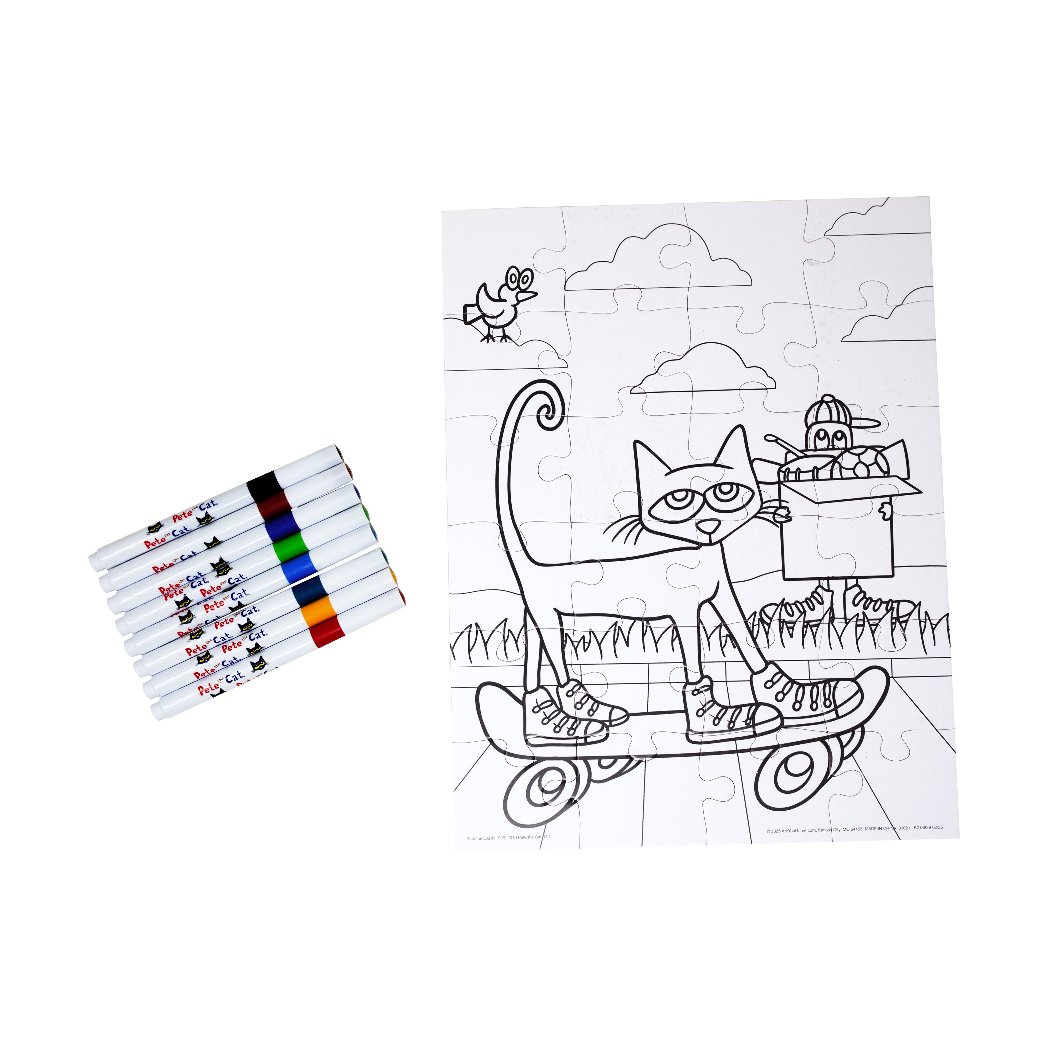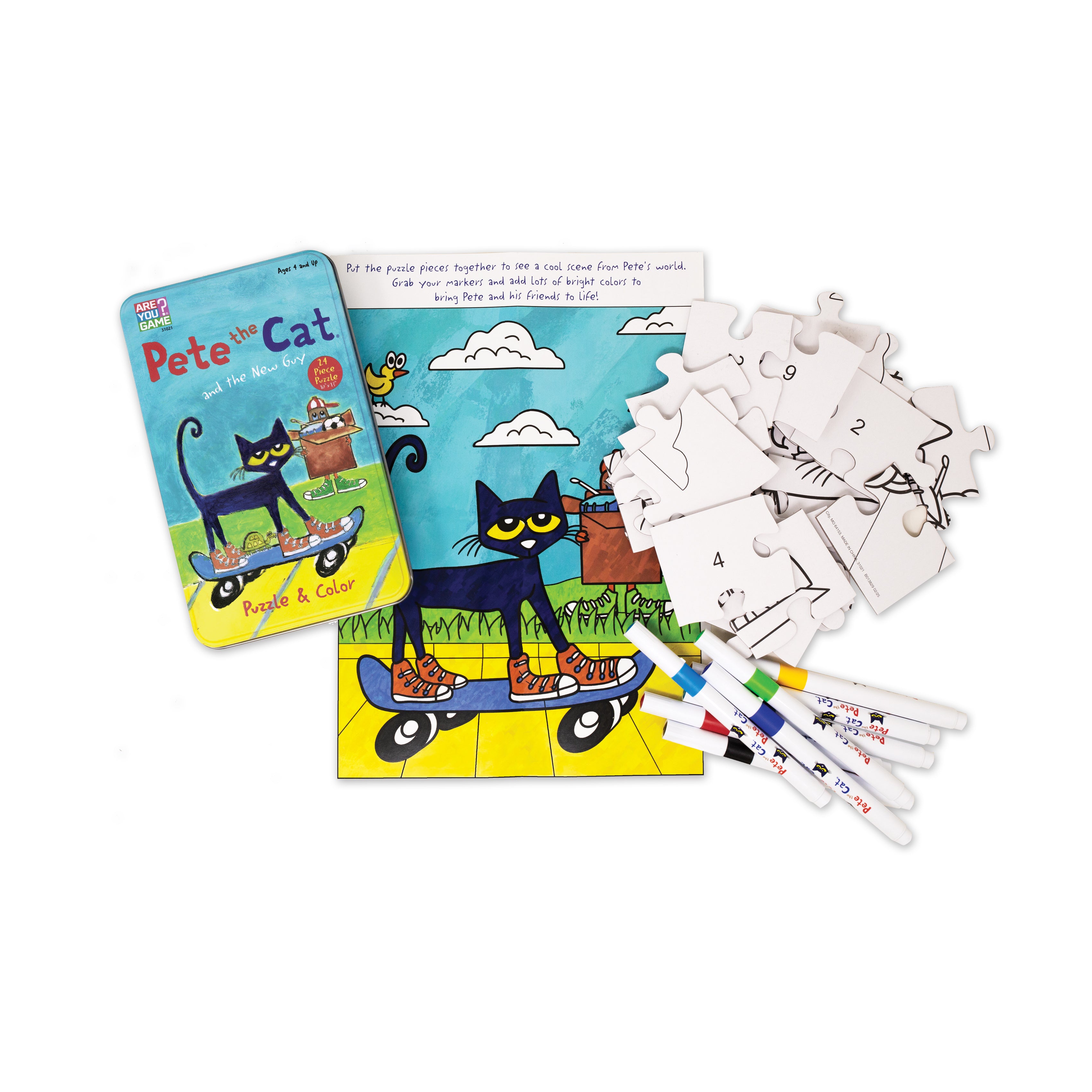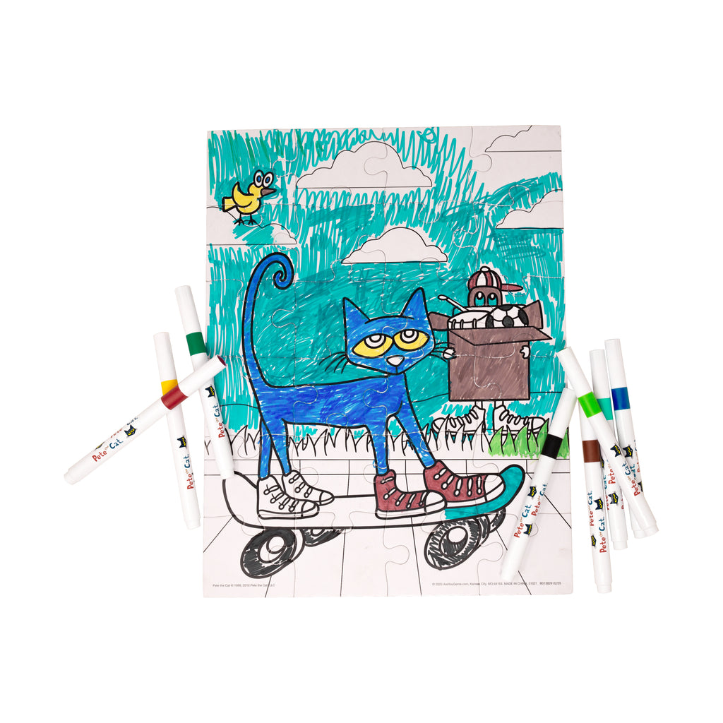 Get ready for a groovy good time with the Pete the Cat and the New Guy Color-In Puzzle! This creative 24-piece jigsaw puzzle brings the beloved characters from Pete the Cat and the New Guy to life in a fun, hands-on way that's perfect for young fans. But this isn't just any puzzle - once the pieces are put together, the fun is just beginning! This puzzle is printed in black and white line art, allowing kids to use their imagination and express their creativity by coloring it in themselves. It comes with 8 vibrant markers - everything you need to personalize your masterpiece! Piece by piece, kids will build the image and then bring it to life with color, use the completed guide or design their own version of Pete and his cool new friend. Each sturdy piece is easy to handle, and the numbered backside makes reassembly a breeze for young puzzlers. Assembled puzzle measures approximately 10 x 13 inches.