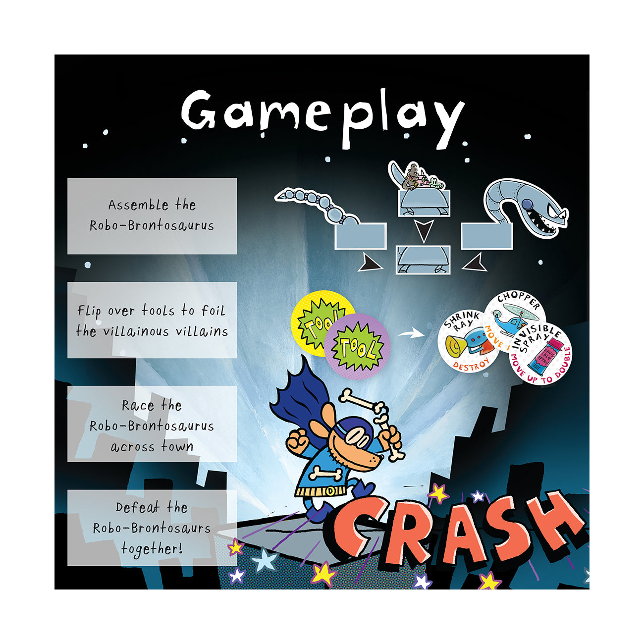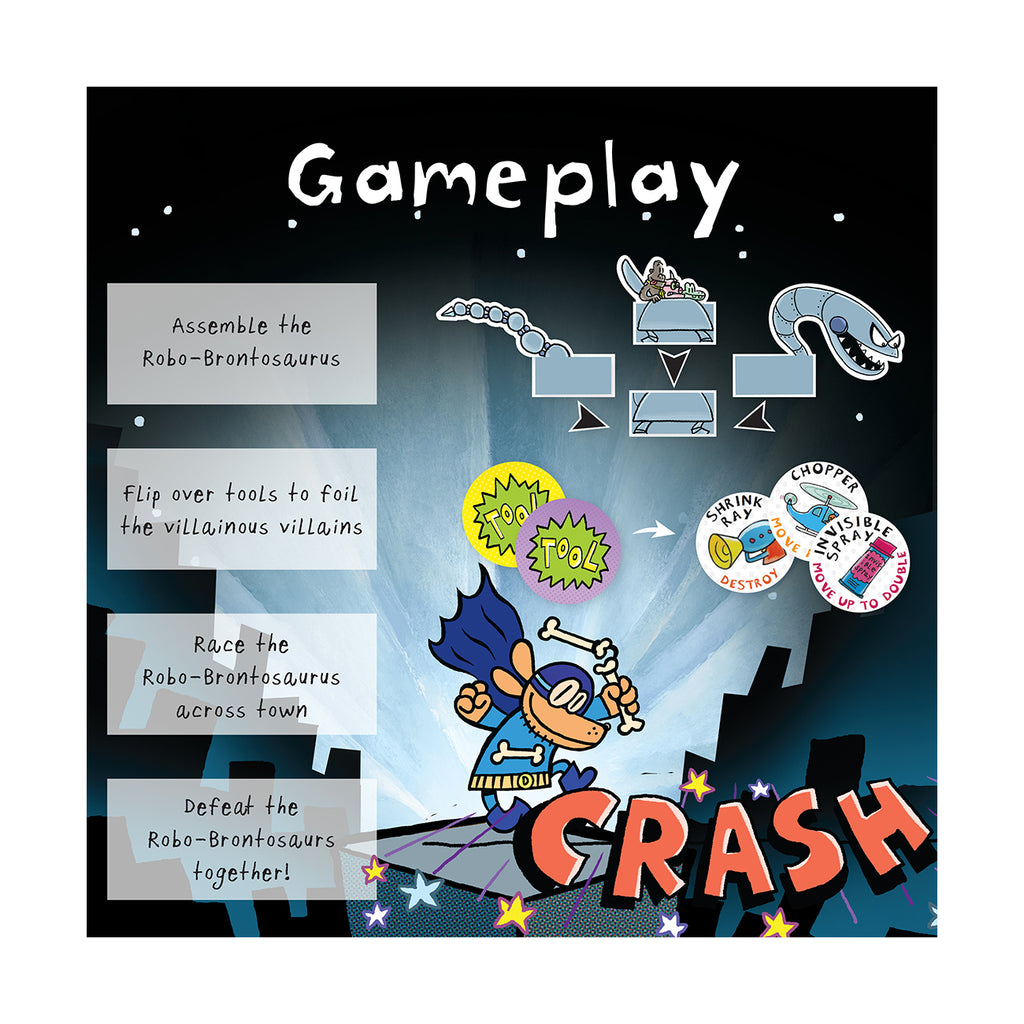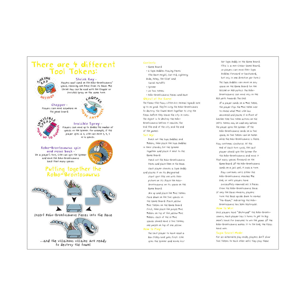 Contents include: Game Board, 6 Supa Buddies Playing Pieces, Robo-Brontosaurus Pieces and Base, 20 Tool Tokens, Spinner, Instructions
