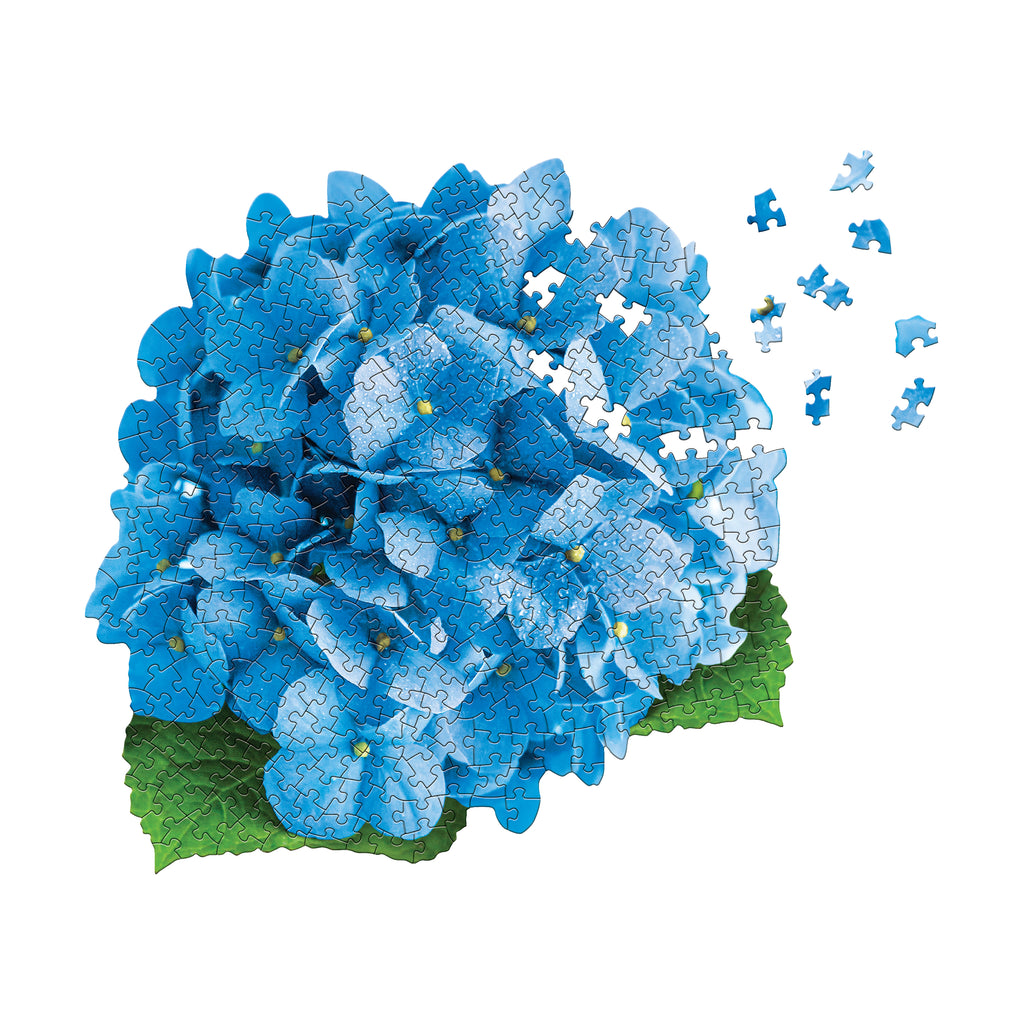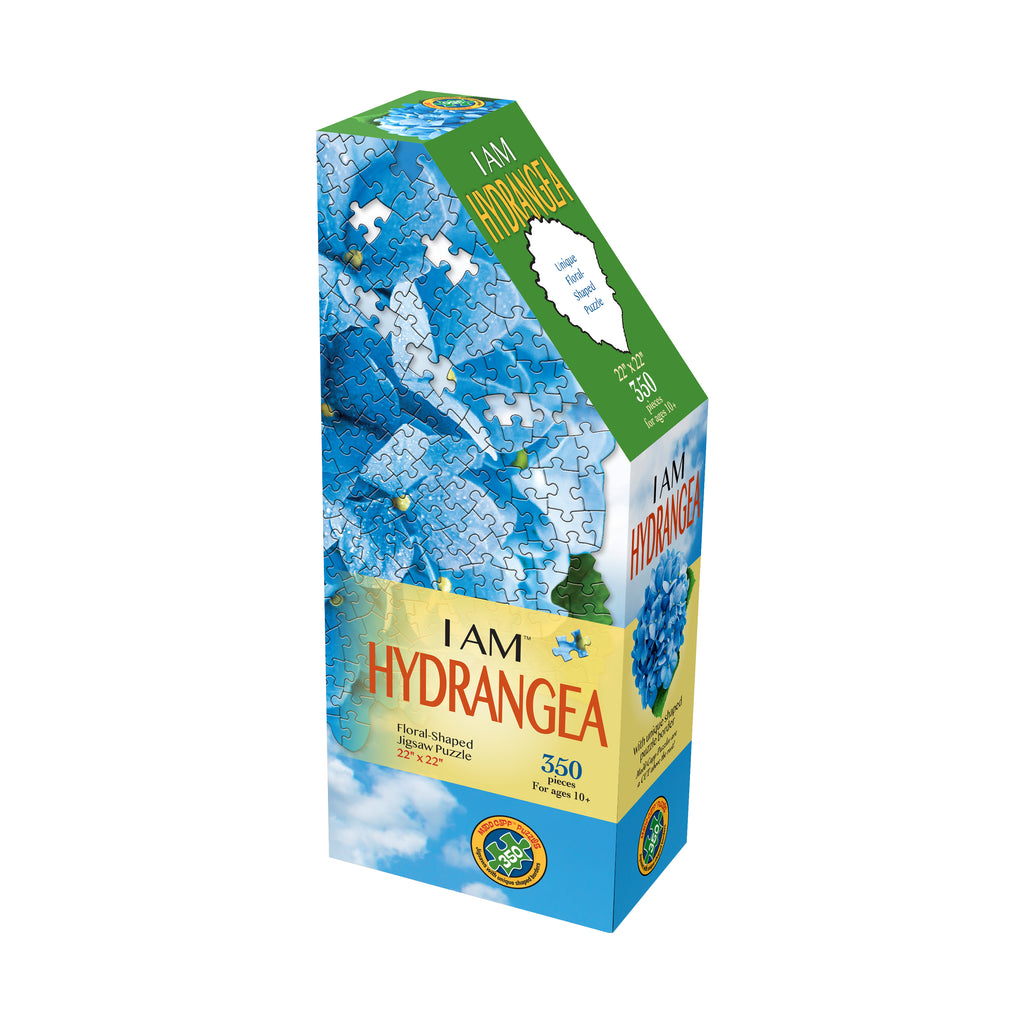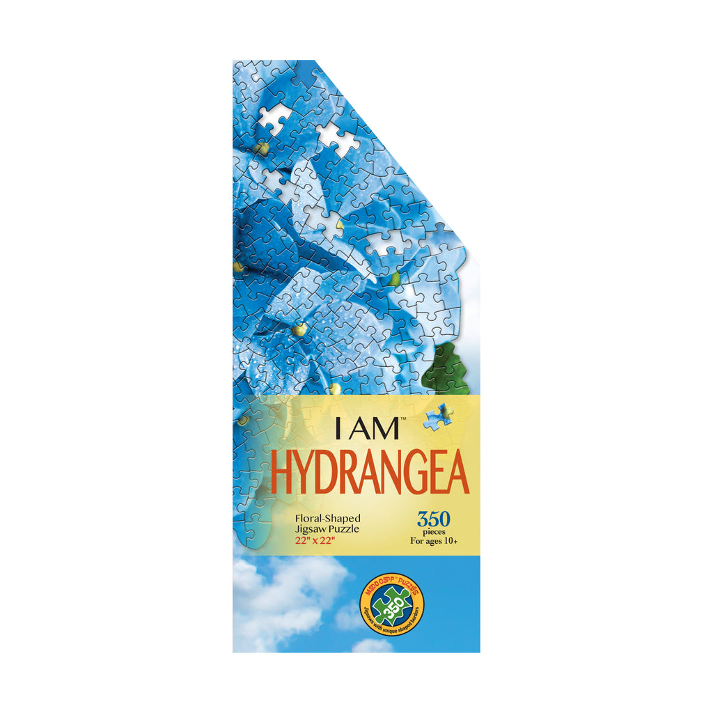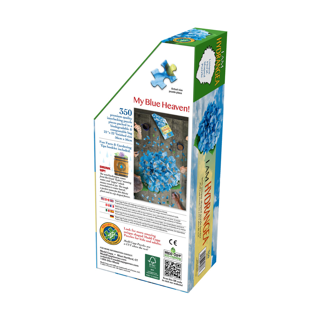 My Blue Heaven! The I Am Hydrangea puzzle is a unique floral-shaped jigsaw with 350 interlocking pieces, designed for ages 10 and up. Its semi-gloss, photo-realistic image captures the delicate beauty of the hydrangea bloom. Crafted from premium recycled chipboard, the thick, sturdy, dust-free pieces fit snugly and can handle repeated use. Each puzzle is packed in a biodegradable, compostable bag, making it an eco-friendly choice. The finished size is 22 x 22 inches, perfect for most tables. With no square corners and no straight edges, this puzzle delivers just the right amount of extra challenge for a few fun-filled hours.