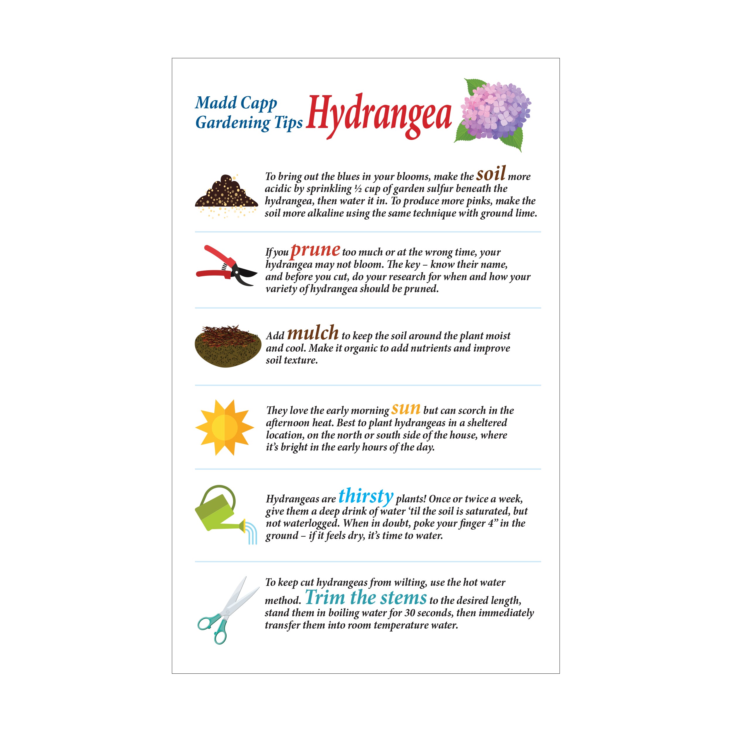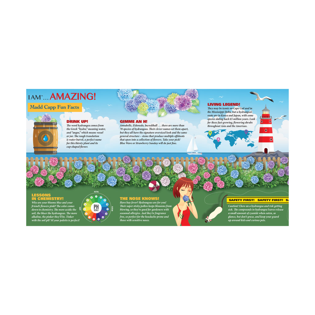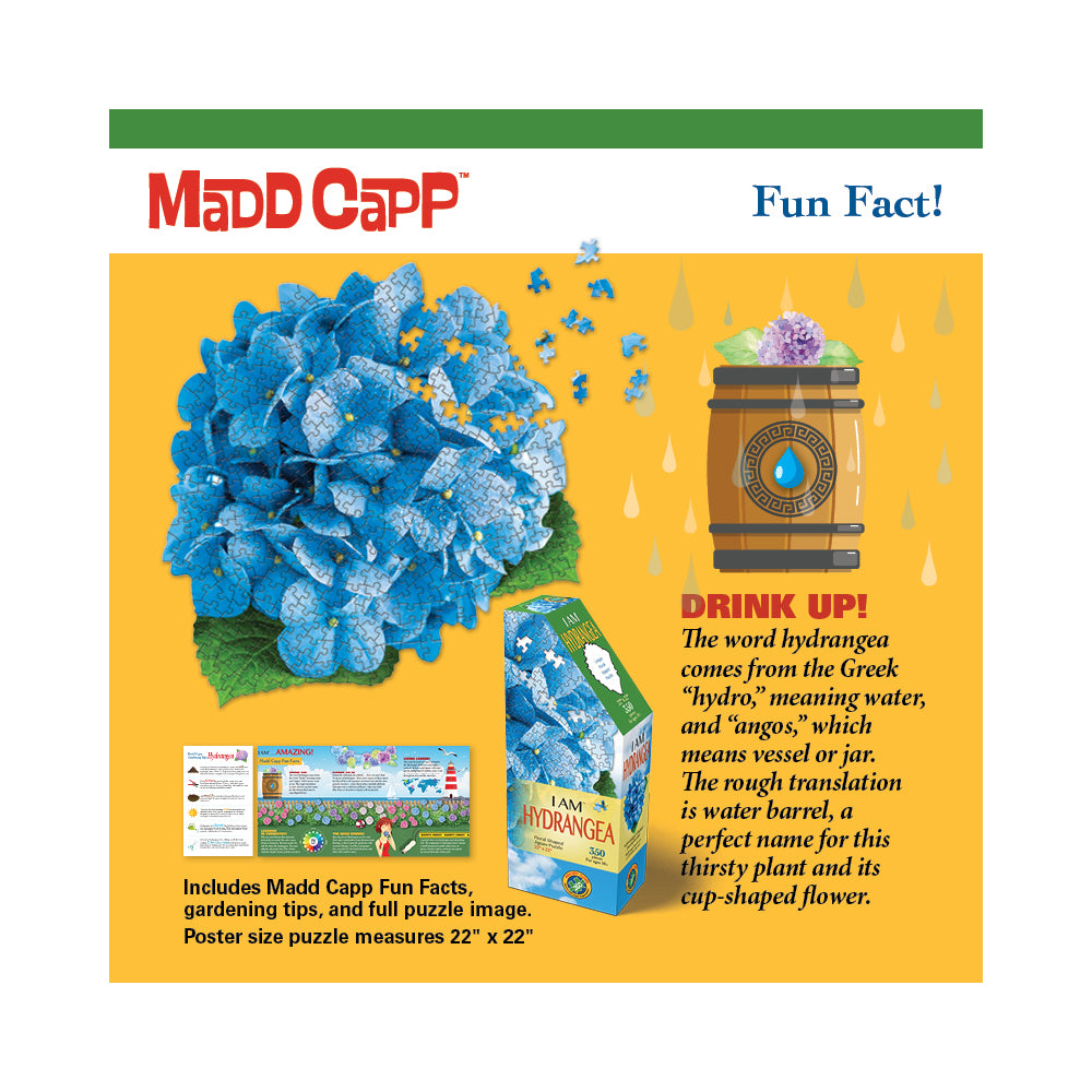 Each set includes more than just a puzzle! You'll also receive a full puzzle image and a Madd Capp Fun Facts booklet. On one side, a fold-out poster can be displayed as art or used as a handy guide while puzzling. On the other side, discover fascinating gardening tips and plant trivia. Did you know the rough translation of "hydrangea" is "water barrel", a perfect name for this thirsty plant and its cup-shaped flowers? To bring out blue blooms, the soil should be more acidic, while alkaline soil produces pink hues.