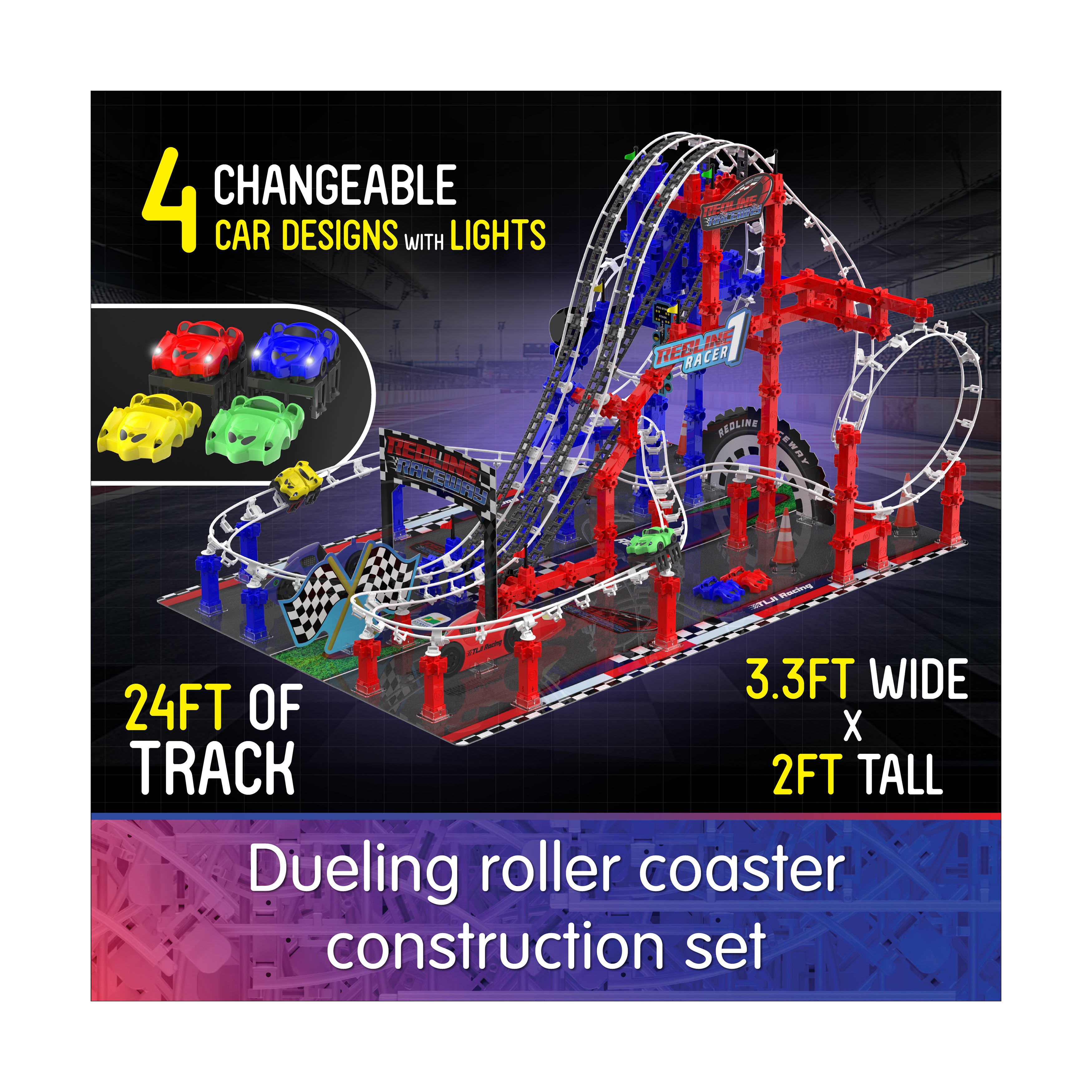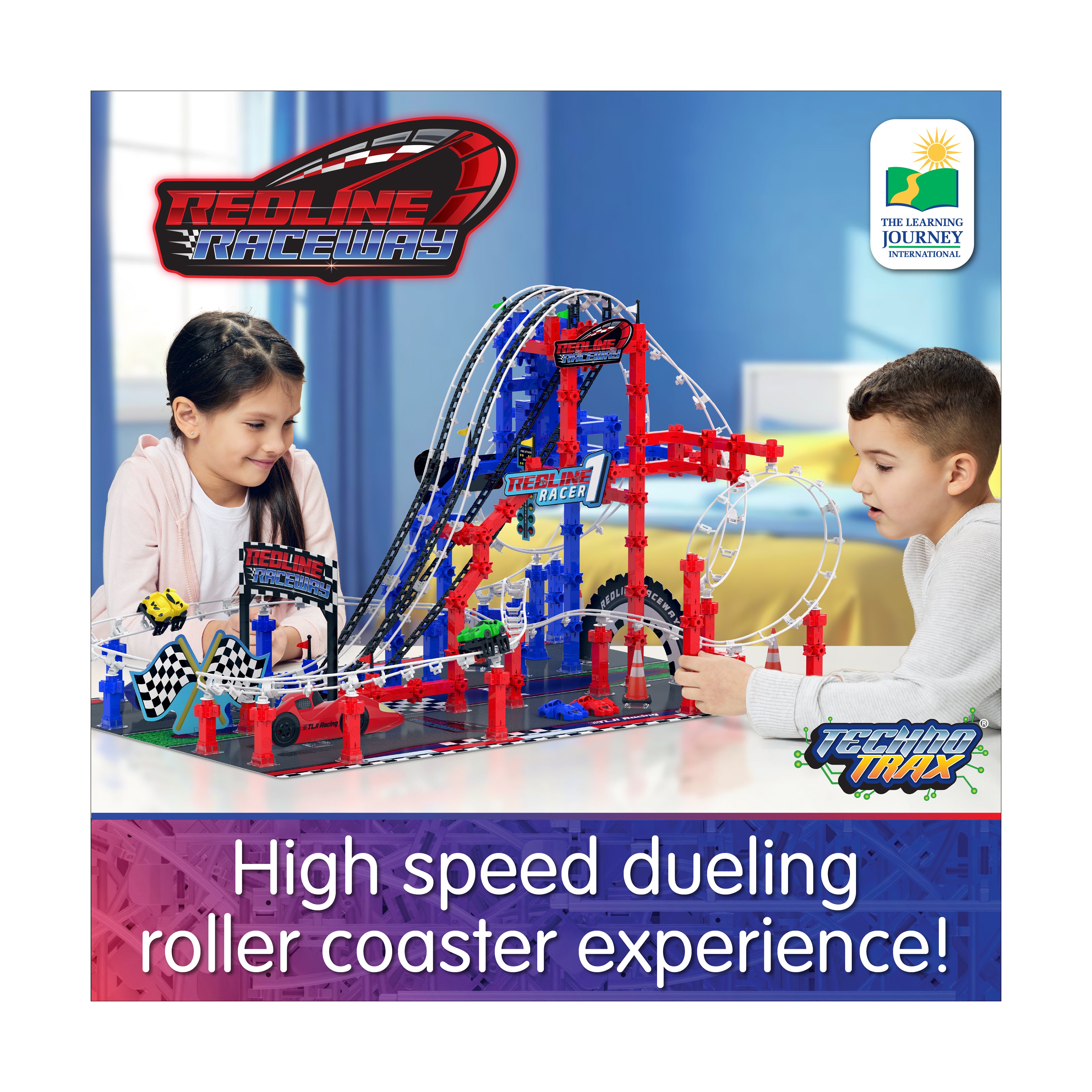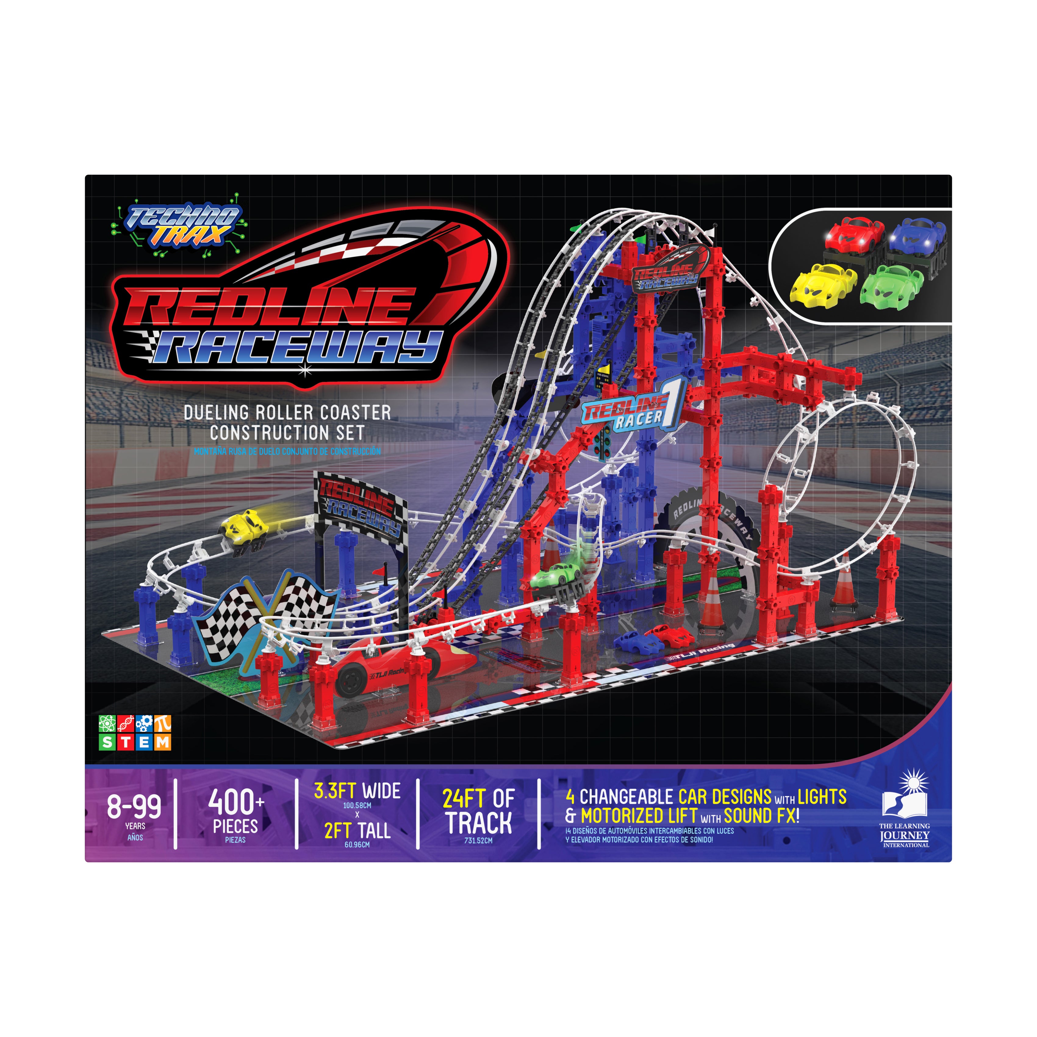 Experience the thrill of racing with Techno Trax Redline Raceway! Designed like a real dueling roller coaster, this electrifying construction set lets two race cars speed through drops, twists, and turns to see who reaches the top first! The motorized chain lift automatically returns the cars to the start for nonstop racing excitement. Each car features working LED headlights and realistic racing sounds built right into the motorized chain system, bringing the track to life with light and motion!