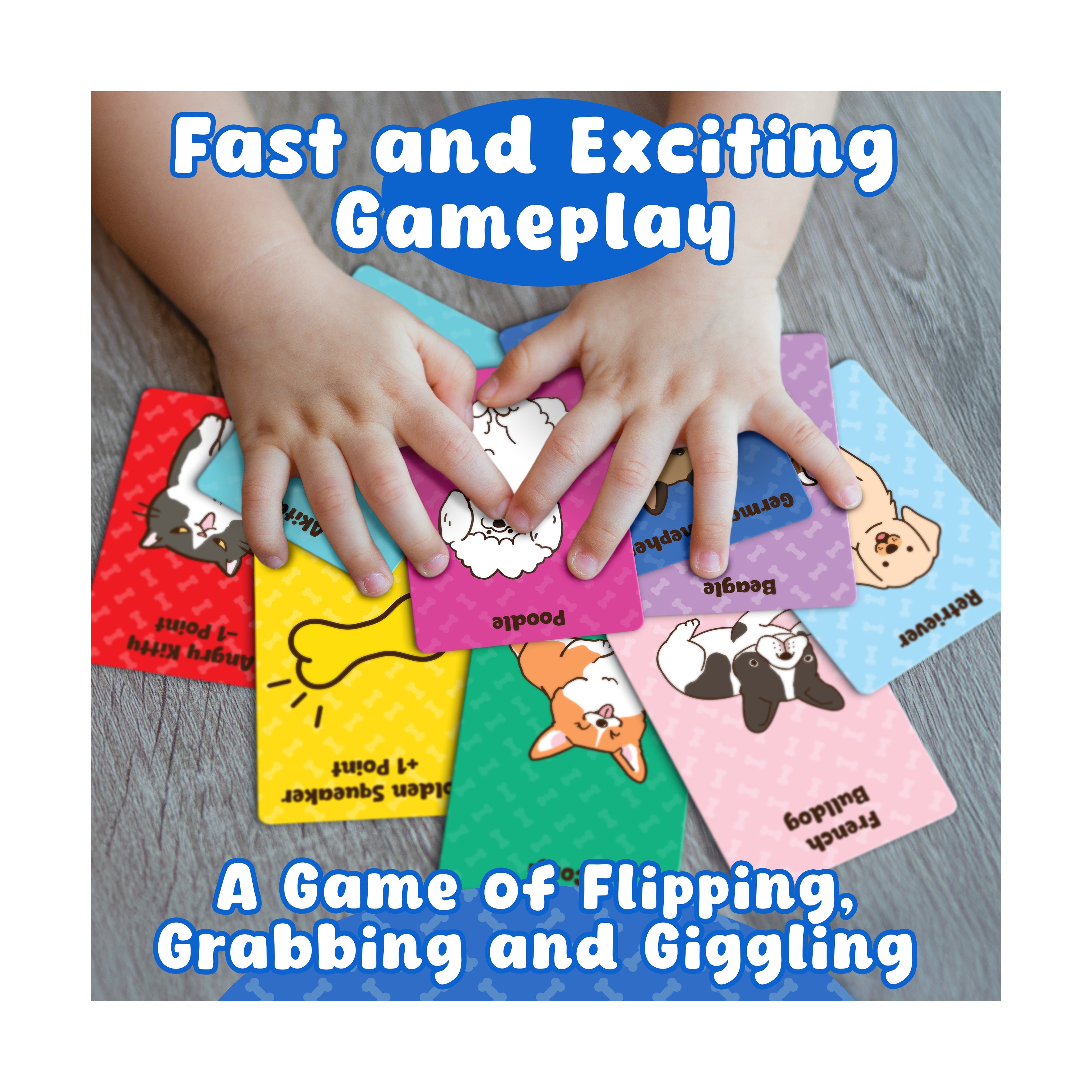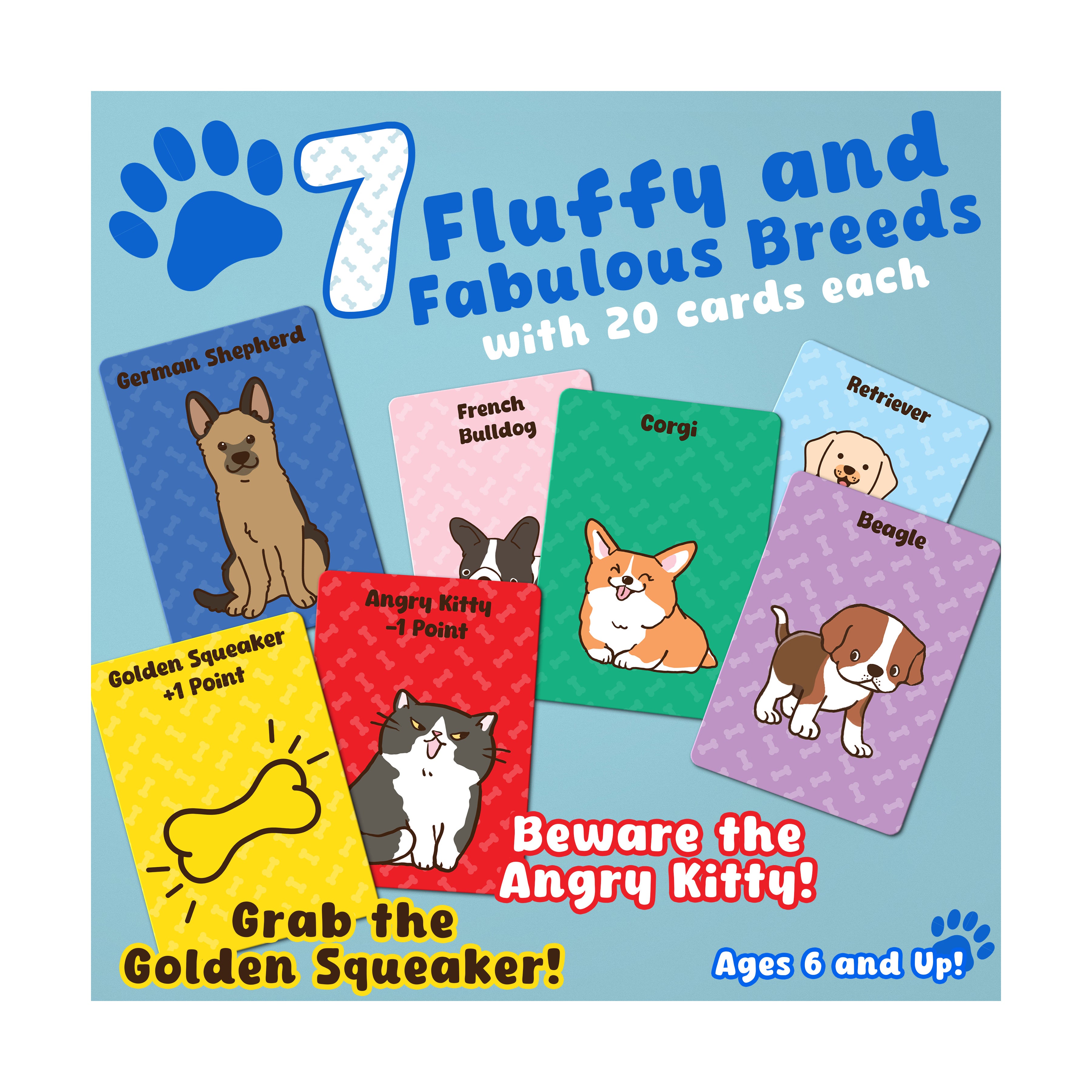 In Puppy Pile, the goal is to collect the most adorable pups of one breed to win! Each pup collected earns you 1 point, and squeaky toy cards earn players an extra point. But beware - grumpy kitties are lurking, and they will claw away 1 point from your puppy pile score. The game is played in three fun-filled rounds, where everyone races to build their ultimate puppy pile by grabbing the fluffiest, furriest friends as fast as they can. Quick hands, squeaky toys, and adorable pups make this the perfect game for children and families.