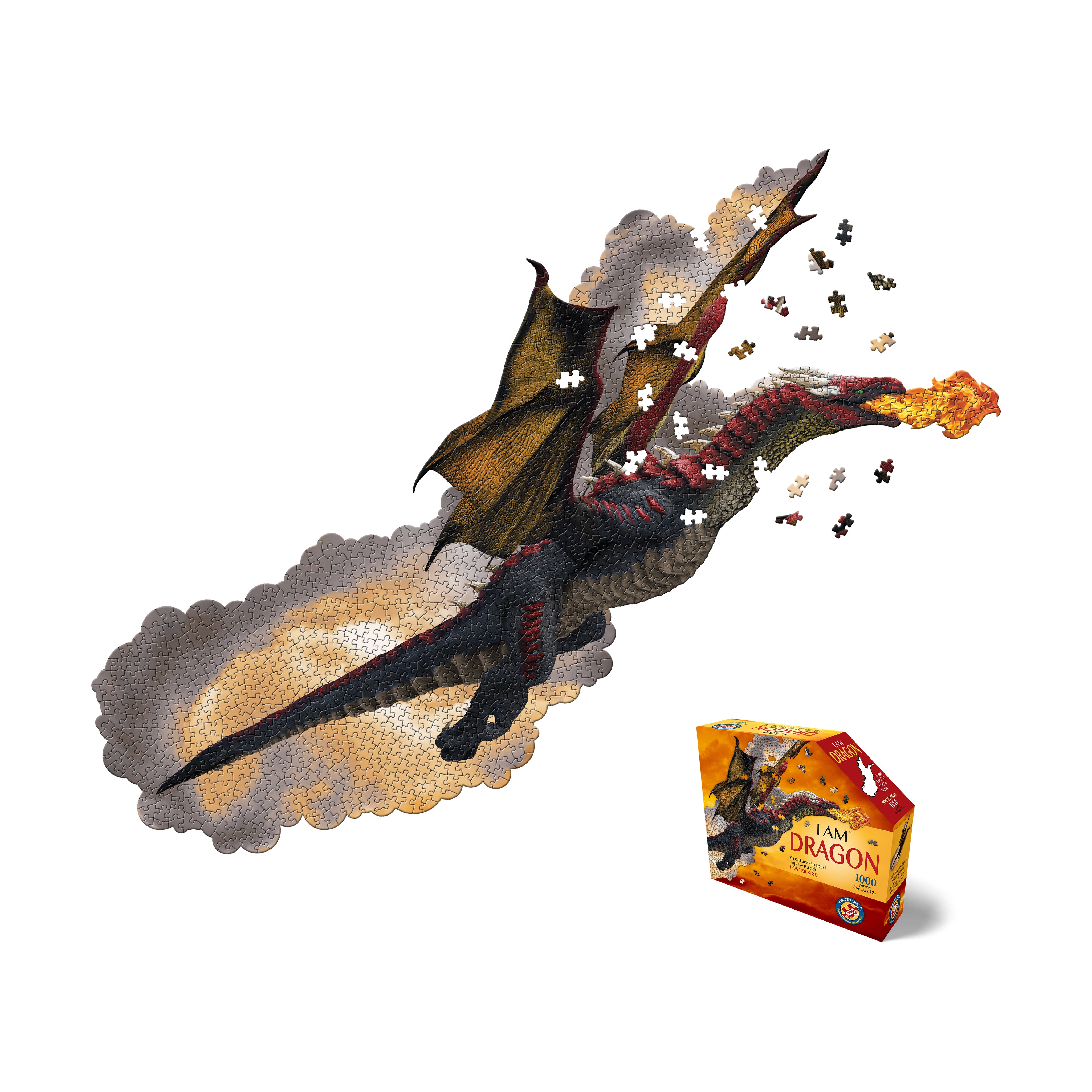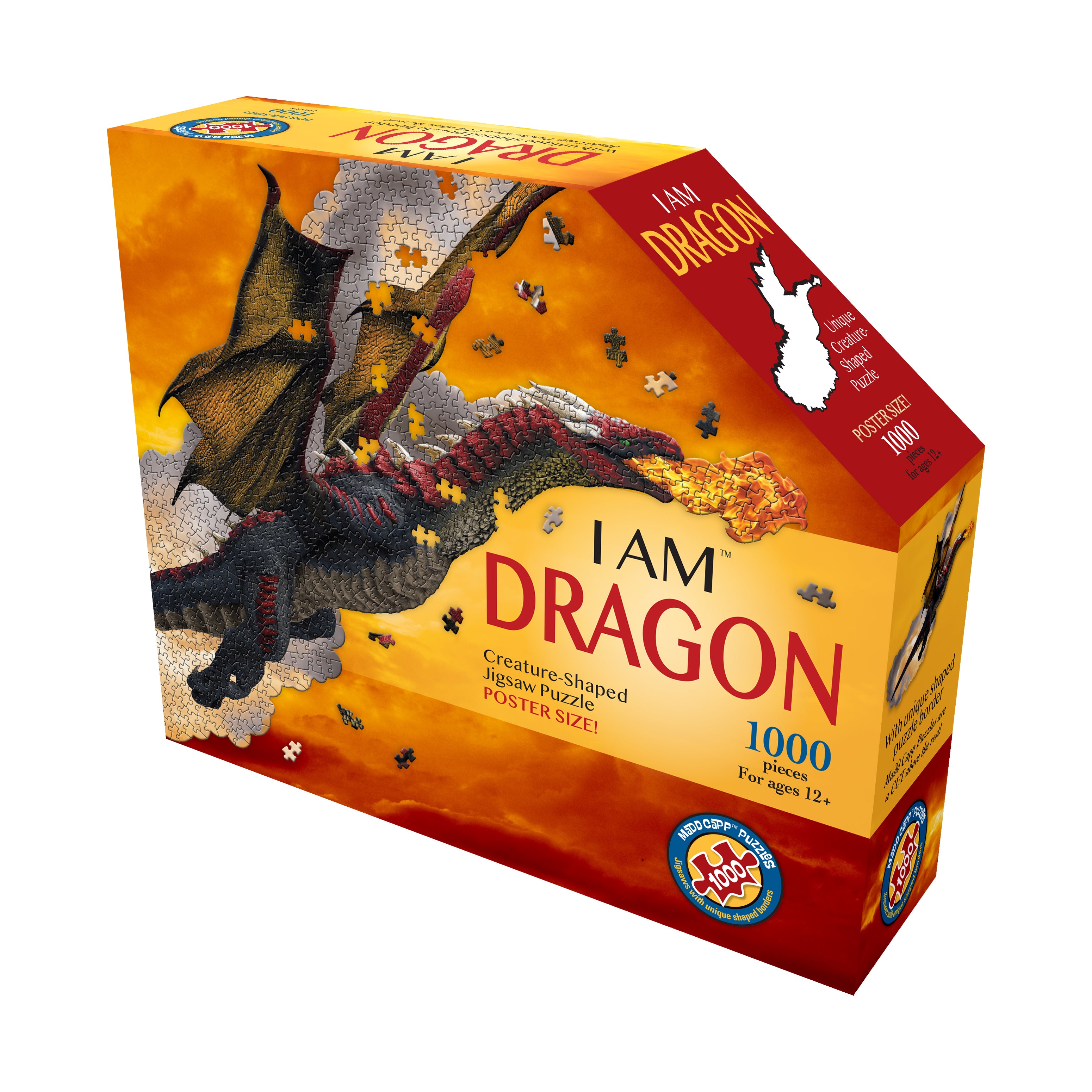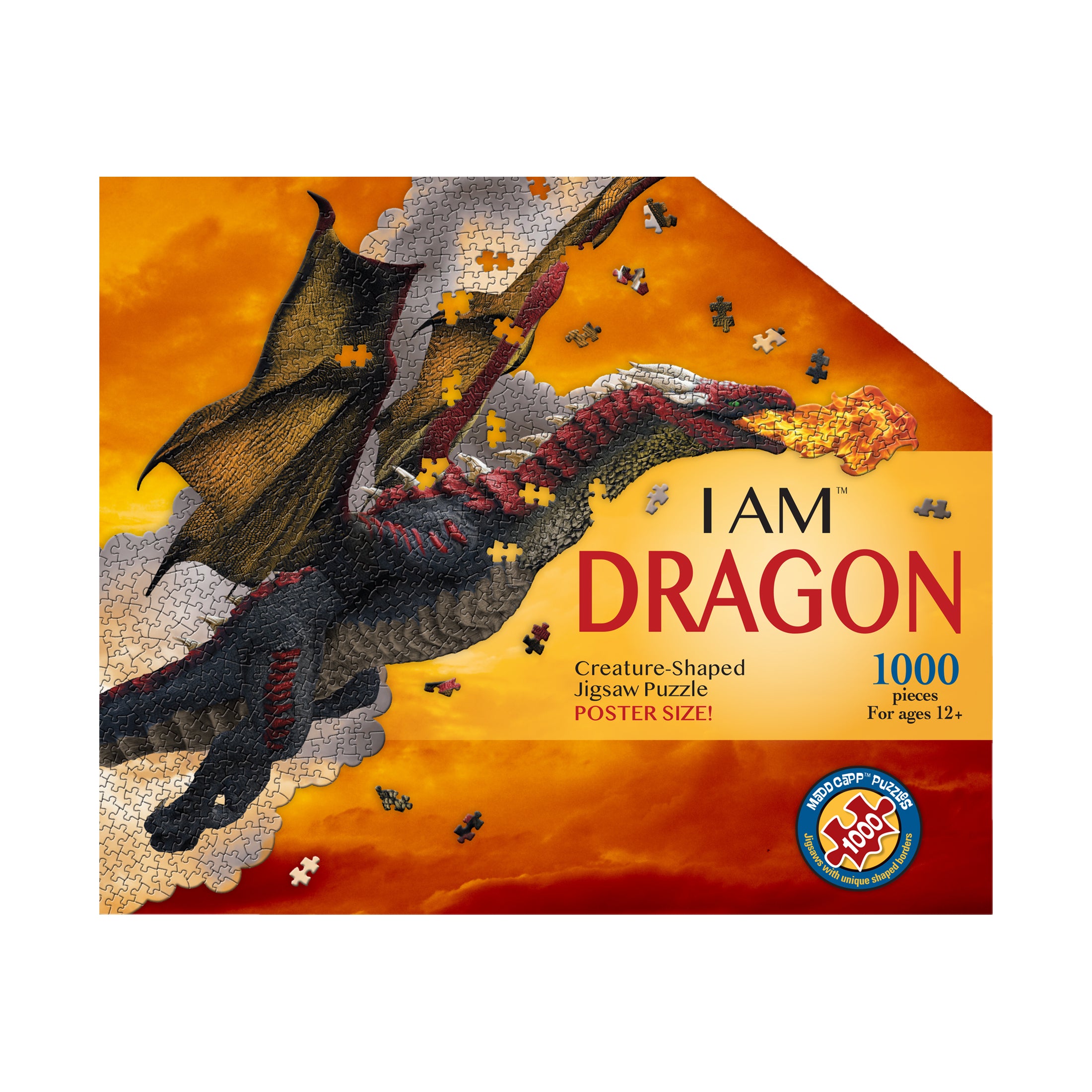 Embrace the myth with I Am Dragon, a unique dragon-shaped 1000-piece jigsaw puzzle designed for ages 12 and up. Measuring 41 x 20 inches, this poster-size puzzle features a semi-gloss, photo-realistic image capturing the strength and majesty of the legendary dragon. Crafted from premium recycled chipboard, the thick, sturdy, dust-free pieces come fully separated and hold up to repeated use. With no square corners or straight edges, the puzzle provides a challenging and rewarding experience for enthusiasts.