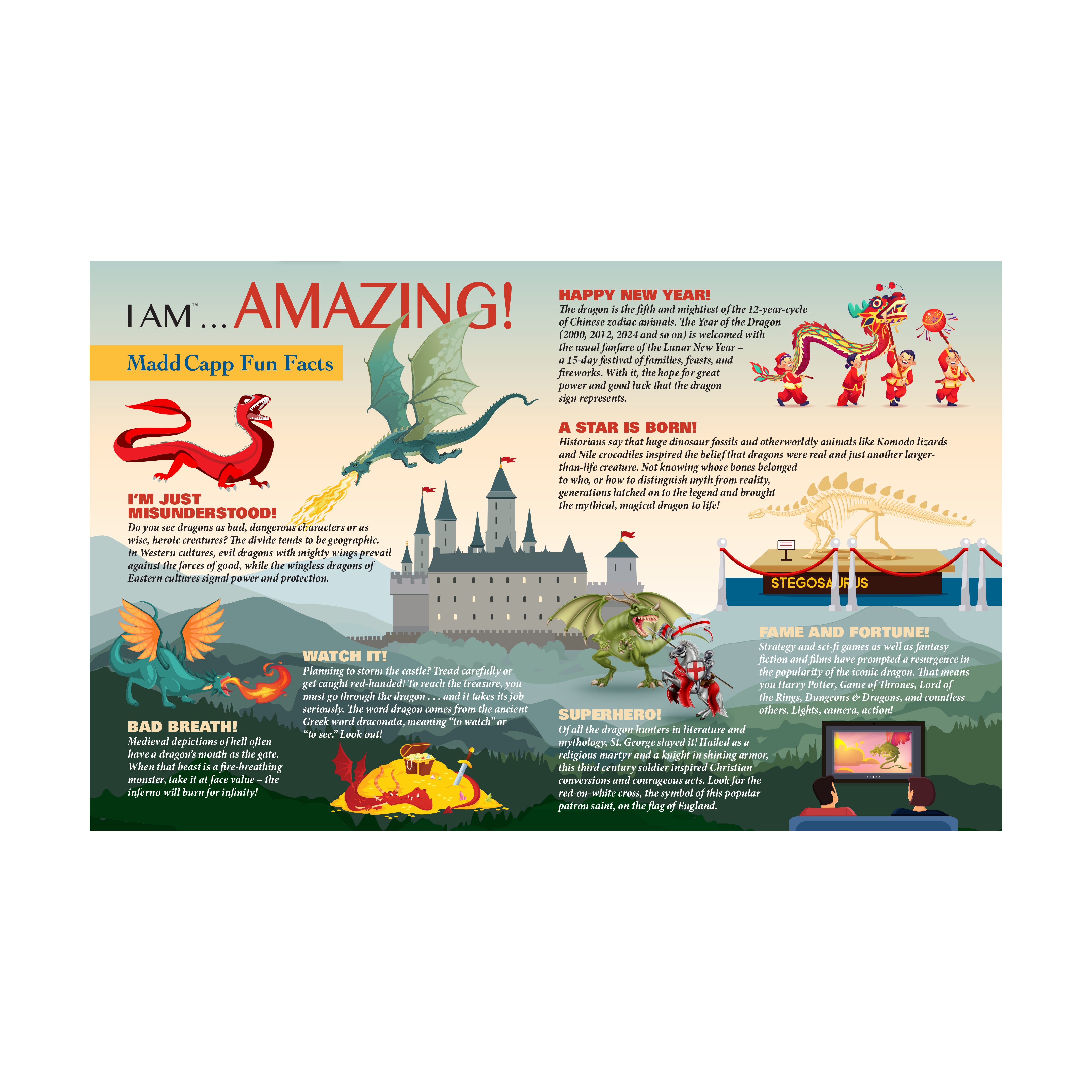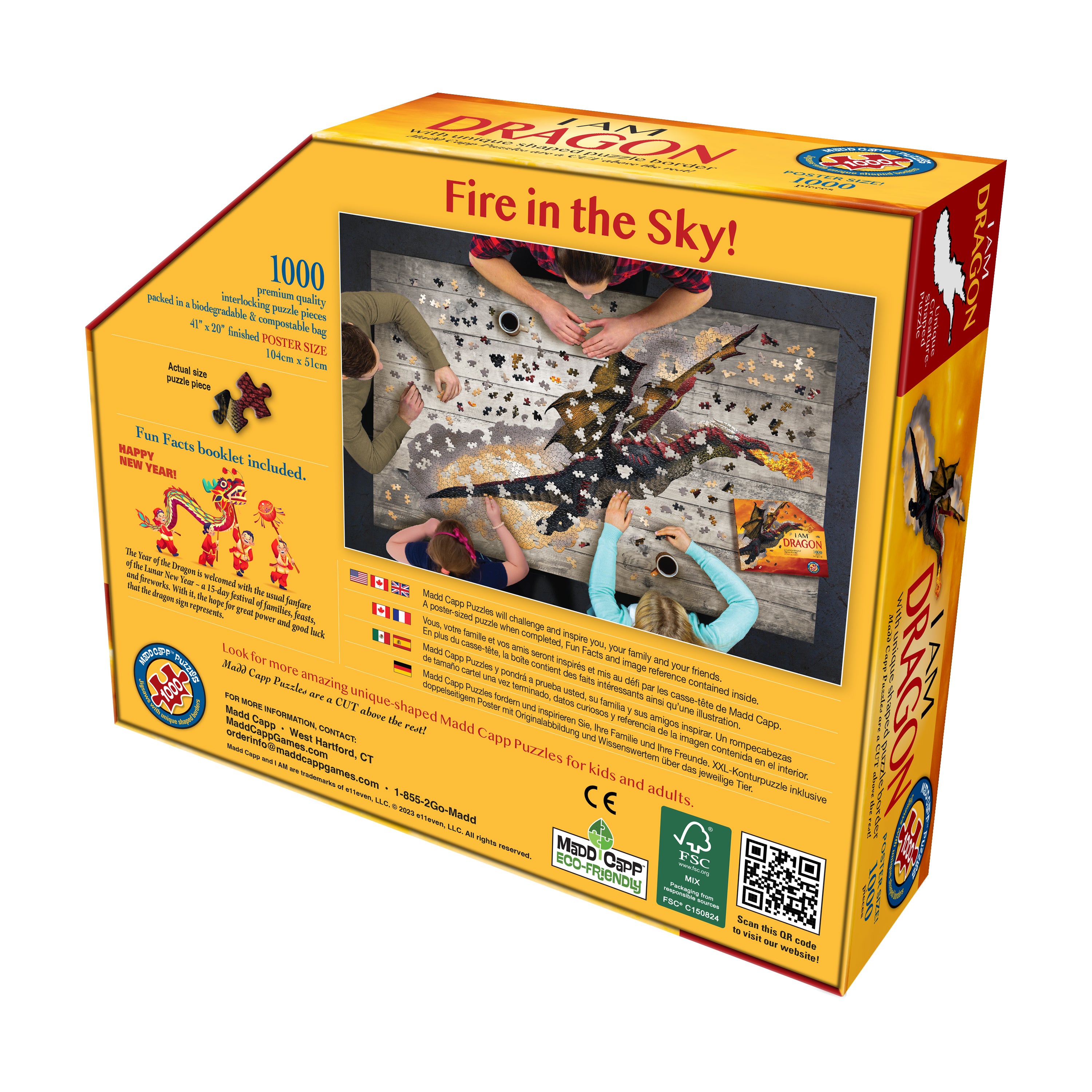 The puzzle includes a fold-out poster and Madd Capp Fun Facts booklet. On one side, the poster can be displayed or used as a reference while puzzling. On the flip side, discover fascinating dragon facts - did you know that the Year of the Dragon is celebrated with a 15-day Lunar New Year festival of family, feasts, and fireworks, symbolizing great power and good luck?