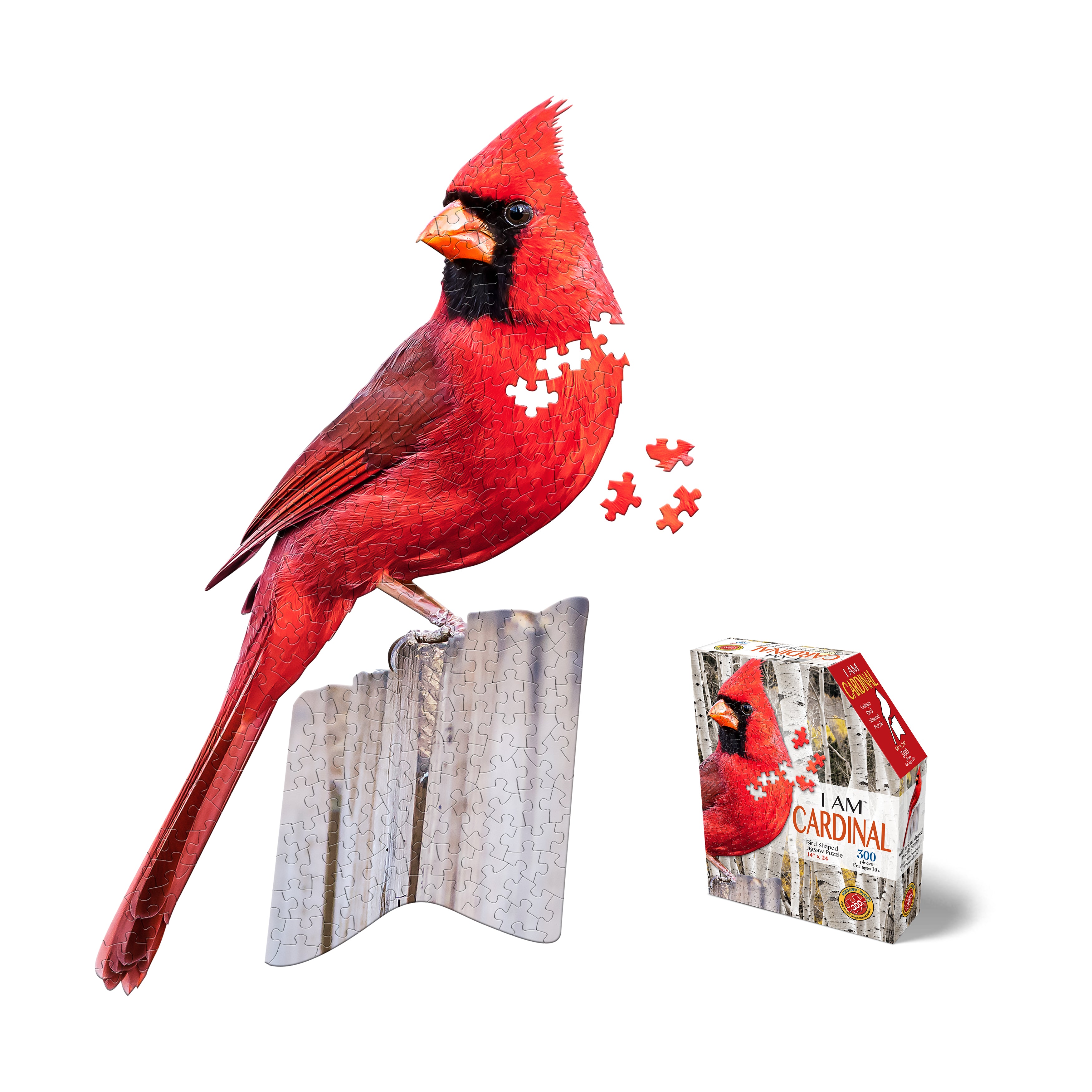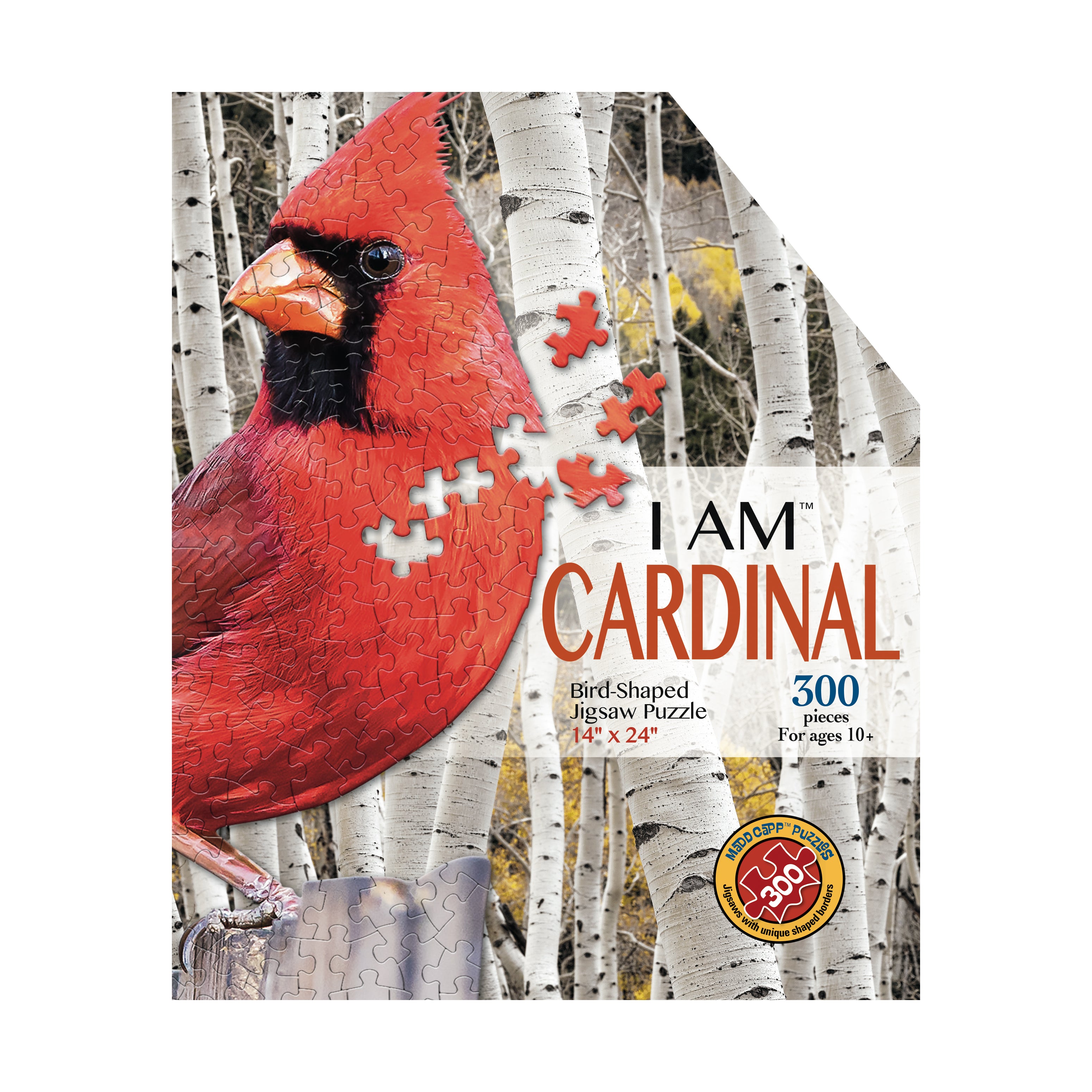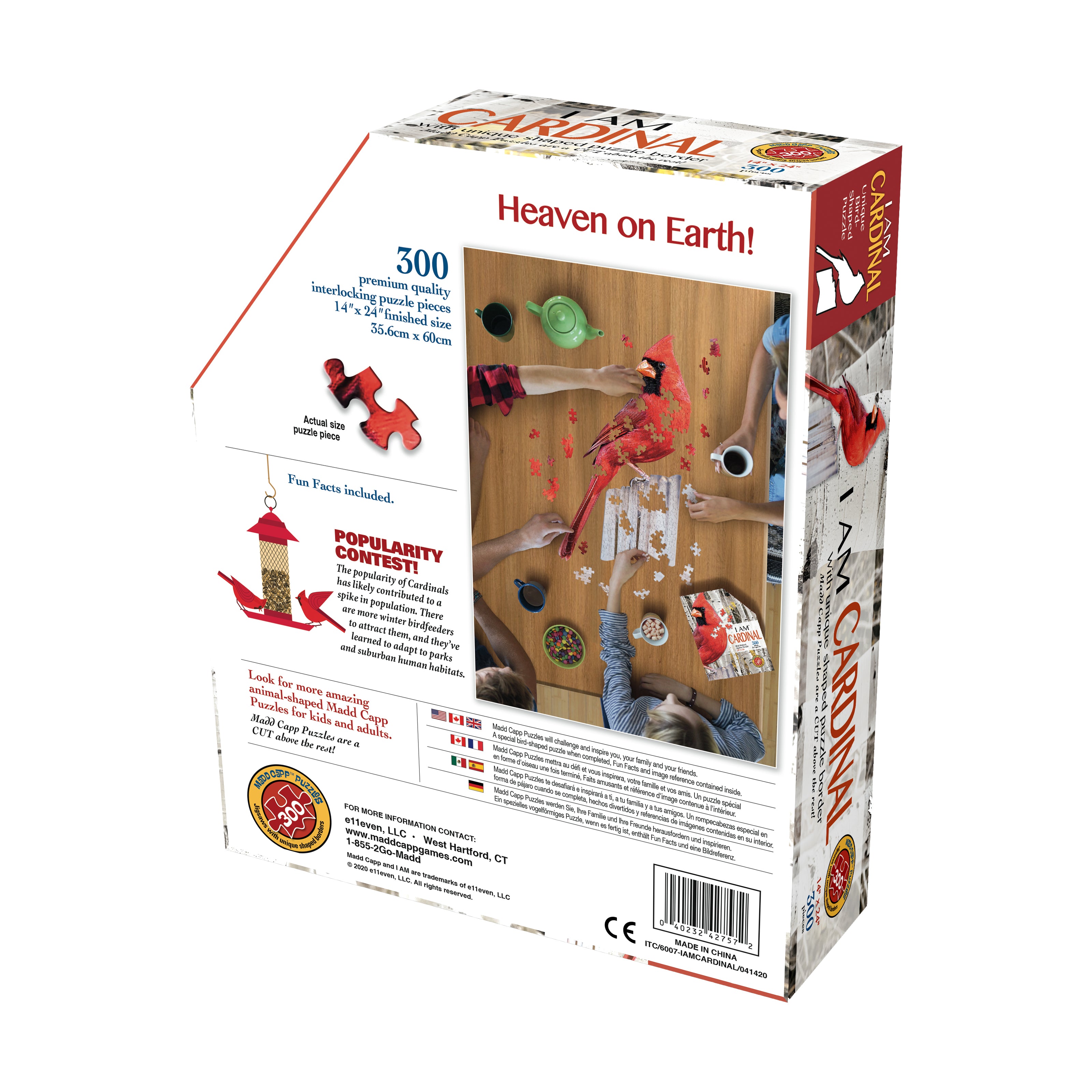 Heaven on Earth! I Am Cardinal is a unique bird-shaped jigsaw puzzle with 300 interlocking pieces, designed for ages 10 and up. Its semi-gloss, photo-realistic image captures the brilliant beauty of the Northern Cardinal. Crafted from premium recycled chipboard, the thick, sturdy, dust-free pieces fit snugly and hold up to repeated use. The finished size measures approximately 14 x 24 inches, perfect for most tabletops and tray tables. With no square corners and no straight edges, this puzzle adds just the right amount of extra challenge for hours of fun.