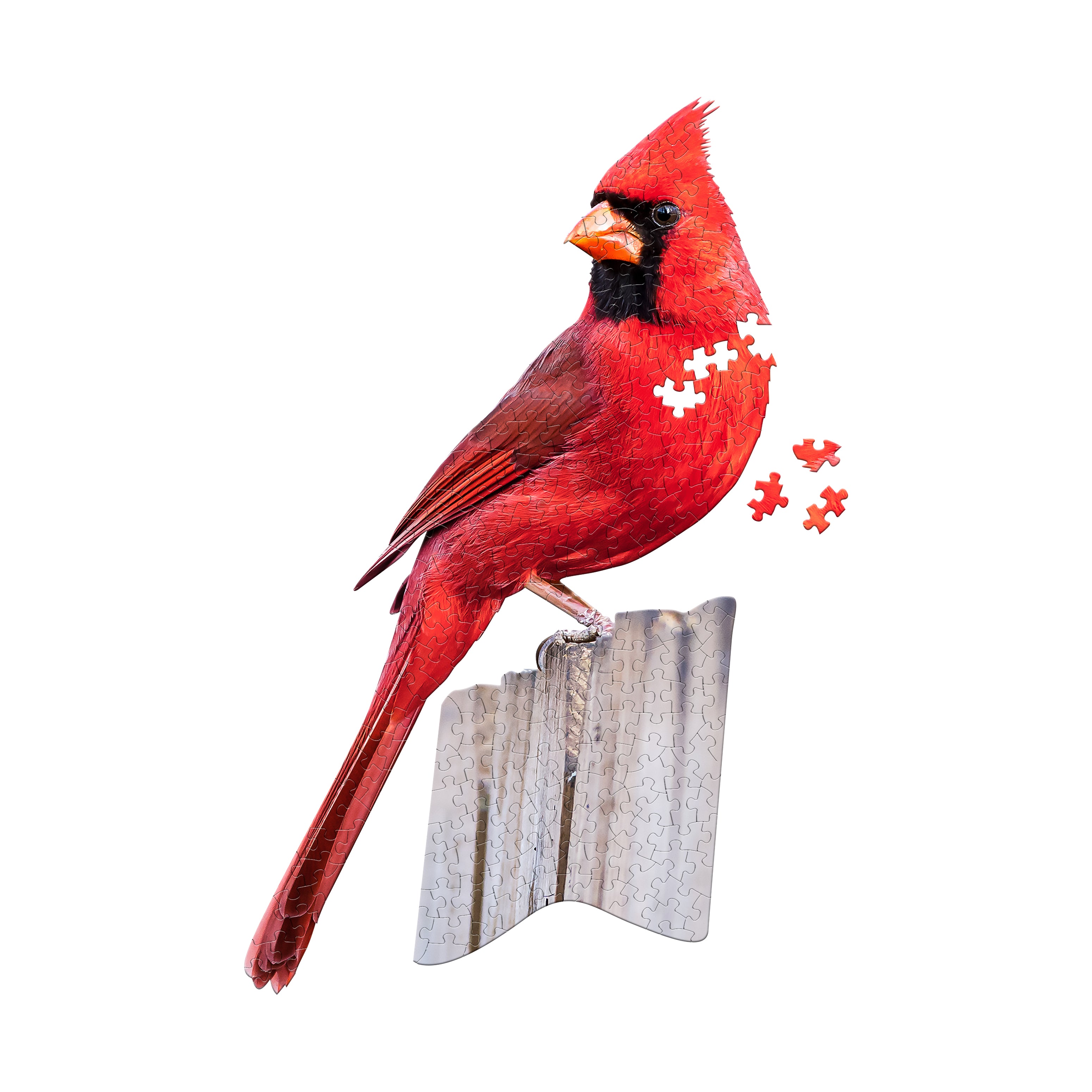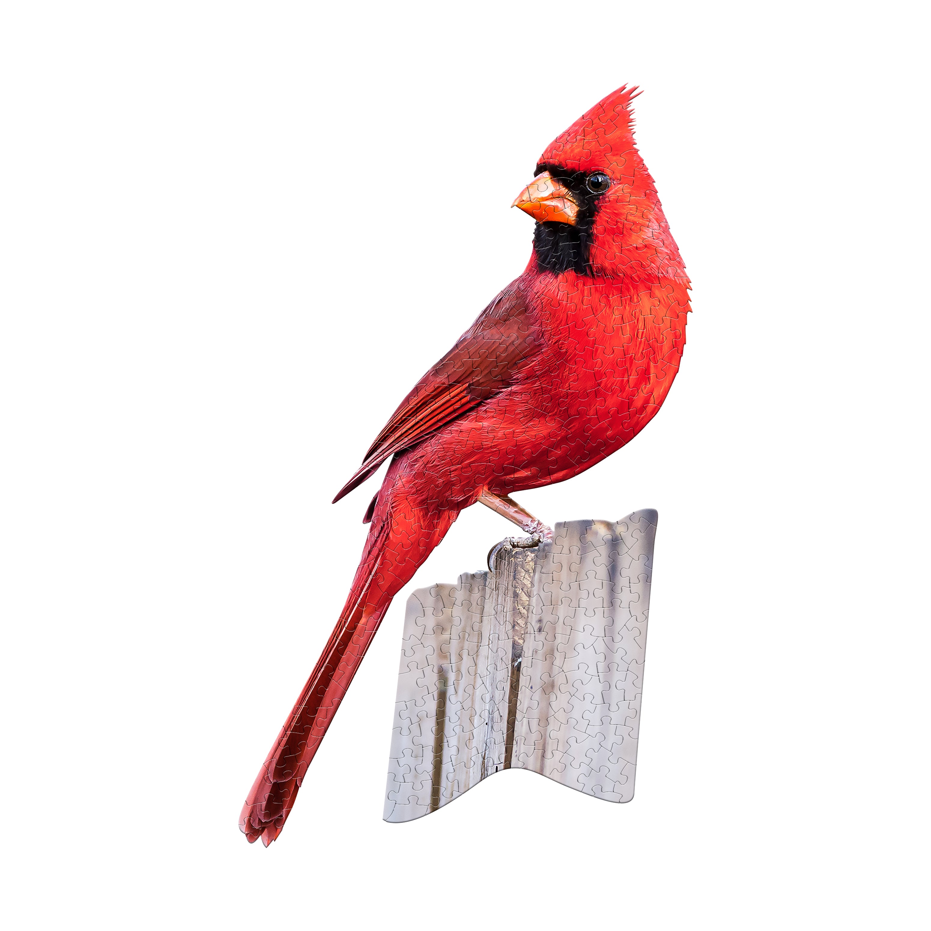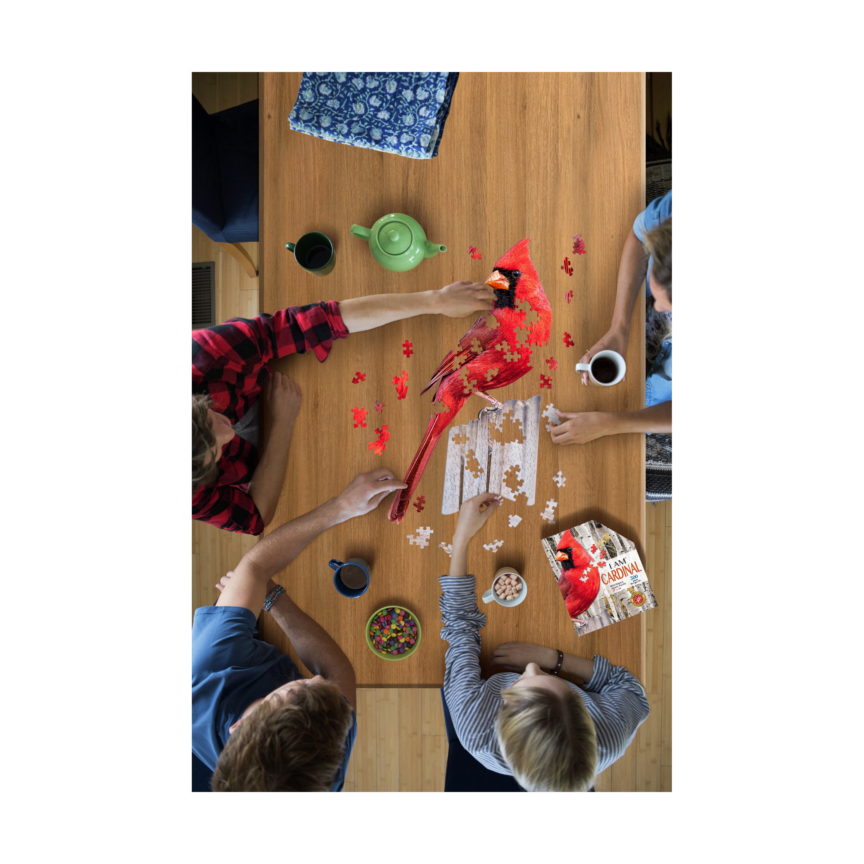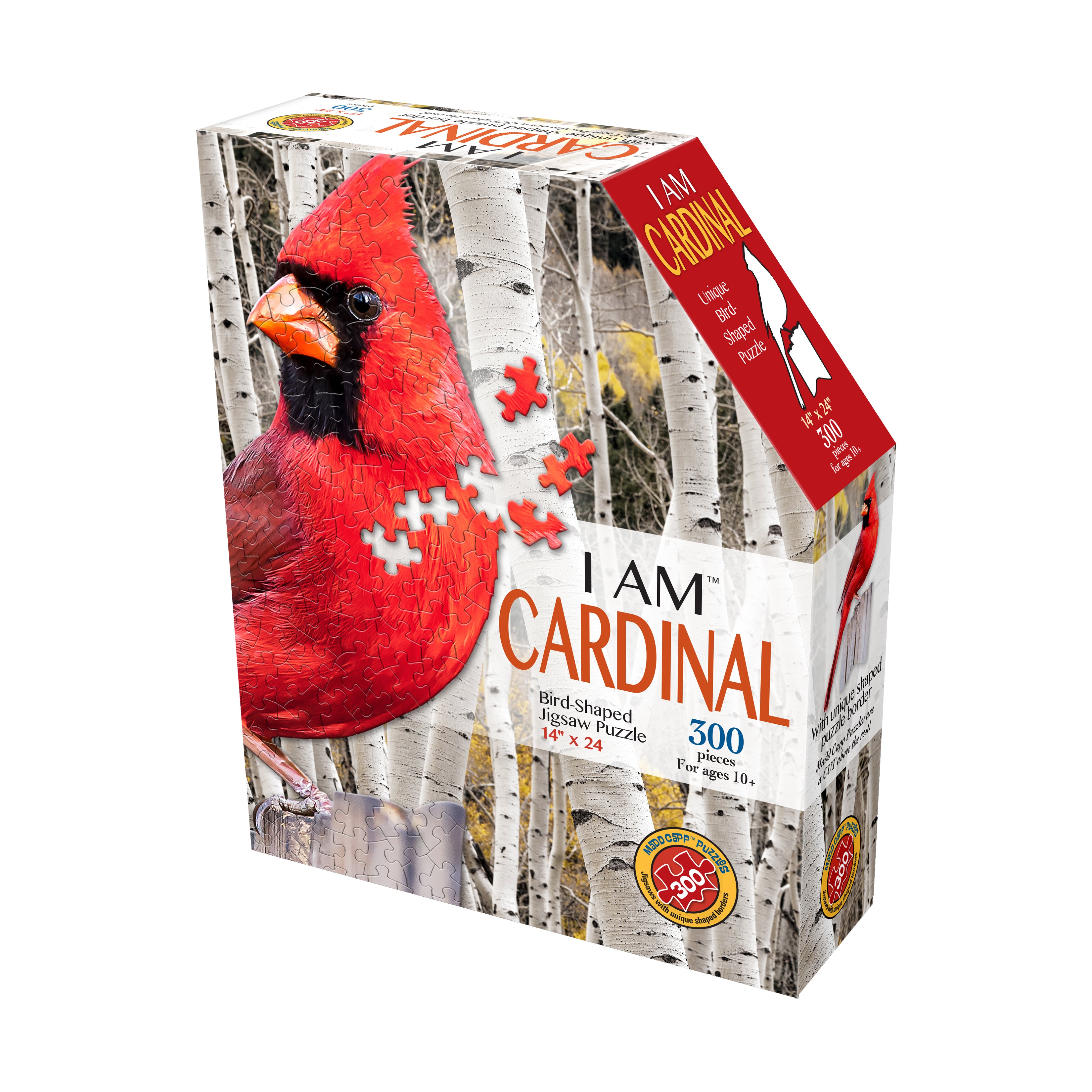 Heaven on Earth! I Am Cardinal is a unique bird-shaped jigsaw puzzle with 300 interlocking pieces, designed for ages 10 and up. Its semi-gloss, photo-realistic image captures the brilliant beauty of the Northern Cardinal. Crafted from premium recycled chipboard, the thick, sturdy, dust-free pieces fit snugly and hold up to repeated use. The finished size measures approximately 14 x 24 inches, perfect for most tabletops and tray tables. With no square corners and no straight edges, this puzzle adds just the right amount of extra challenge for hours of fun.