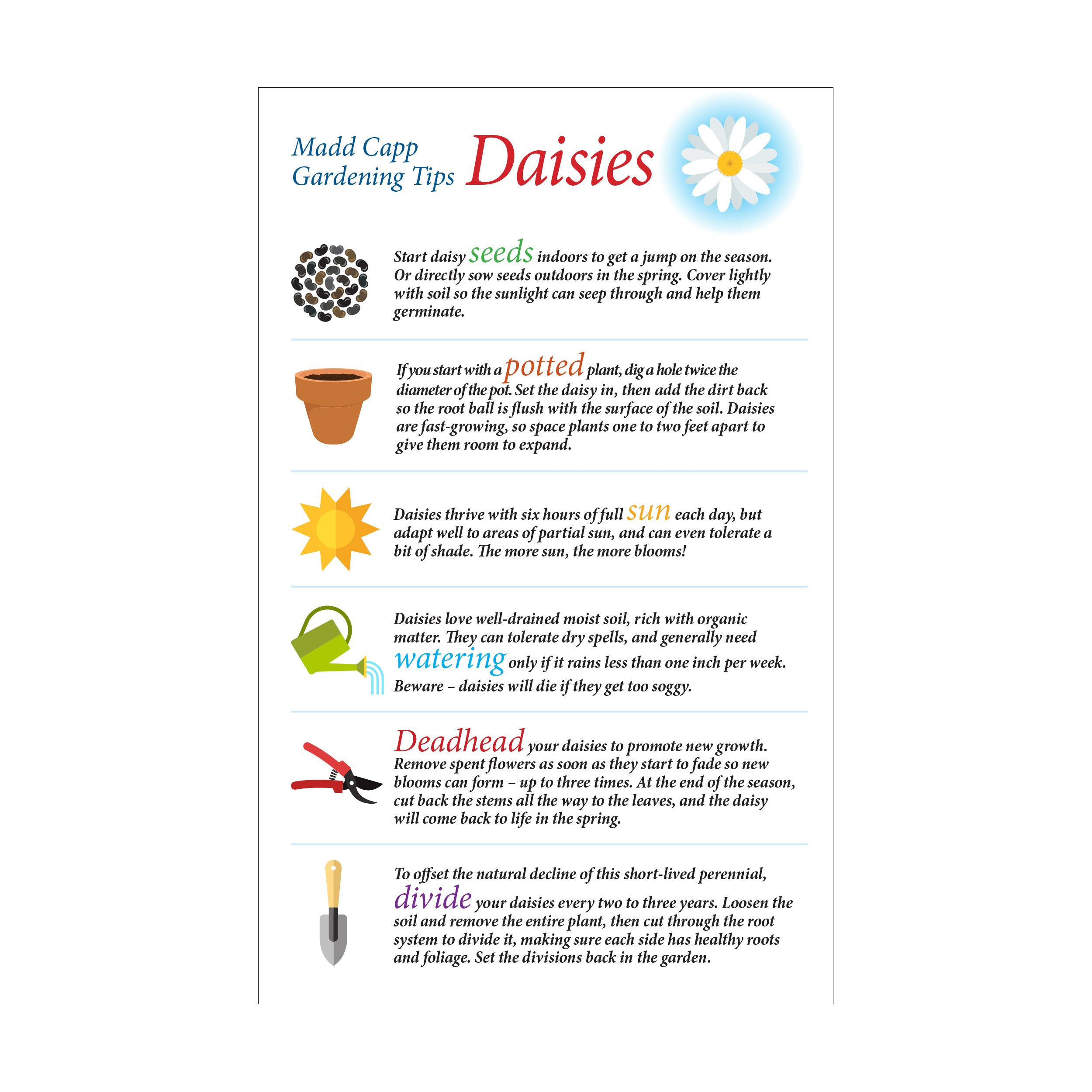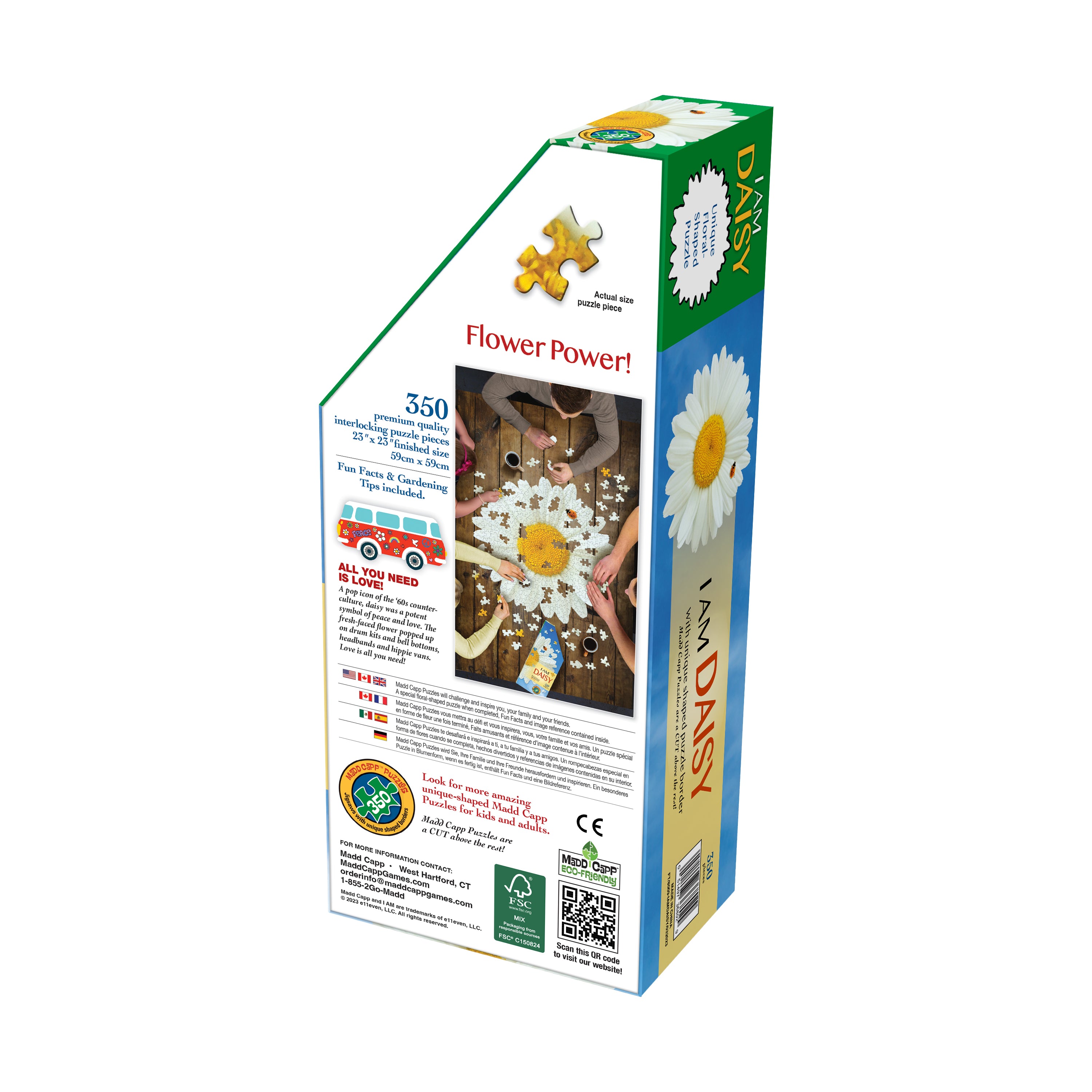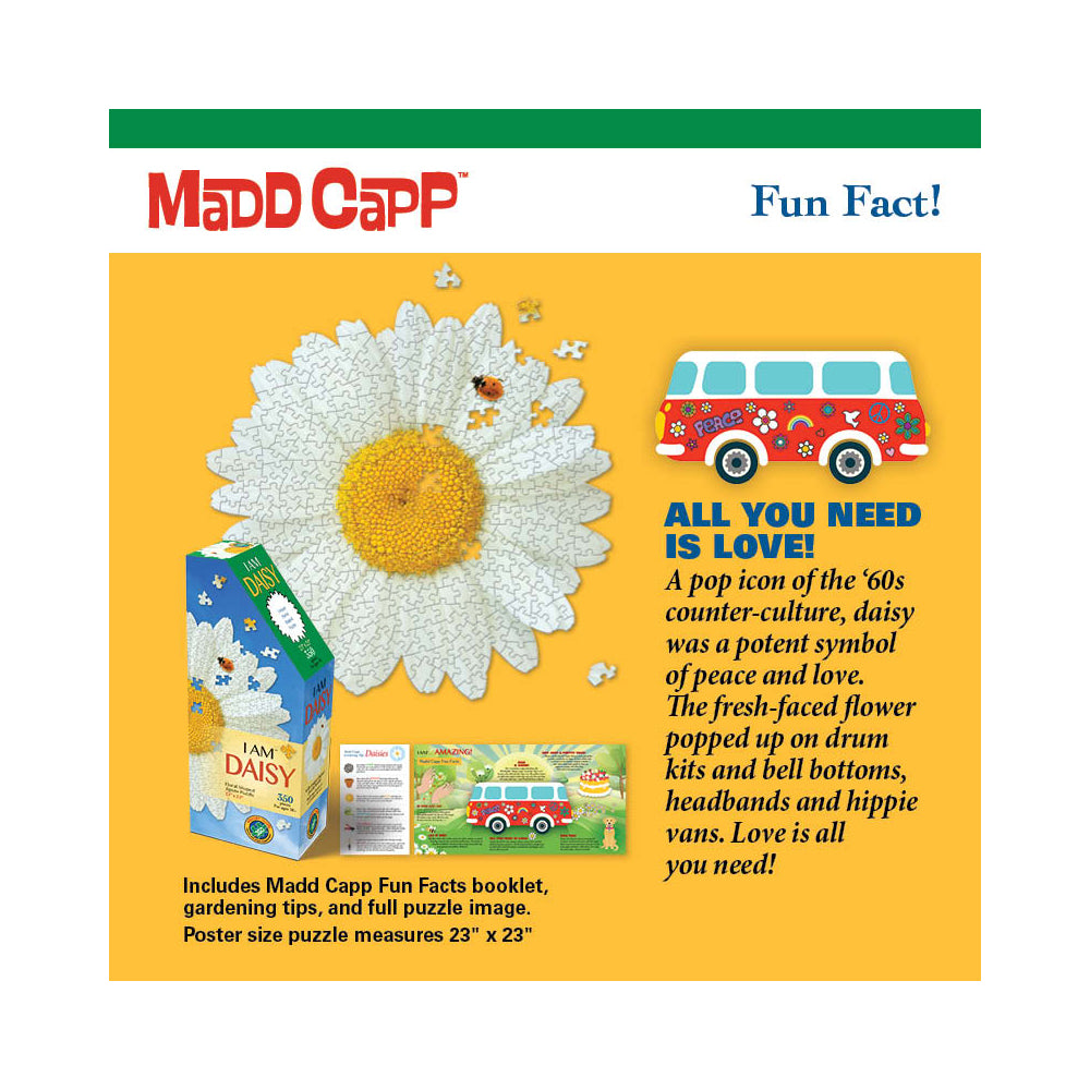 Each puzzle includes a Madd Capp Fun Facts booklet, full of daisy trivia and six gardening tips. One side folds out into a full puzzle poster for reference or display, while the other contains educational and entertaining facts. Did you know daisies were a pop icon of the 1960s counterculture? Or that dividing daisies every 2-3 years helps offset the natural decline of this short-lived perennial?