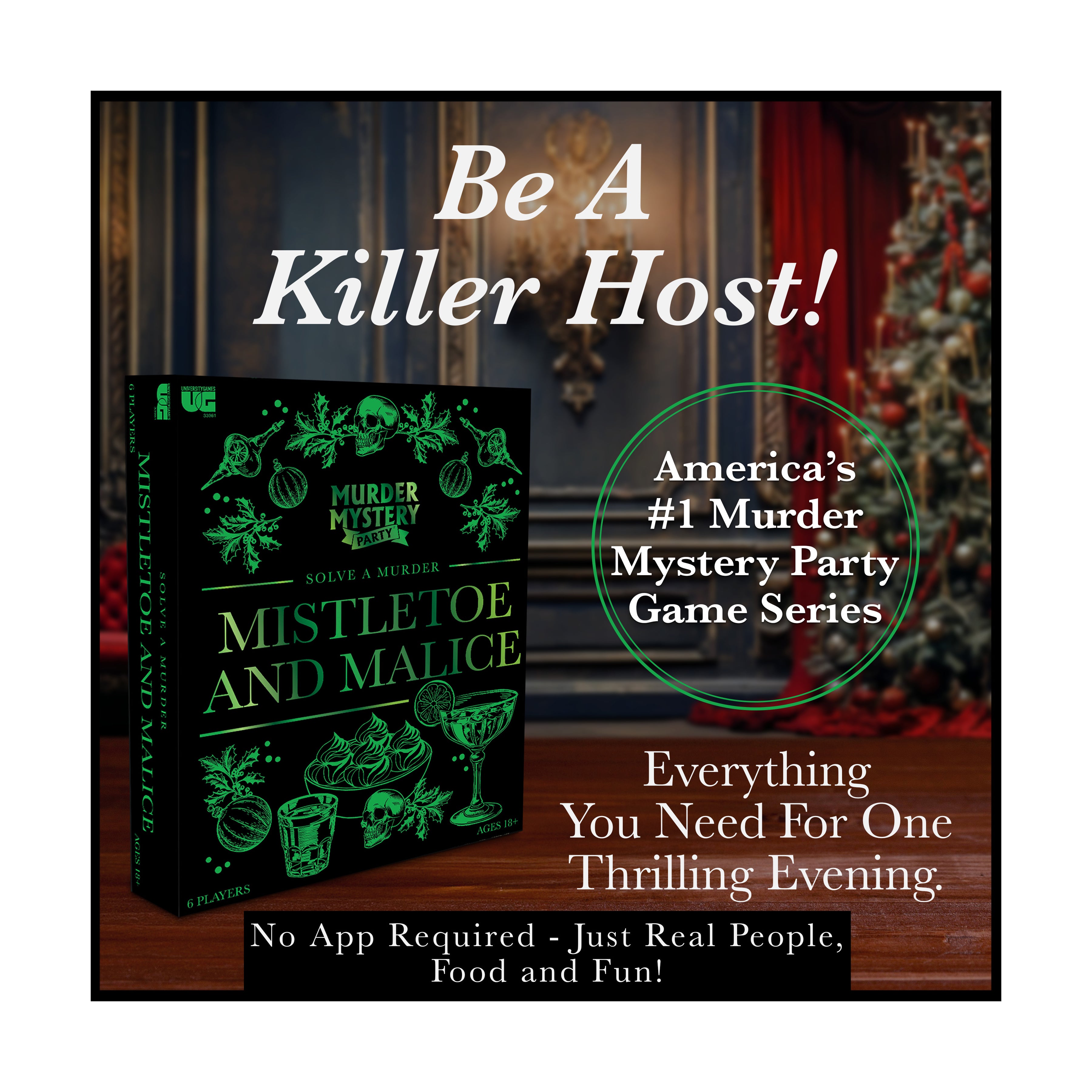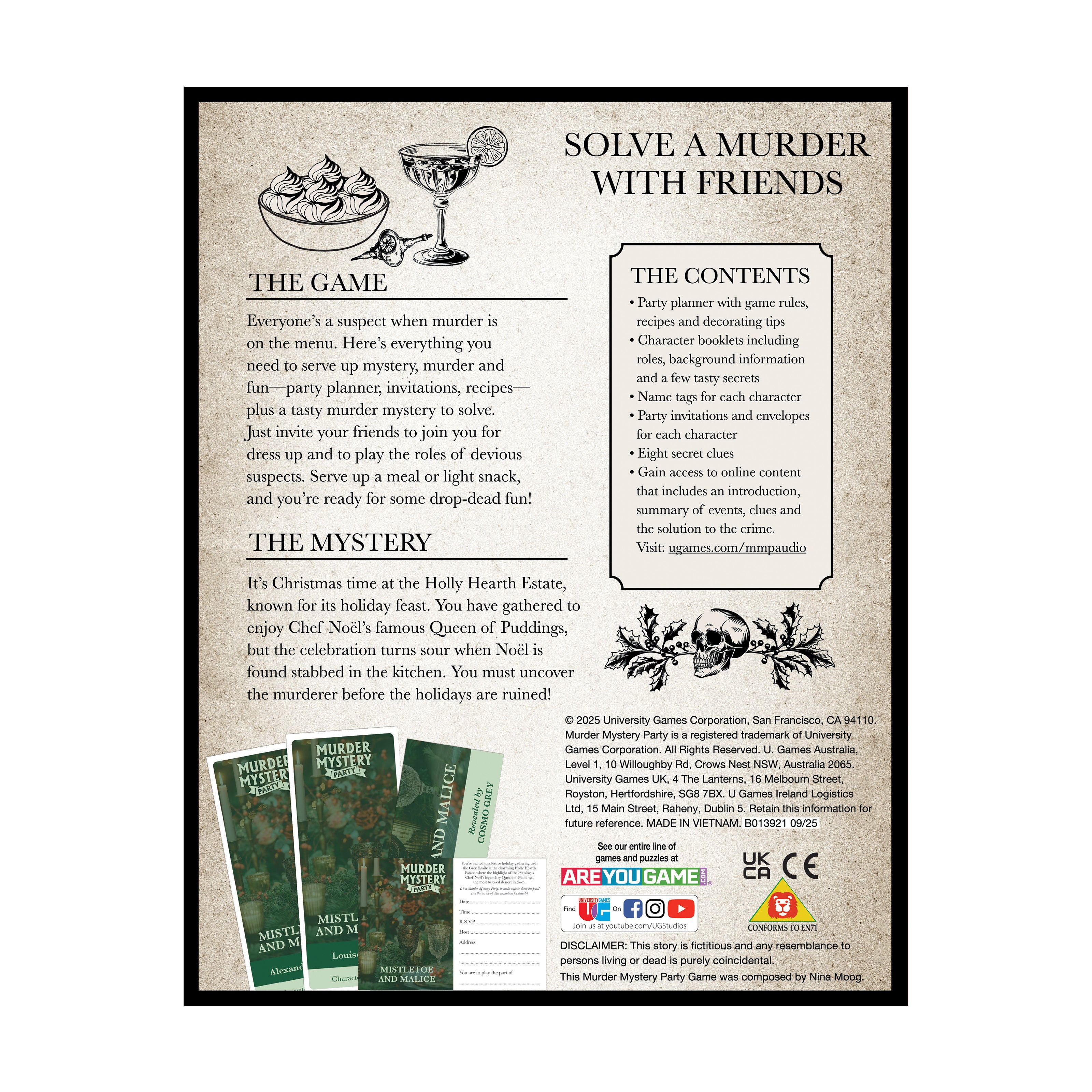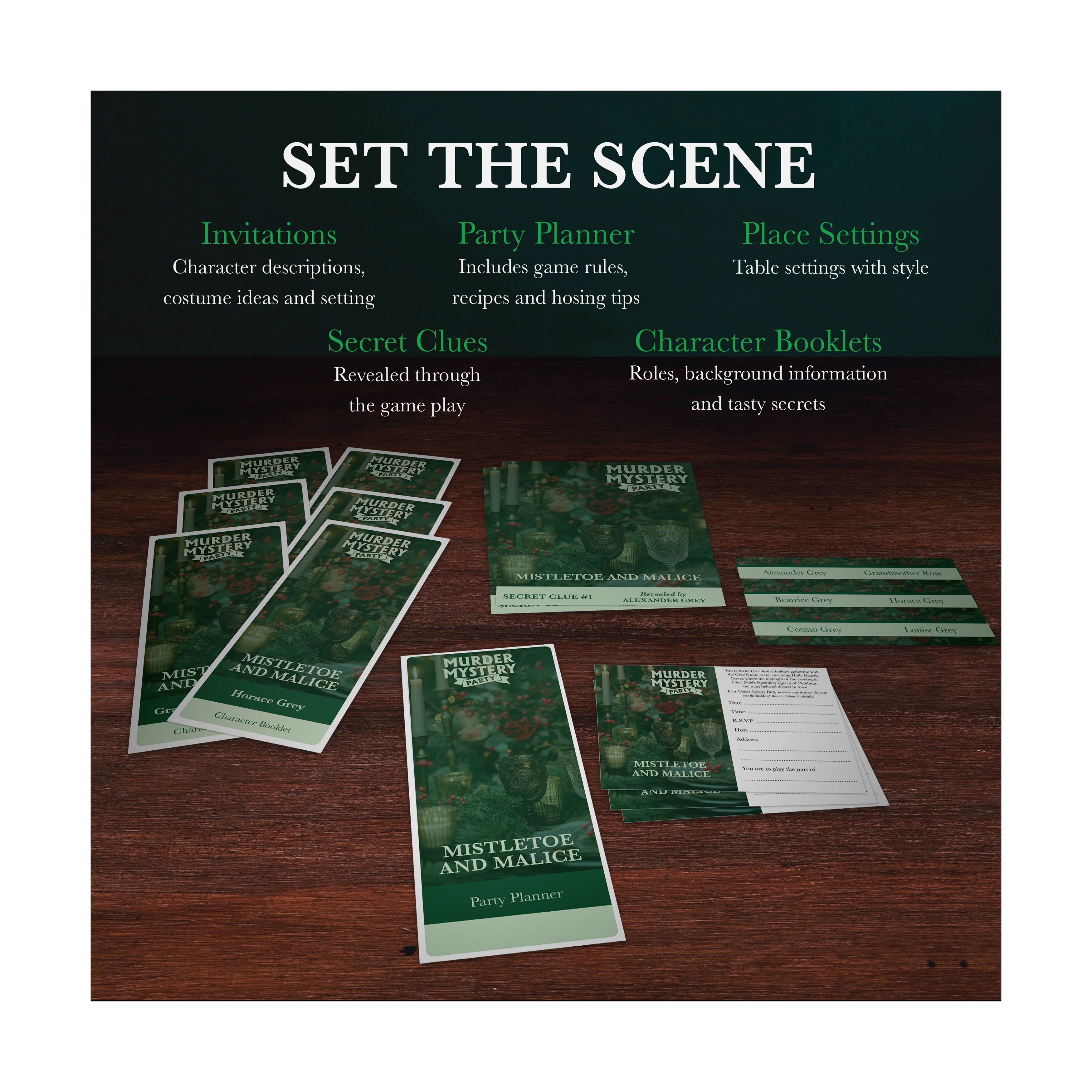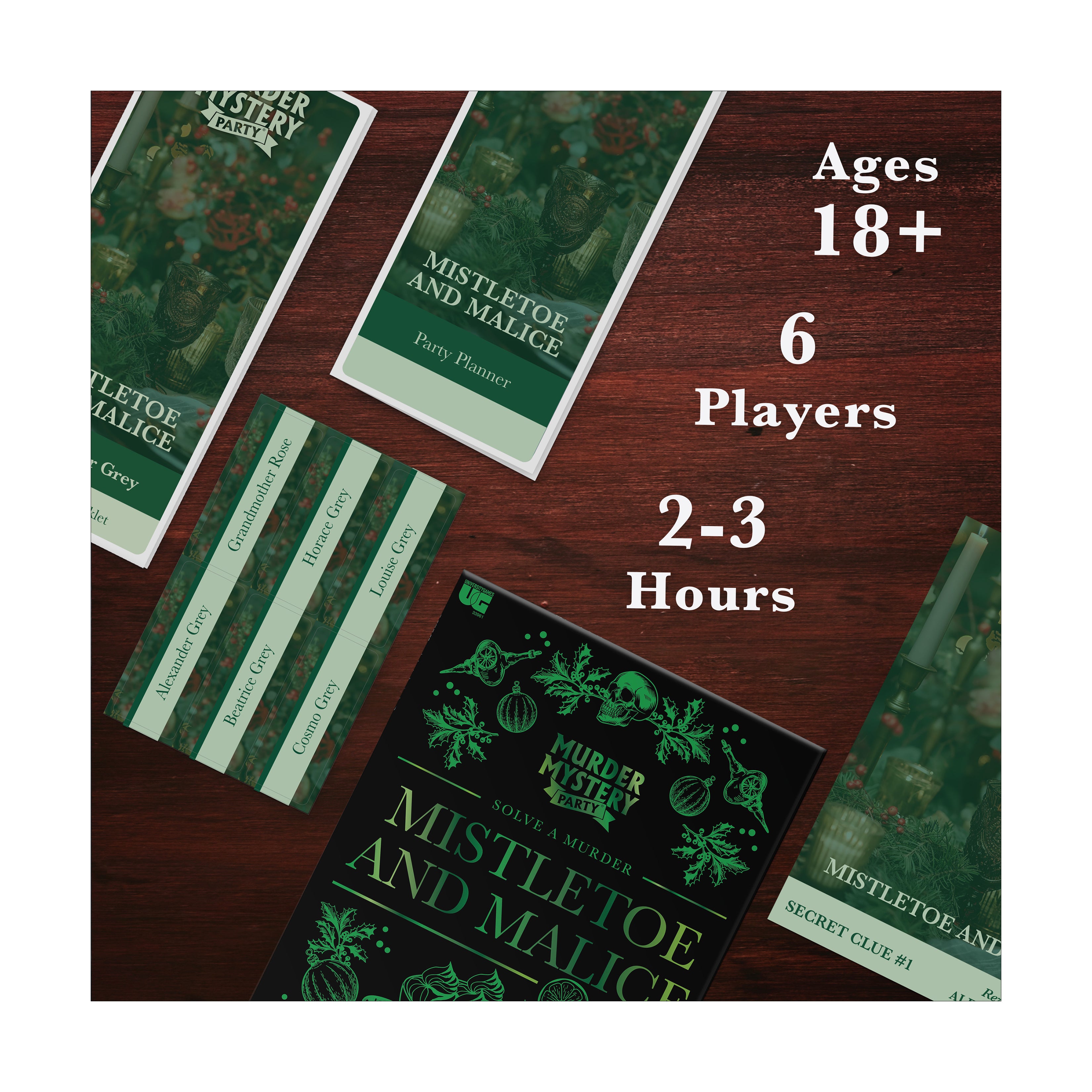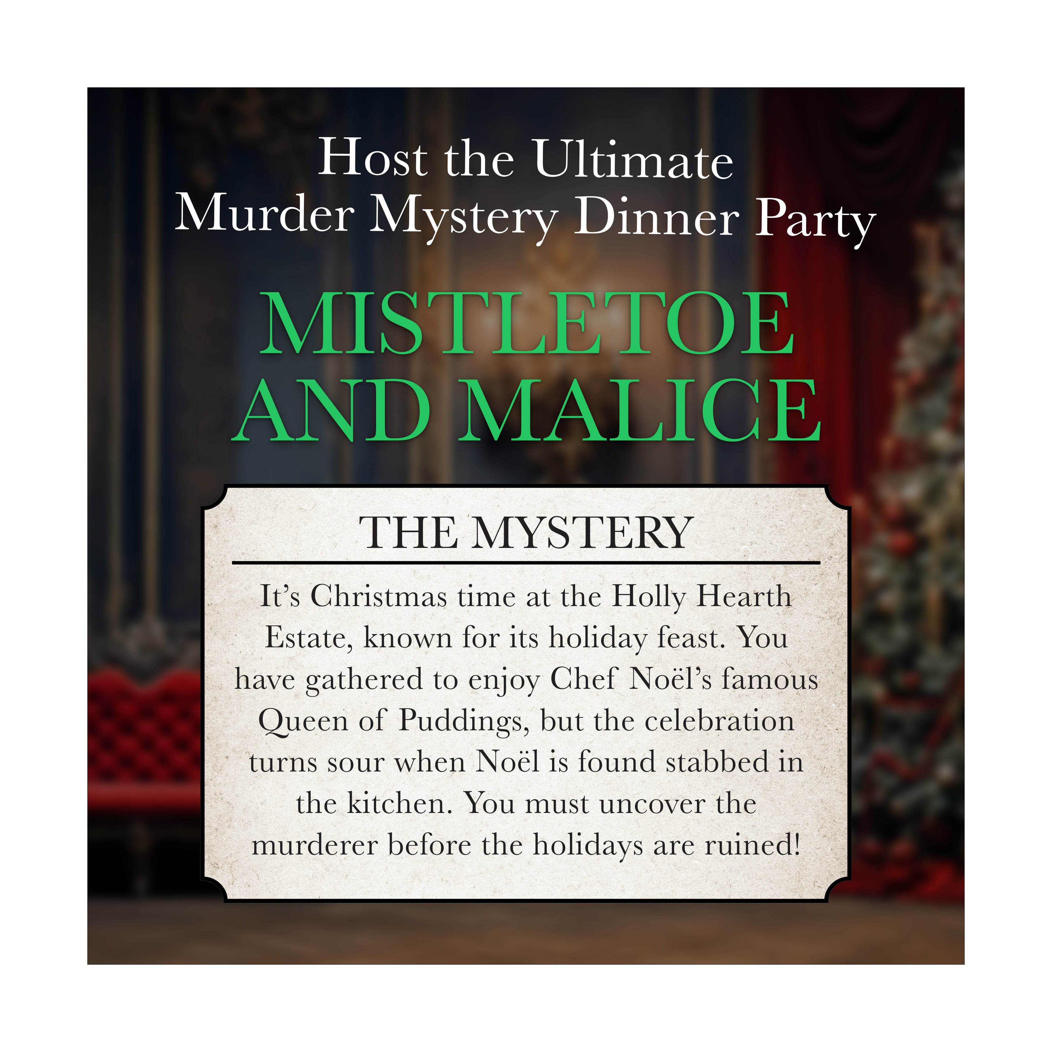 Everyone's a suspect when murder is on the menu. Mistletoe and Malice is a fully immersive holiday murder mystery party game that gives you everything you need to host a night of intrigue, deception, and festive fun. Invite your friends, dress the part, serve up a meal or light snacks, and step into character as you work together to solve the crime.