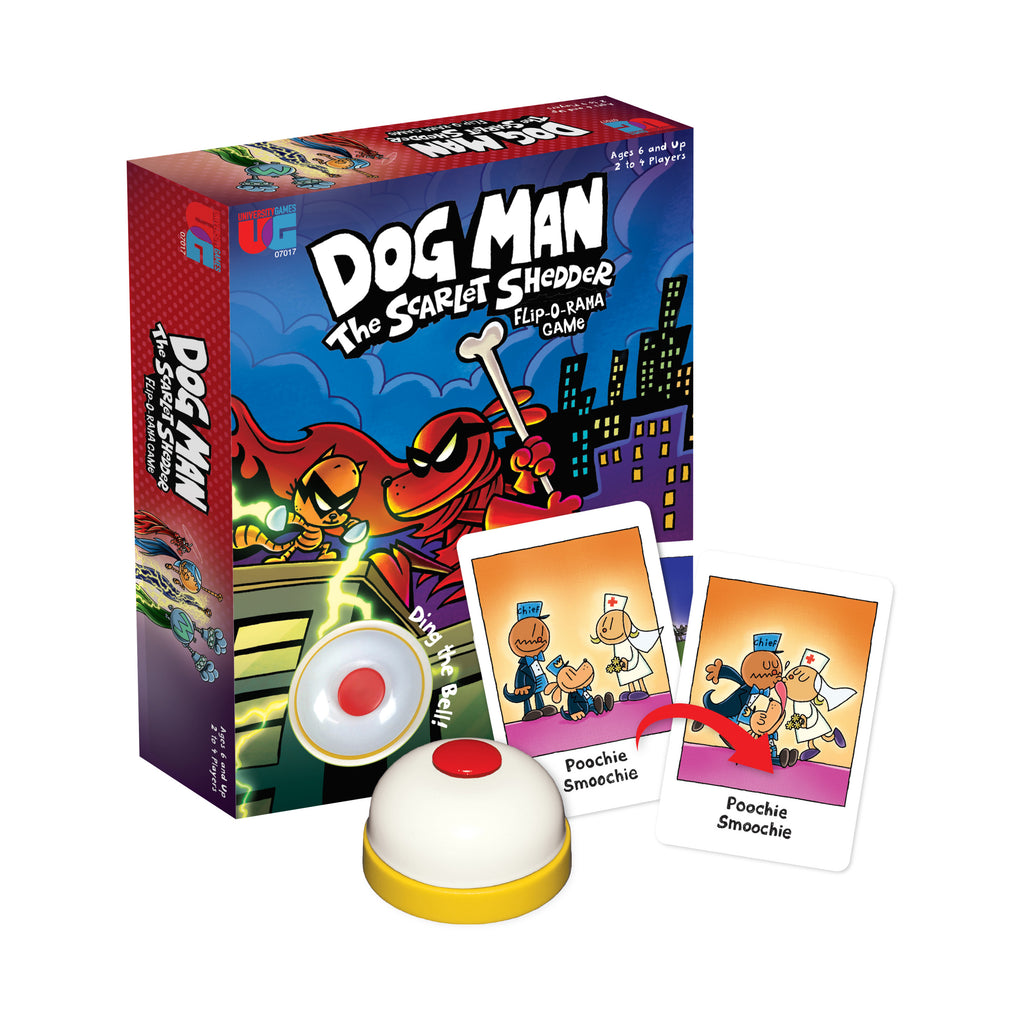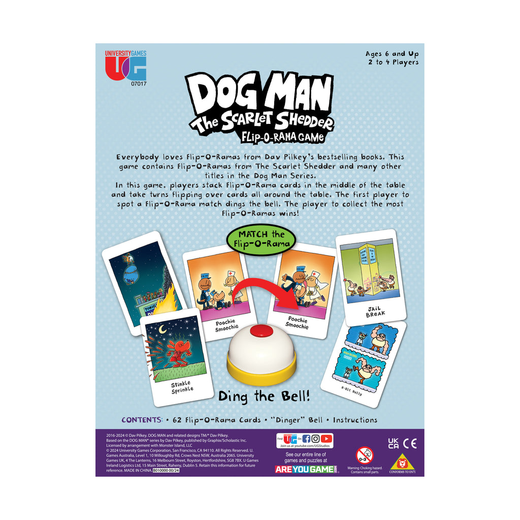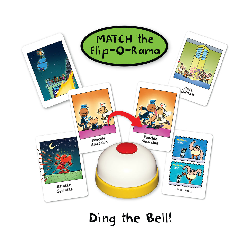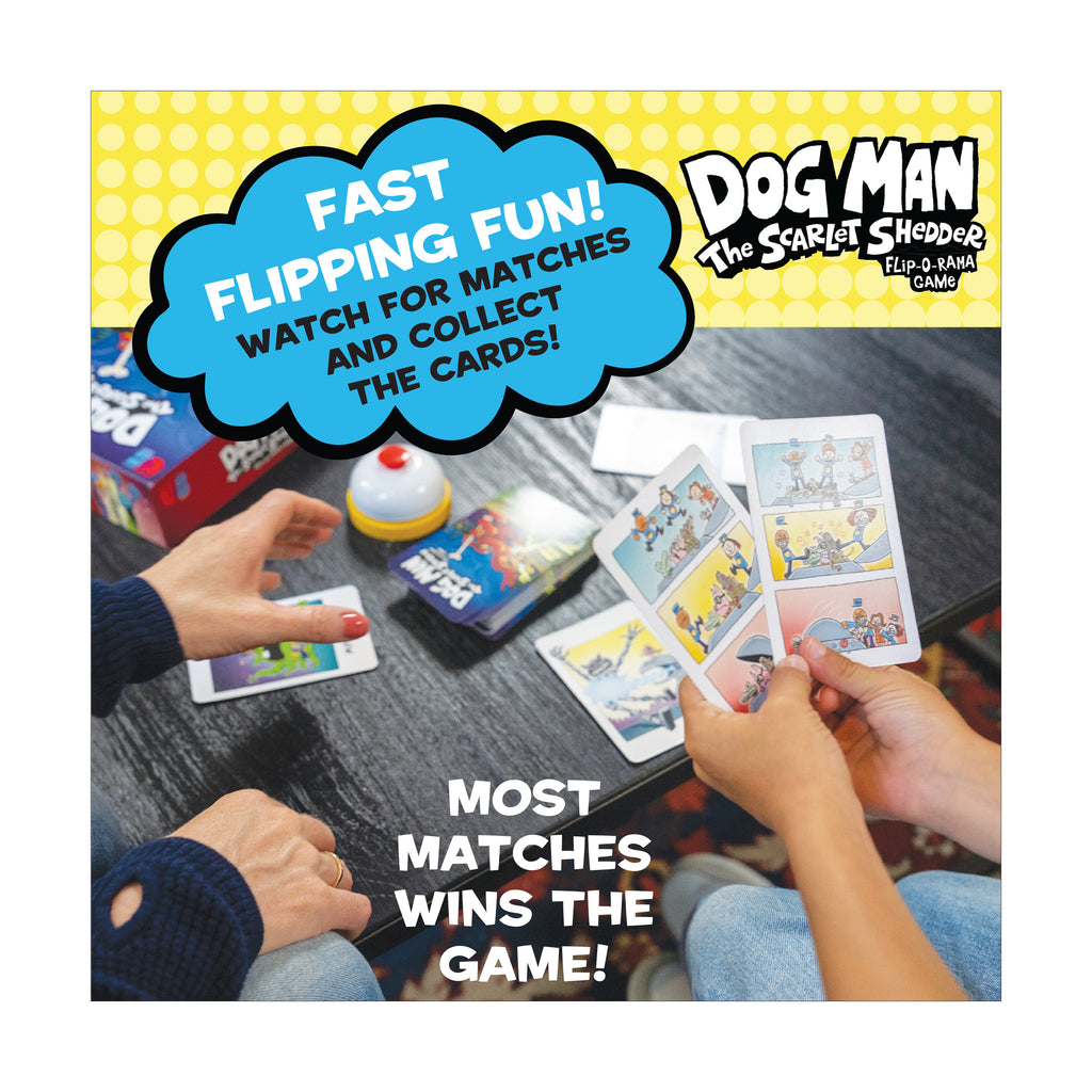 Everyone loves the Flip-O-Ramas from Dav Pilkey's best-selling Dog Man books, and now they're a game! In Dog Man - The Scarlet Shedder Flip-O-Rama Game, players stack Flip-O-Rama cards in the middle of the play area and take turns flipping them over. The first player to spot a Flip-O-Rama match dings the Bell to claim the cards. The player who collects the most Flip-O-Rama cards wins!