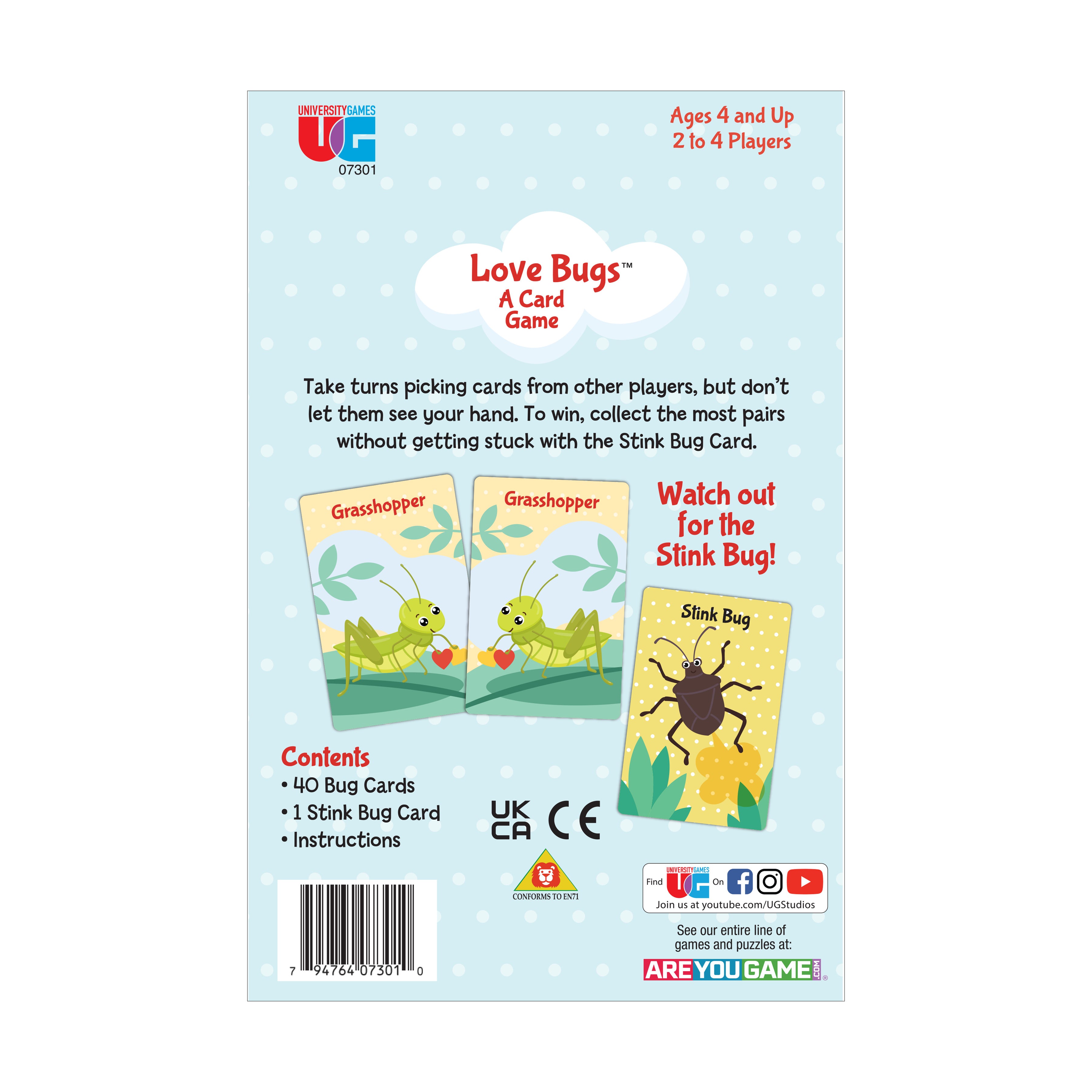 Get ready for a cute and playful twist on the classic Old Maid game with Love Bugs! In this delightful game, players take turns selecting cards from each other's hands, aiming to collect the most pairs of charming bug characters. The twist? If you end up with the dreaded stink bug card at the end, you'll lose the game!
