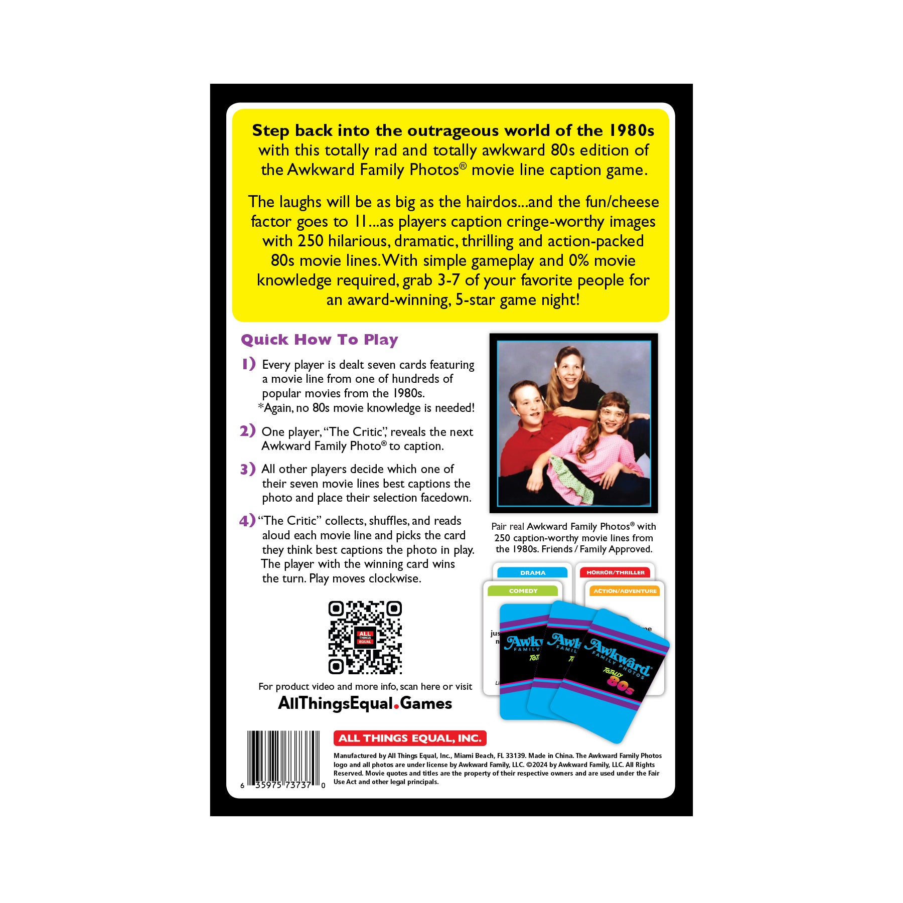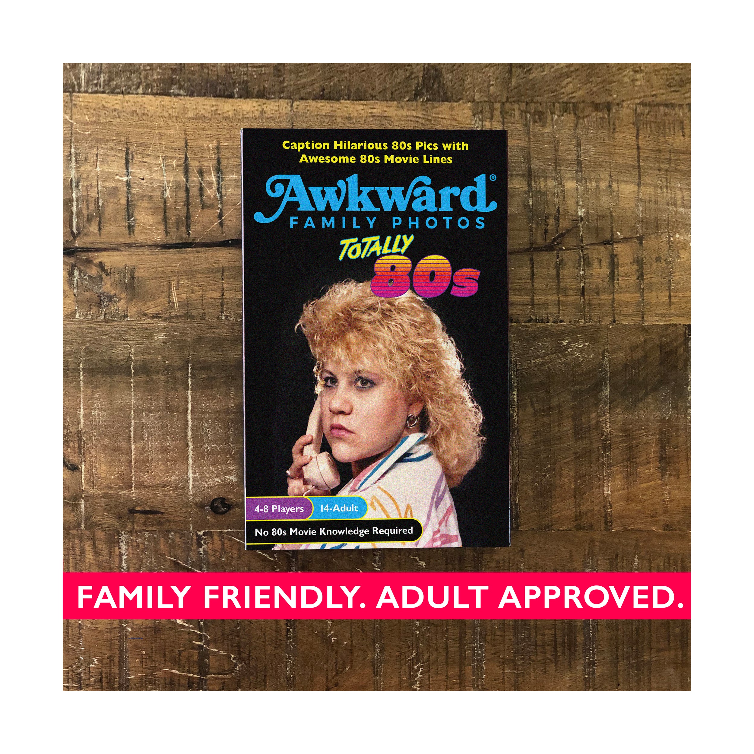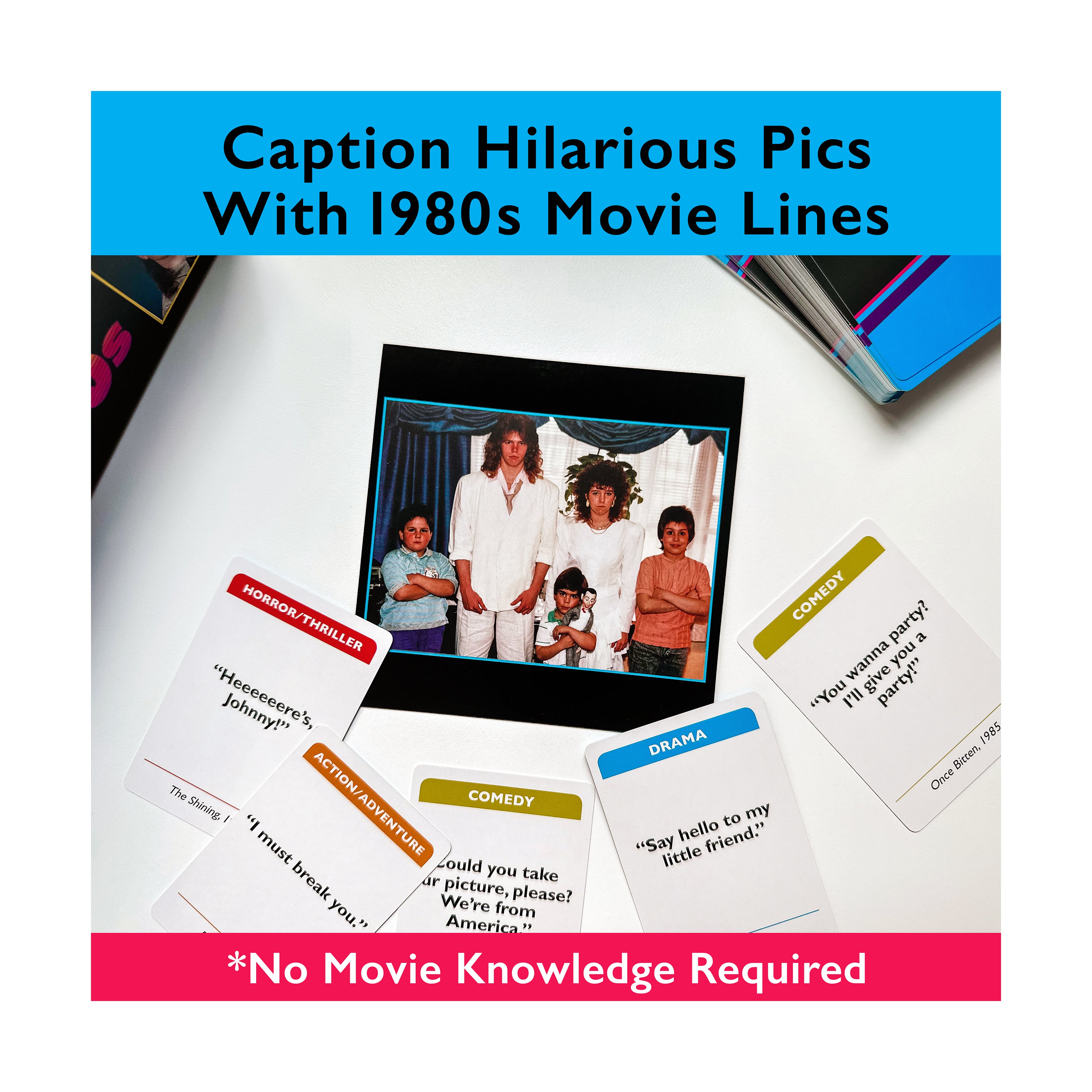 The laughs will be as big as the hairdos... and the fun/cheese factor goes to 11... as players caption cringe-worthy images with 250 hilarious, dramatic, thrilling, and action-packed 80s movie lines. With simple gameplay and 0% movie knowledge required, grab 3-7 of your favorite people for an award-winning, 5-star game night!