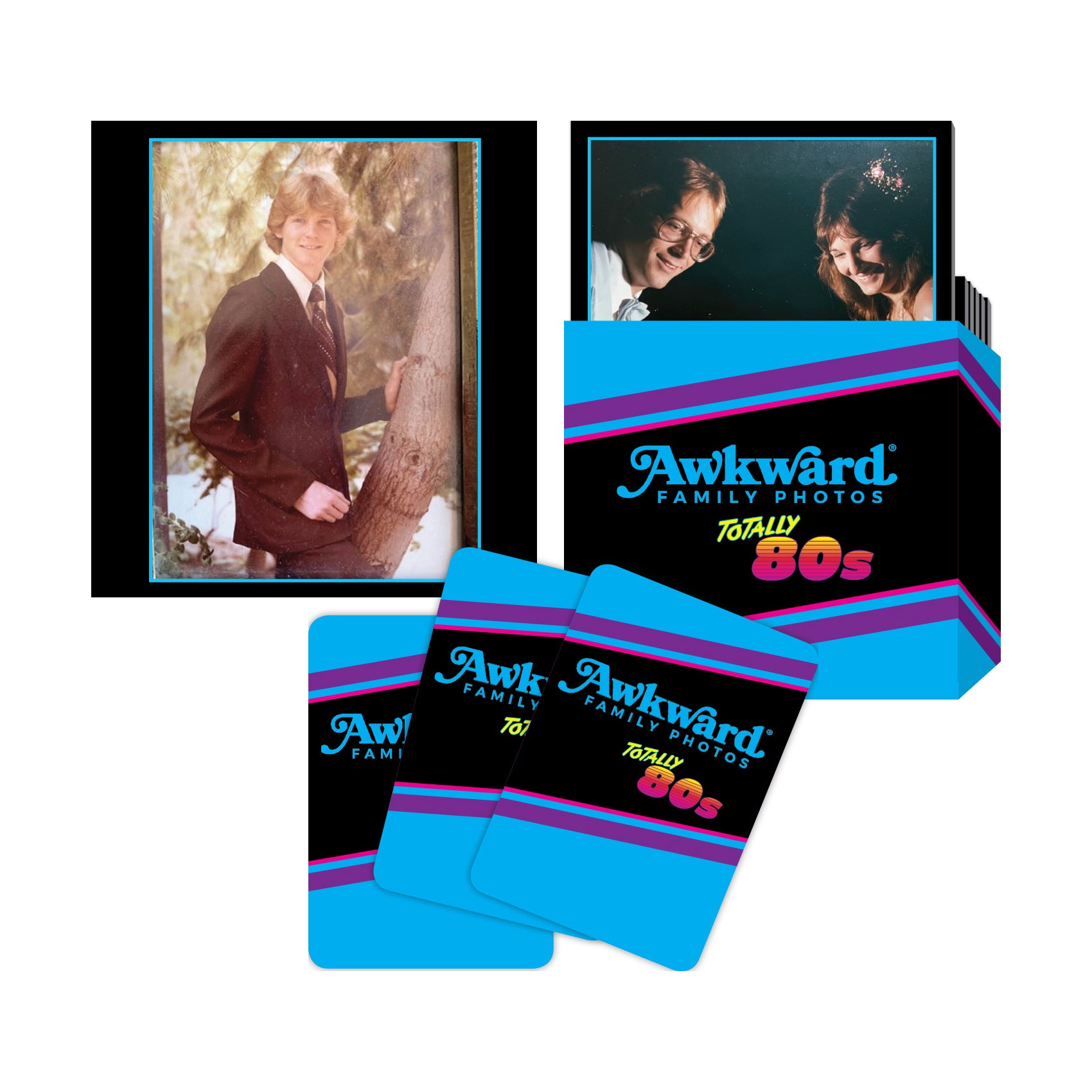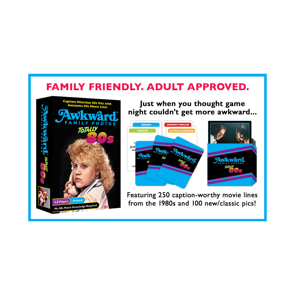 Contents include: 250 Movie Line Cards, 50 Double-Sided Awkward Family Photo Cards (100 Images), Card Box to Hide/Hold Photos During Play