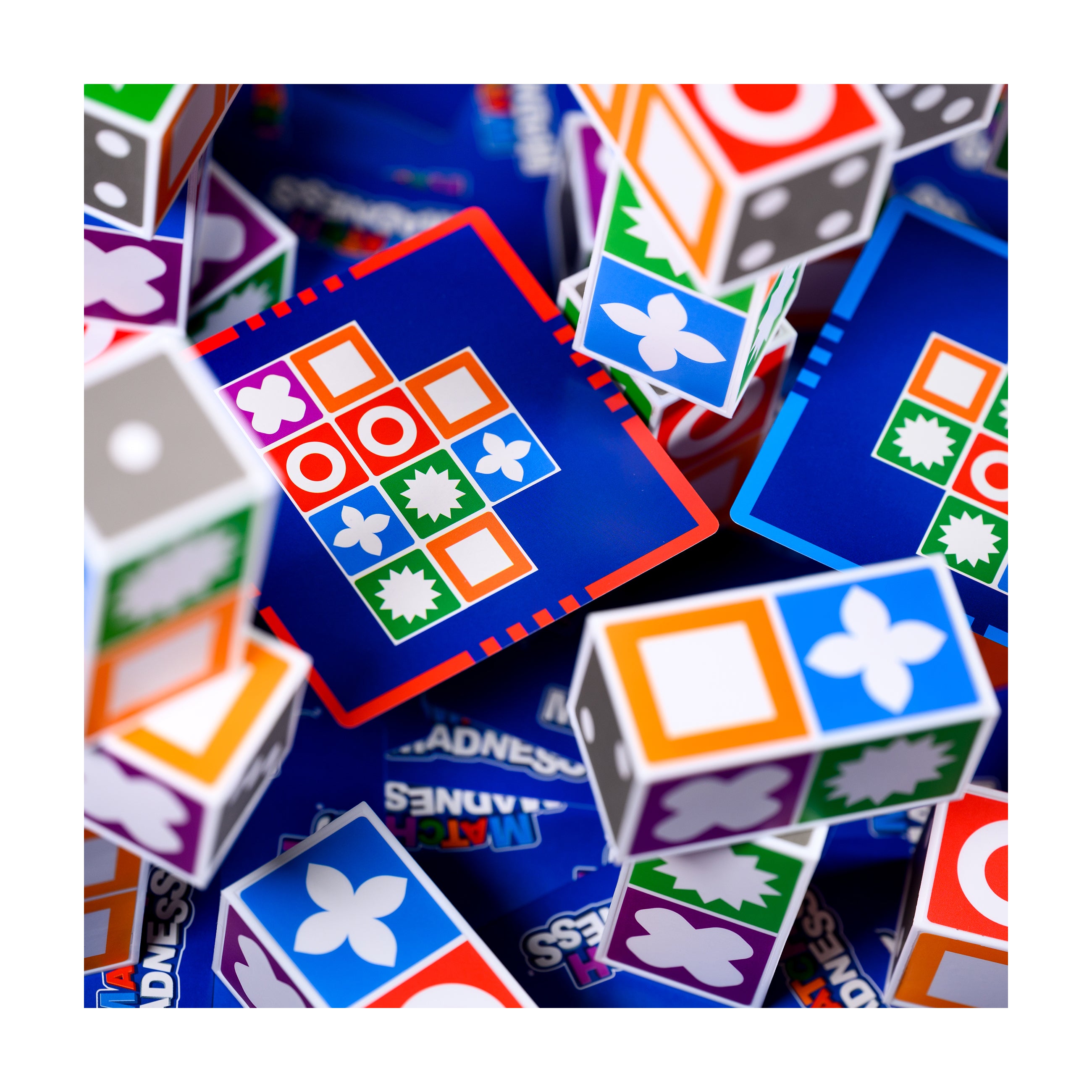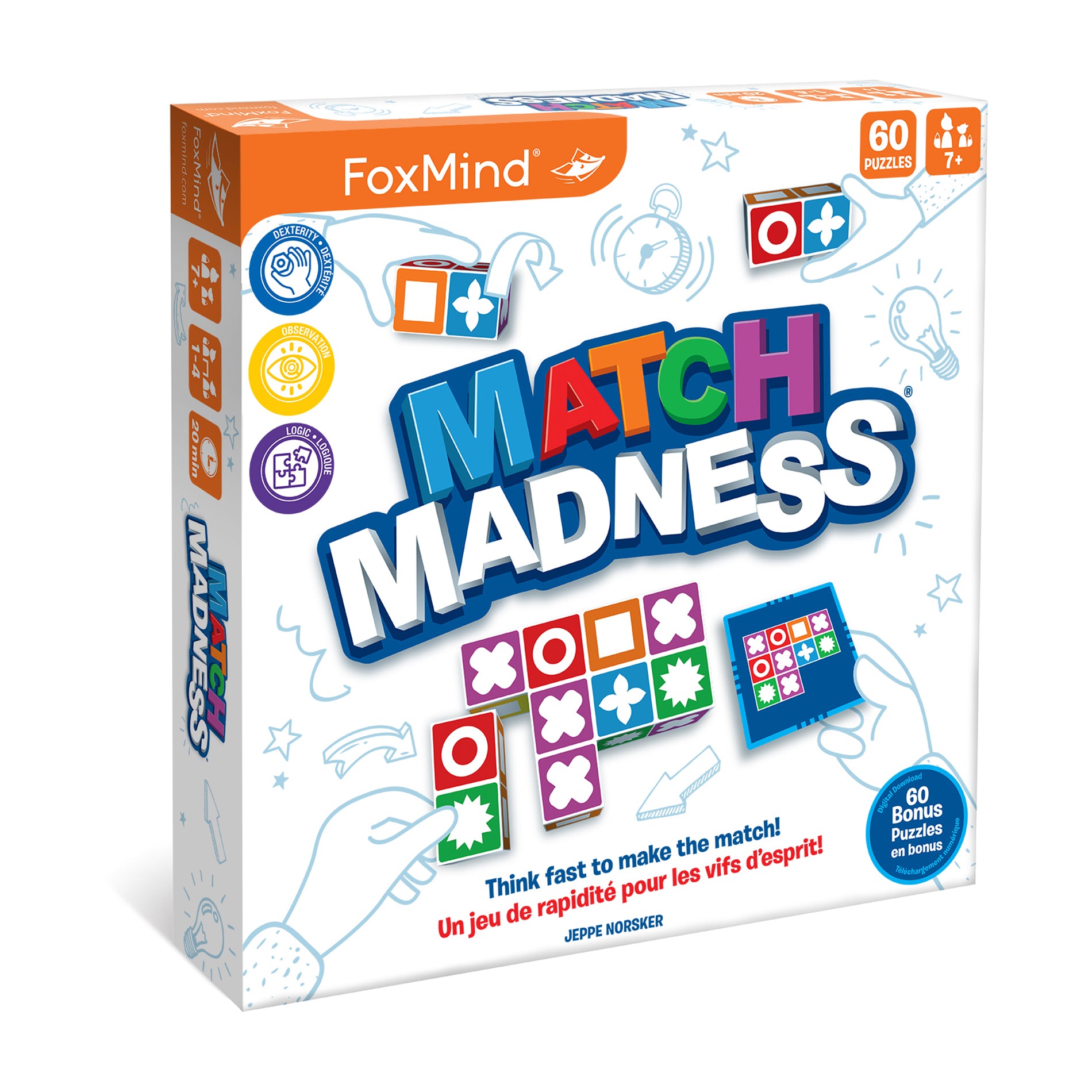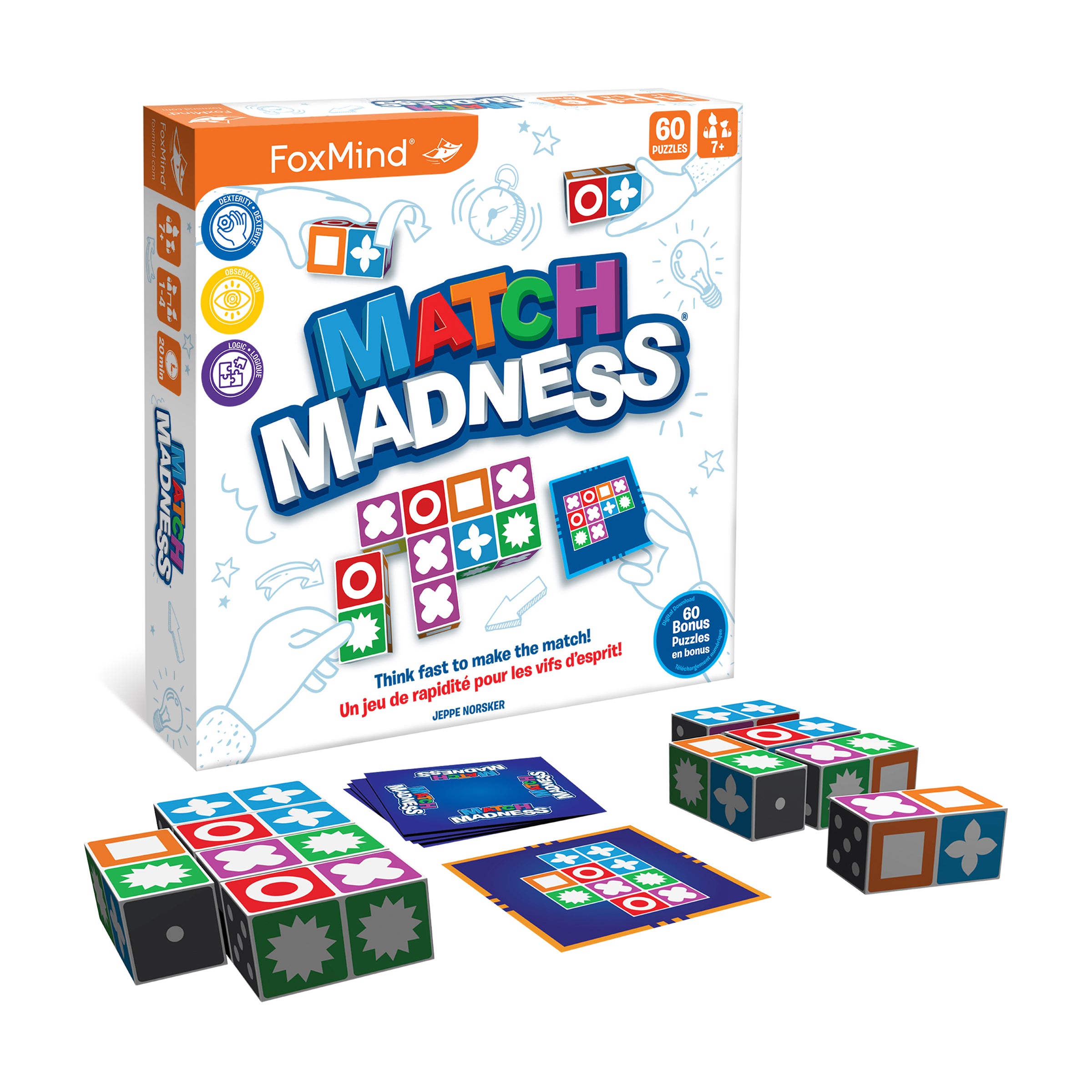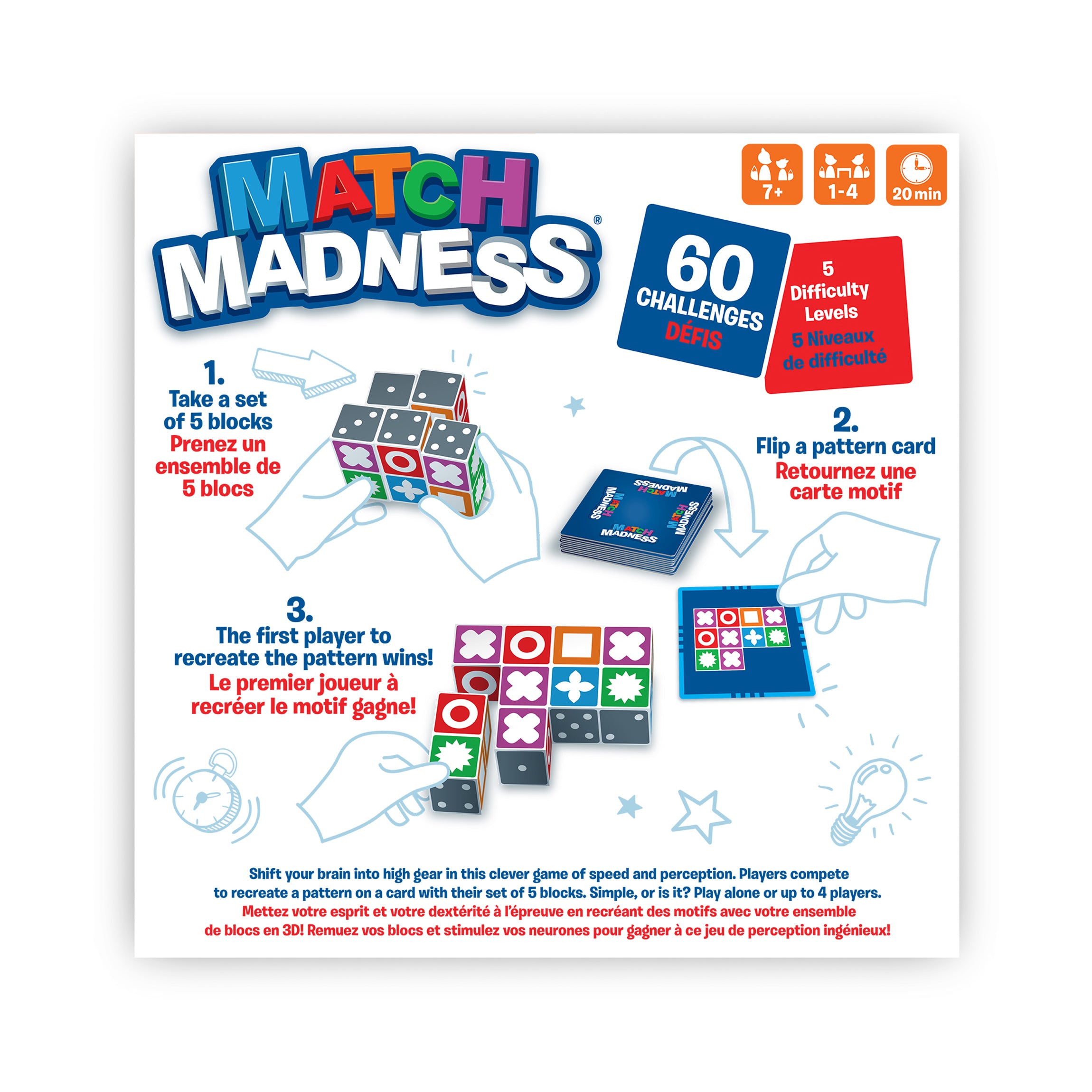 Let the furious fun begin! Shift your brain into high gear in this clever game of speed and perception. Players sprint to arrange a set of 5 blocks to match a pattern shown on a card. The first player to succeed grabs the card and a new matching race starts. Simple, or is it? Tension rise as you scramble to outpace and outsmart your opponents in this ingenious game of perception. So fire-up your neurons and be transported by Match Madness. Think fast to make the match!