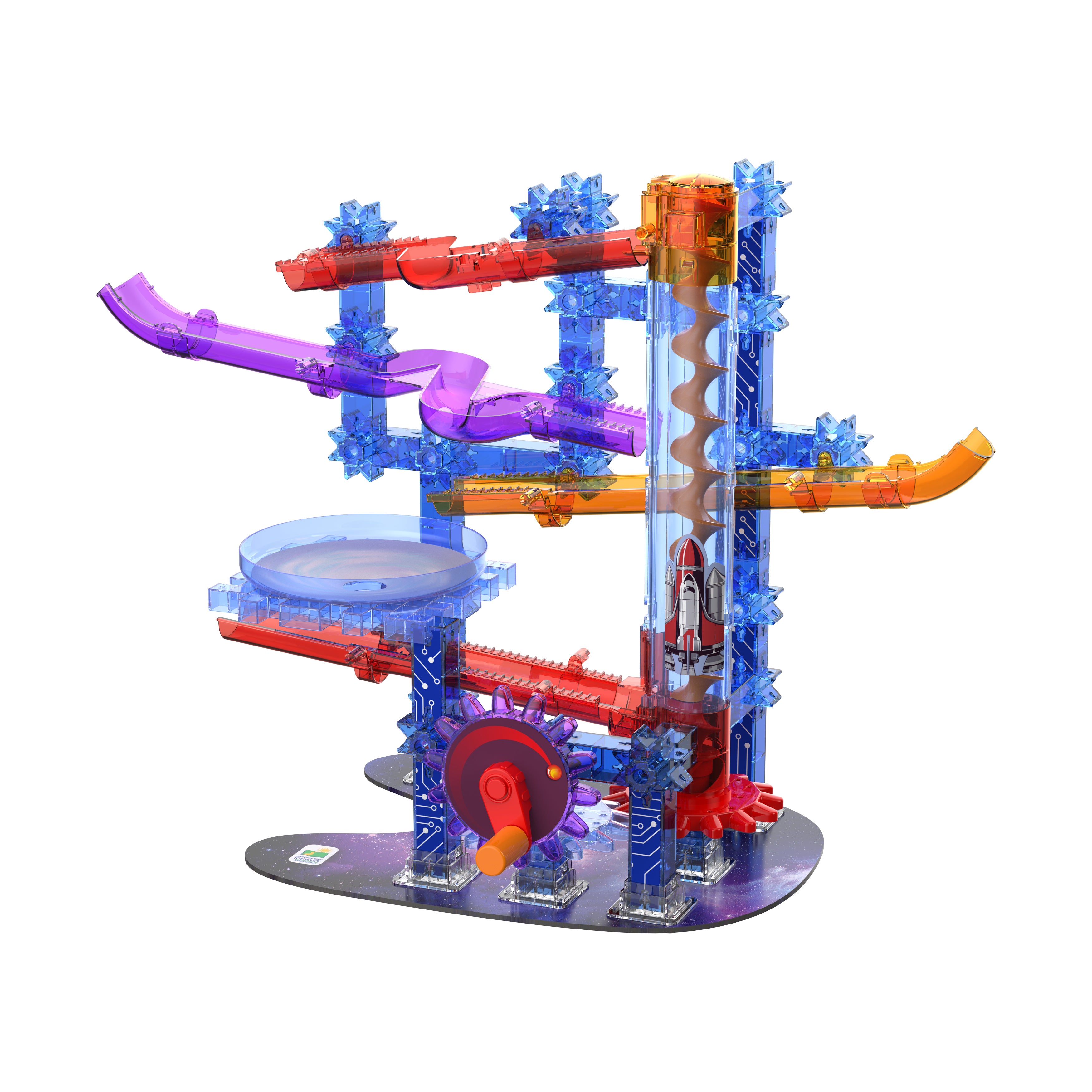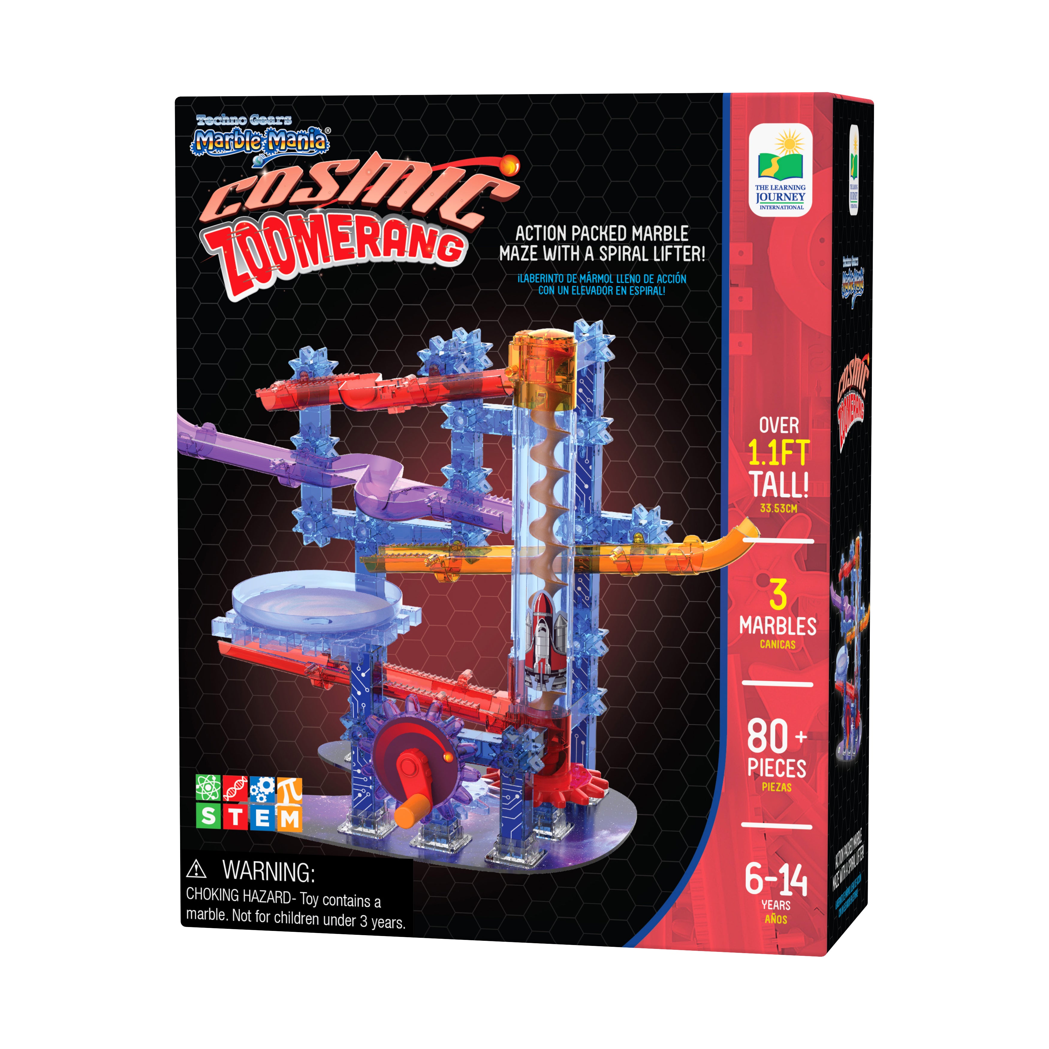 Travel through the cosmos and back with the Techno Gears Marble Mania - Cosmic Zoomerang construction set! Spark your young engineer's interest in STEM education with this immersive, action-packed marble maze building kit. This 80+ colorful translucent piece construction set is designed to launch kids into the exciting world of science, technology, engineering, and math. Use the hand crank to move the marbles up the spiral lifter to the top of the twisting and turning tracks. Once built, kids can watch their marbles drop, spin, and roll through their own fun and exciting creation. Closely follow the colorfully detailed instruction manual to build the marble run and watch your child enjoy the extended play value as they experience the world of cause and effect. Foster a creative hands-on experience and make learning fun by introducing your child to the remarkable world of engineering and mechanics!