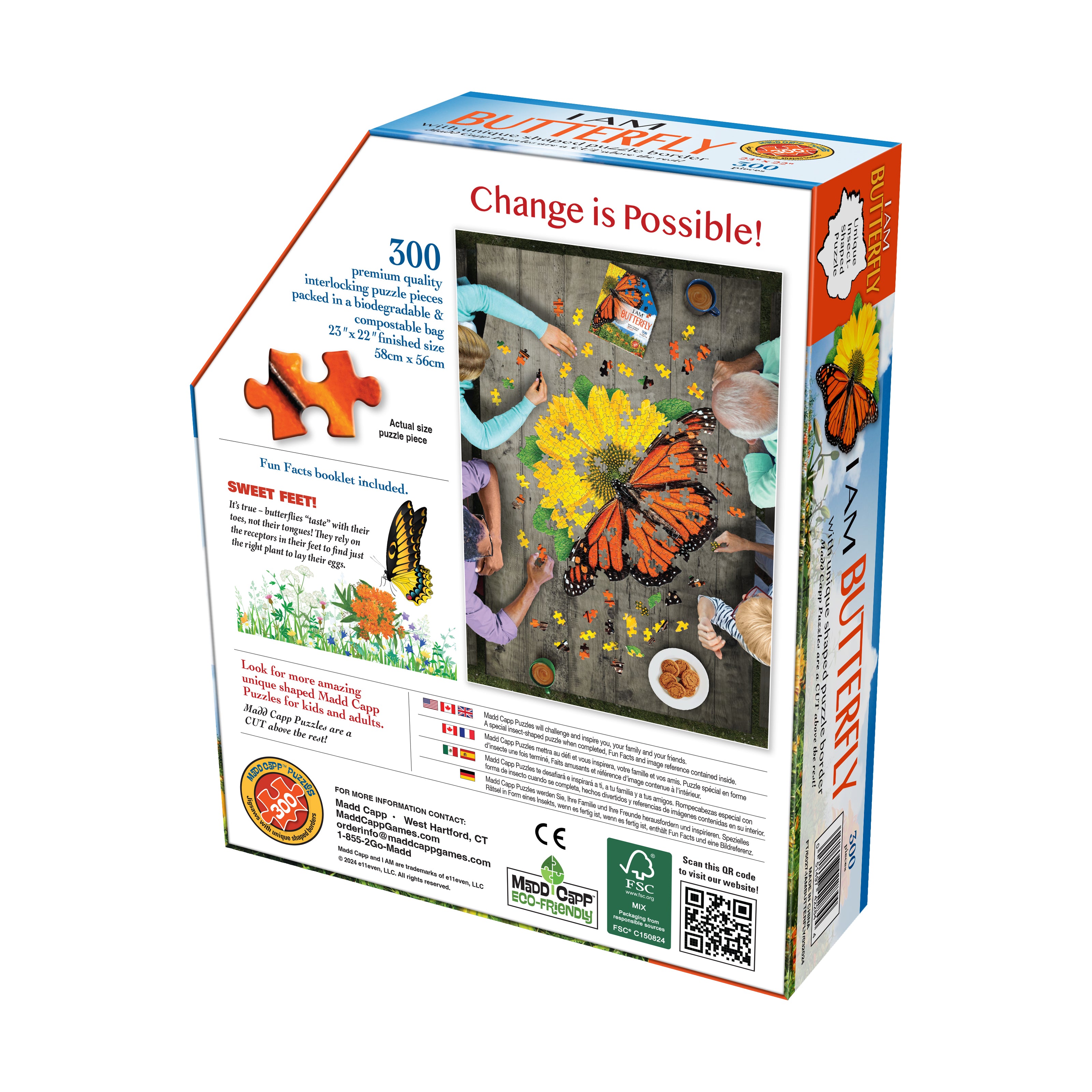 Inside the box are 300 premium-quality interlocking pieces that fit together smoothly for a satisfying puzzling experience. The pieces are packed in a biodegradable, compostable bag, and the puzzle is made with eco-friendly materials, making it a thoughtful choice for environmentally conscious puzzlers.