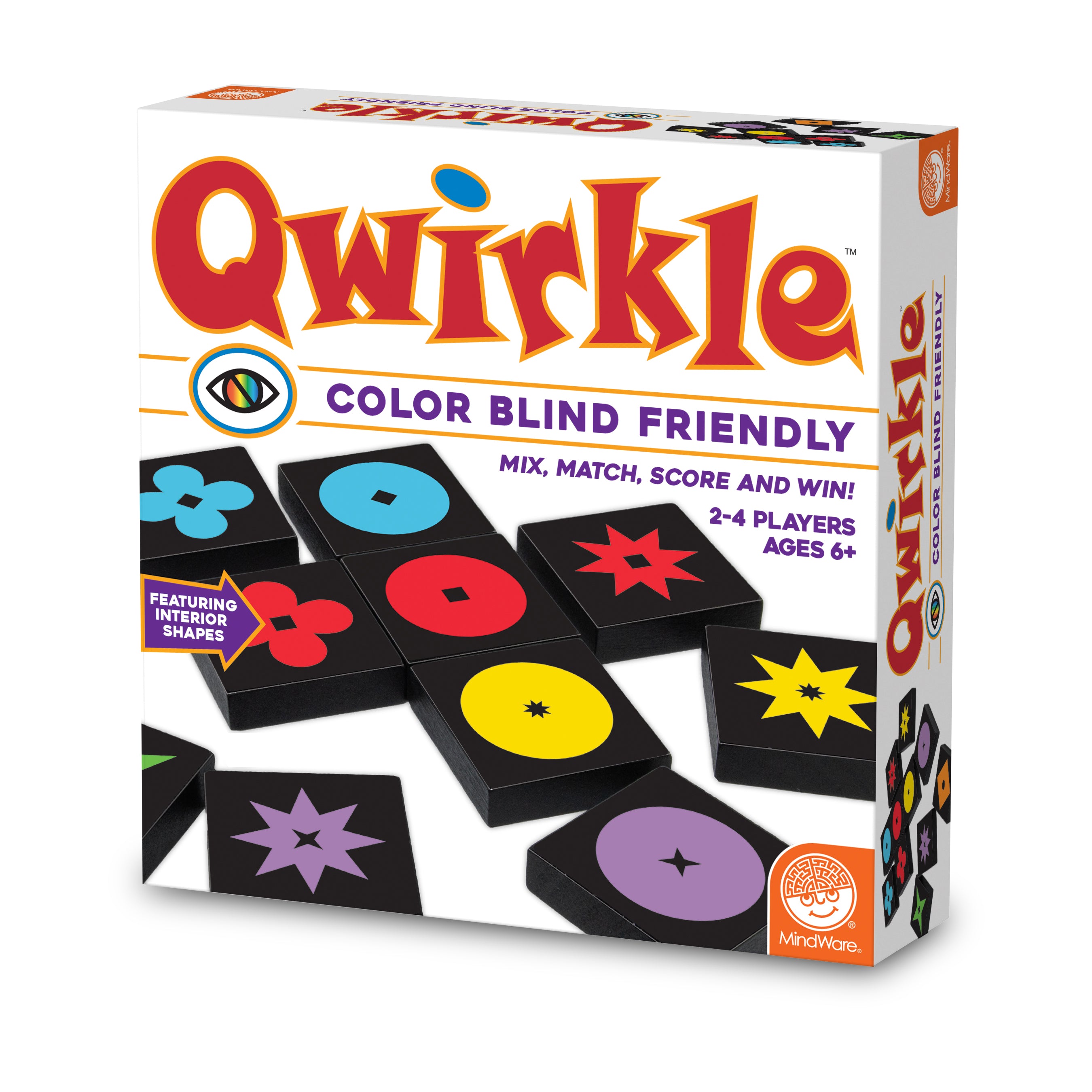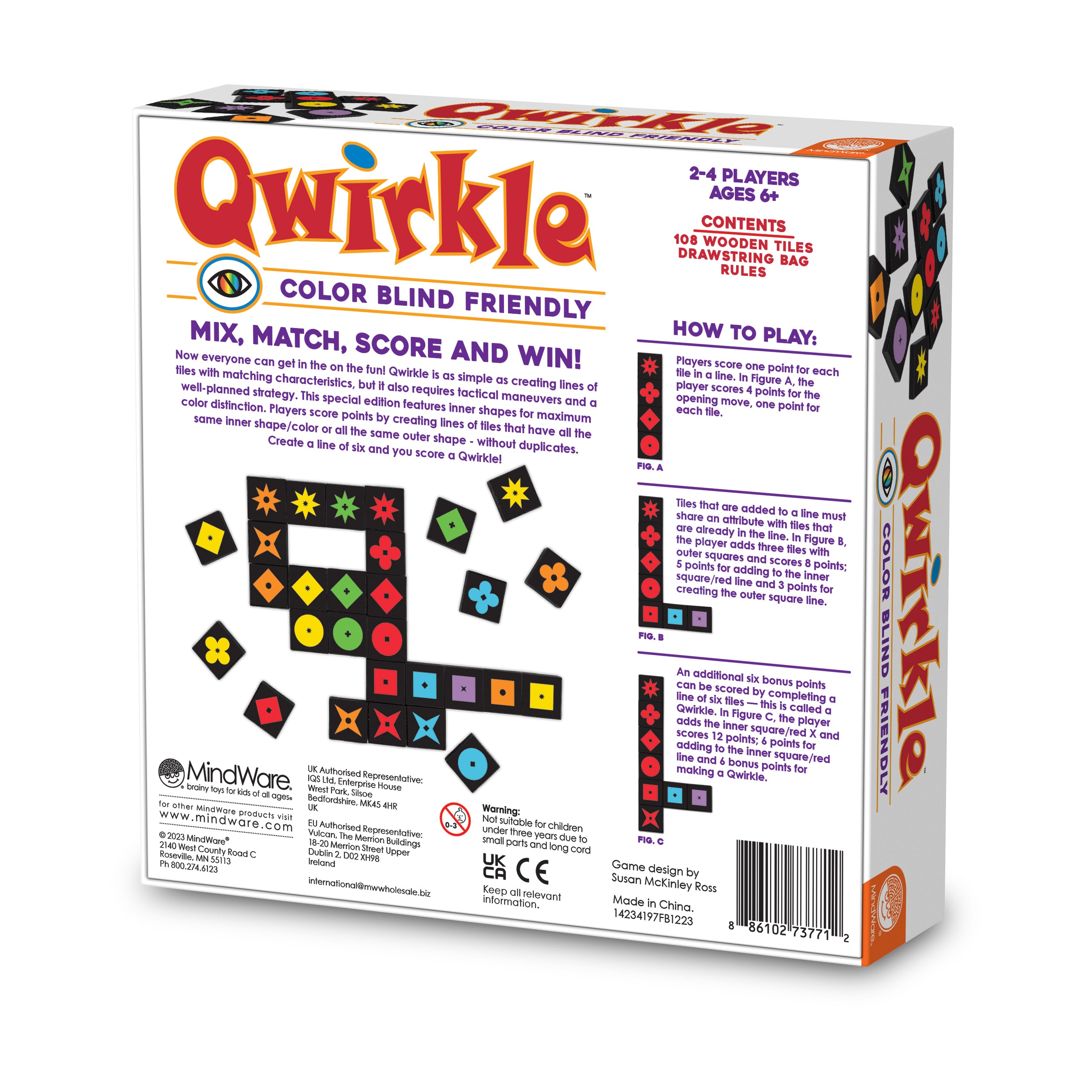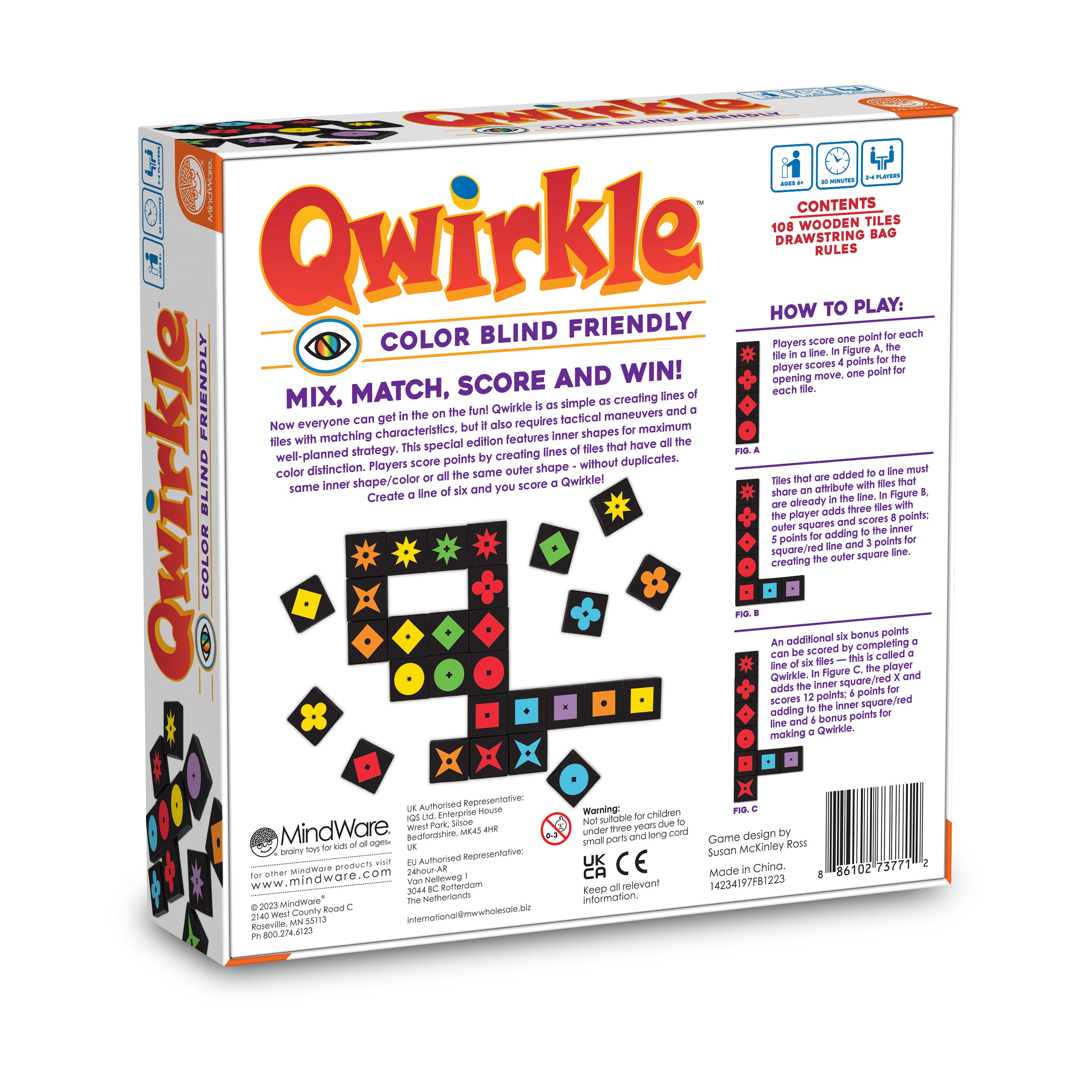 The beloved classic strategy tile game is now color-blind friendly! Simple to learn yet strategic and exciting to play, Qwirkle is a fun family game enjoyed by kids and adults alike. This color-blind friendly edition features tiles with interior shapes that indicate each tile's color, along with an adjusted color scheme that provides enhanced contrast. Players score points by creating lines of tiles that have all the same inner shape/color or all the same outer shape. Create a line of six to score a Qwirkle!
