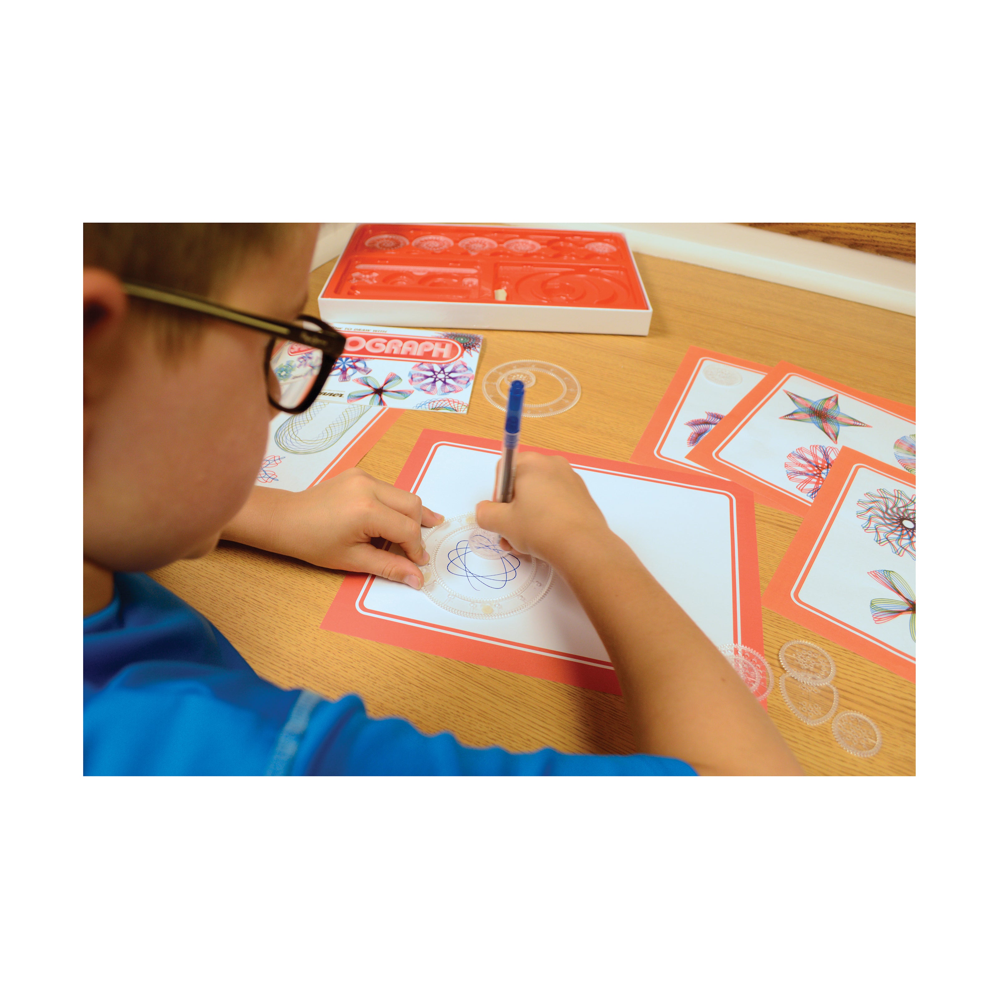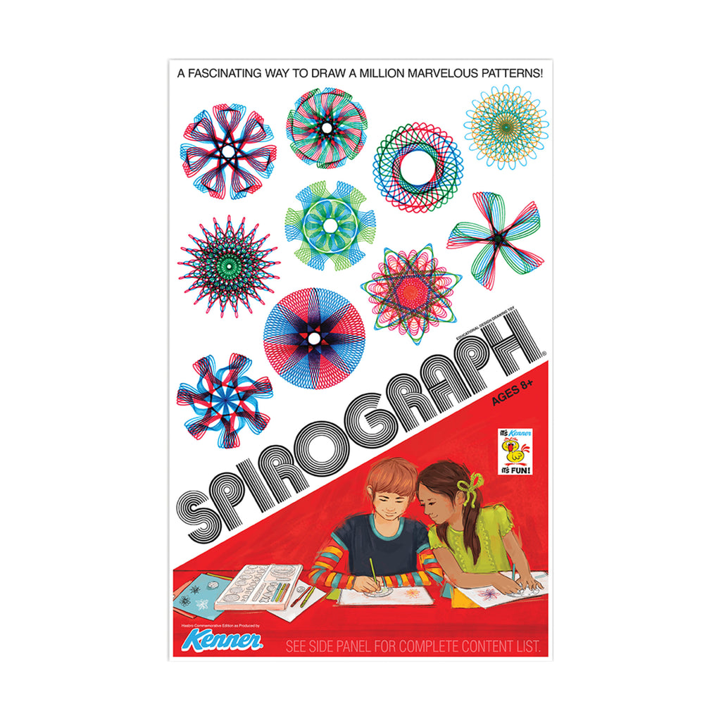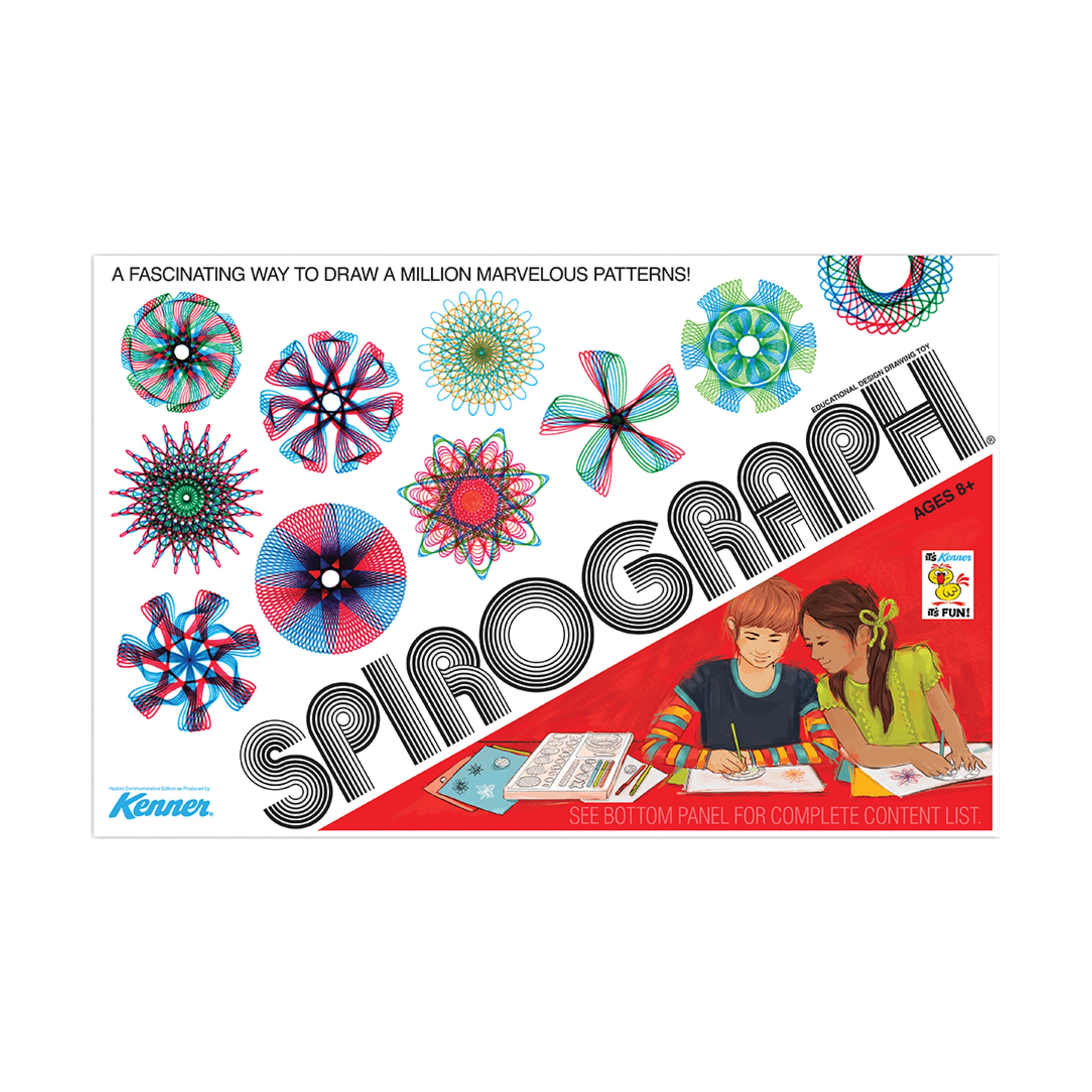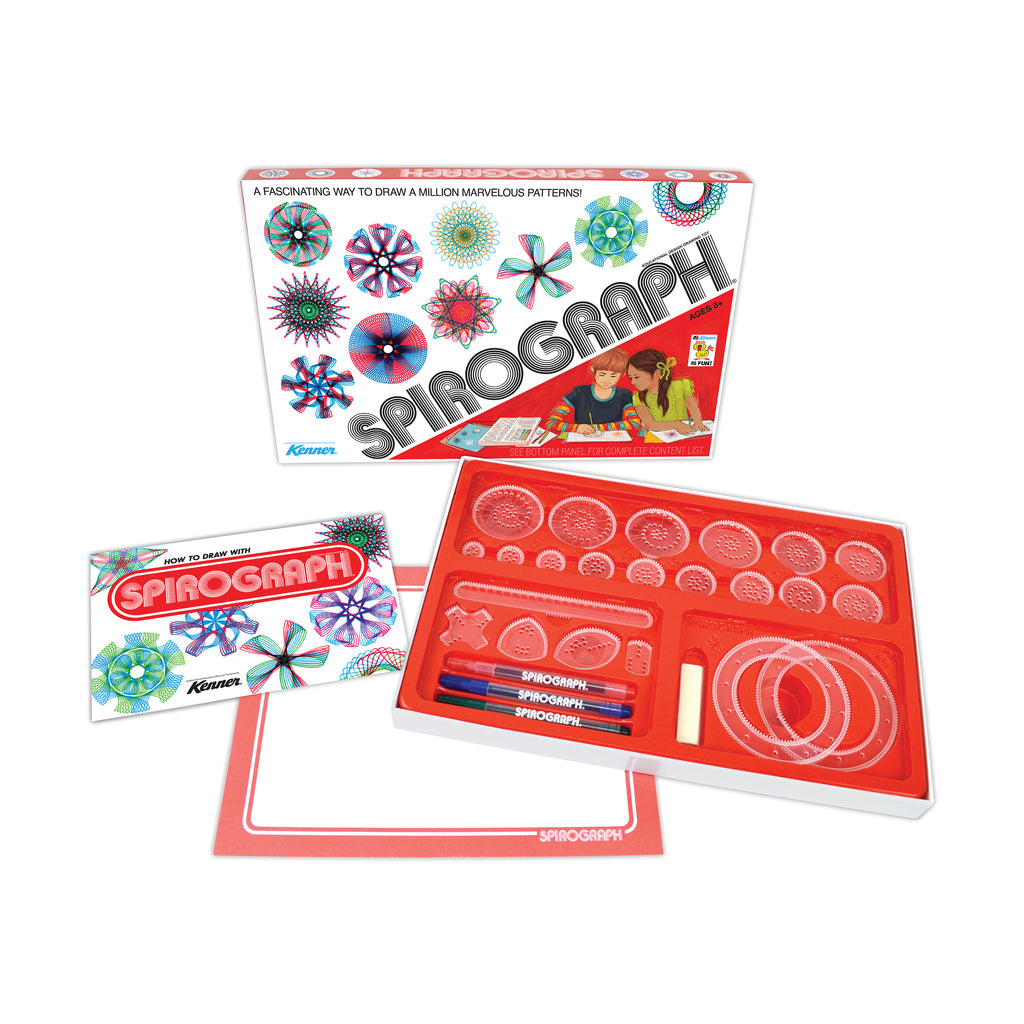Spirograph is the classic way to make countless amazing designs! This commemorative edition Spirograph Retro Deluxe Set is a reproduction of the original, just like you remember, featuring throwback packaging and retro graphics! With all the iconic wheels and rings of the original, the precision engineered Spirograph gears work with the three design pens included, as well as with most standard pens, markers, and pencils.
