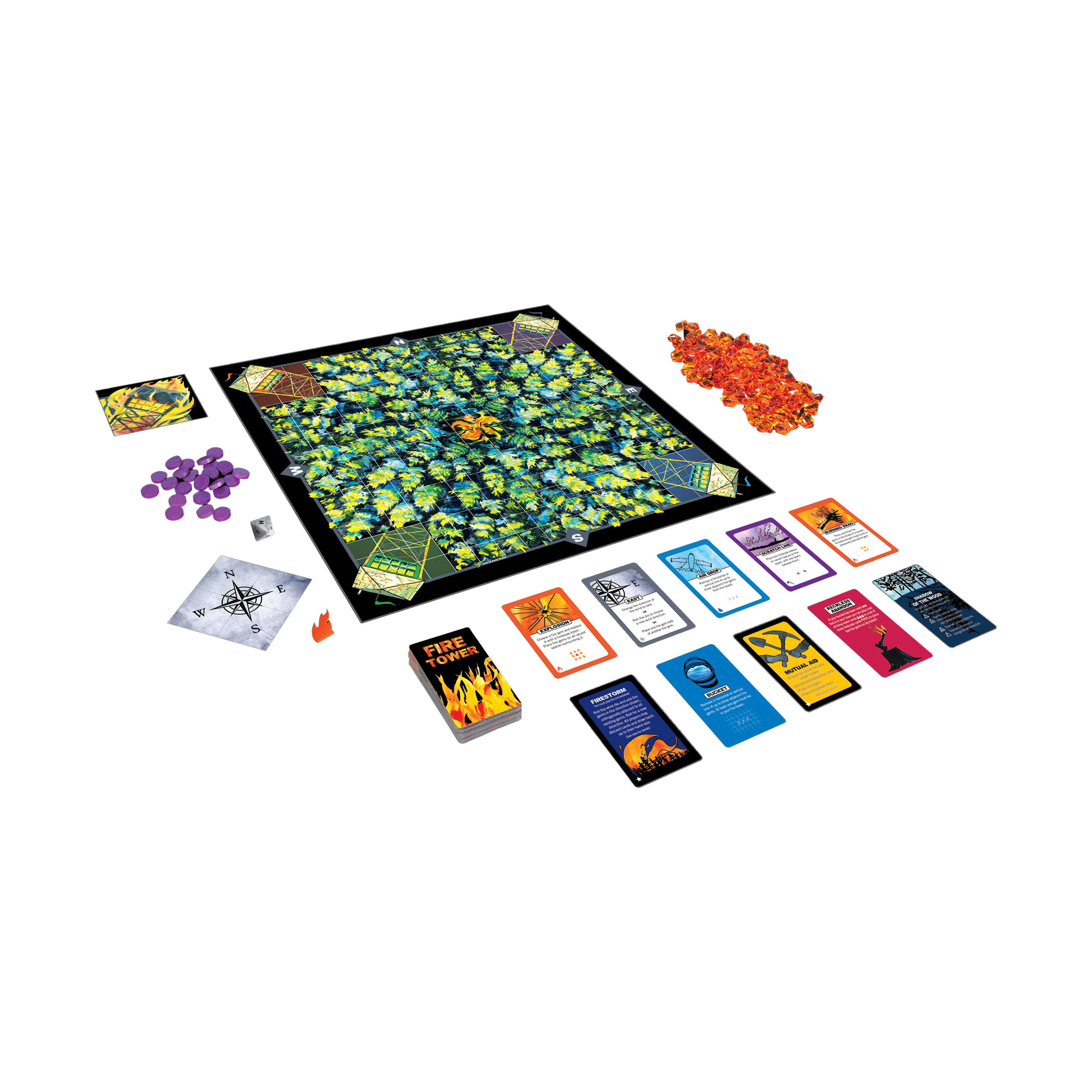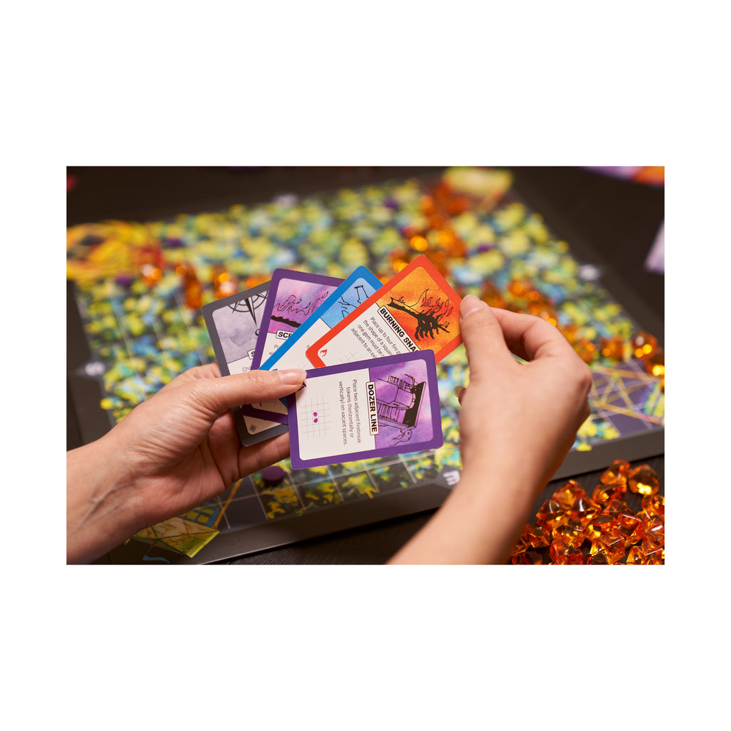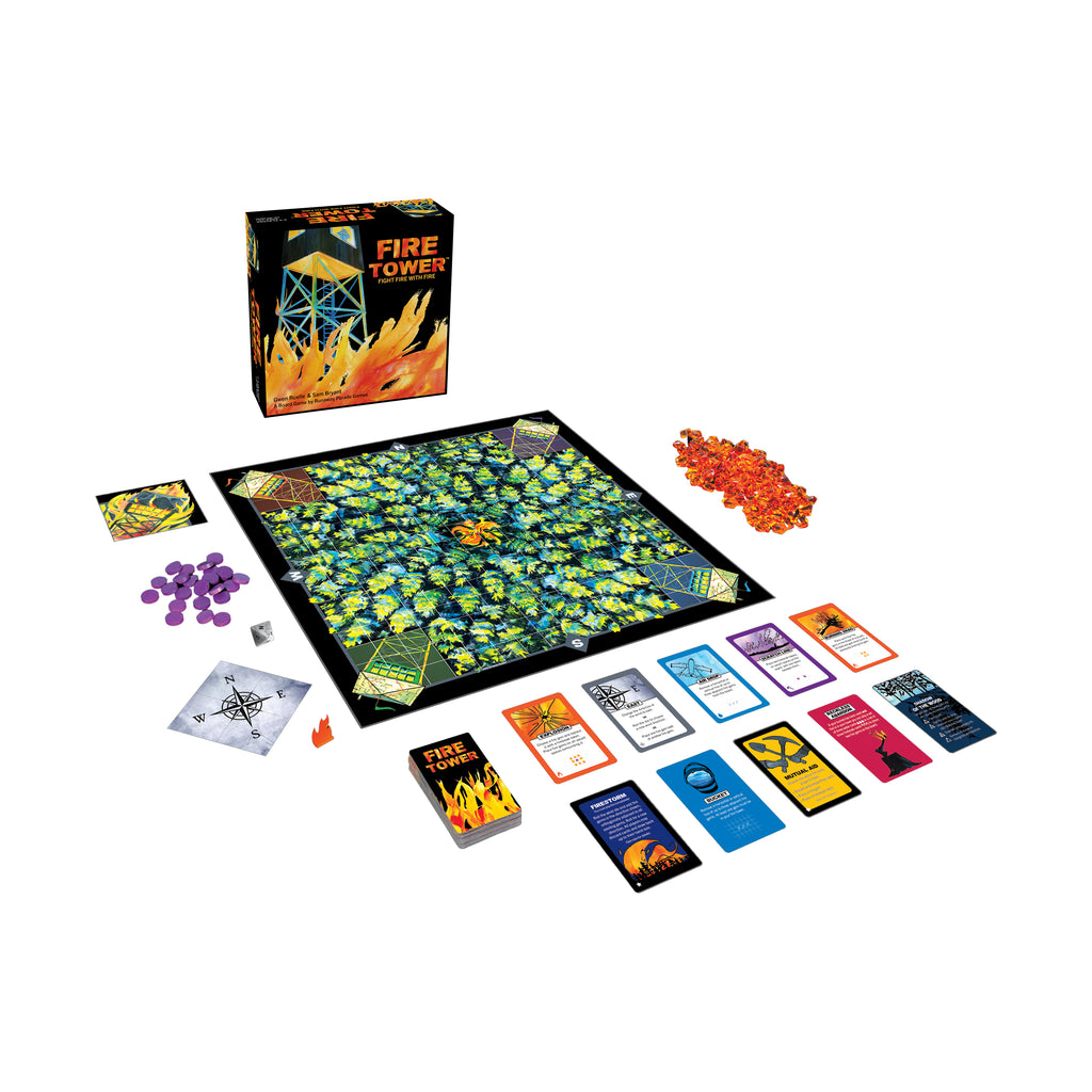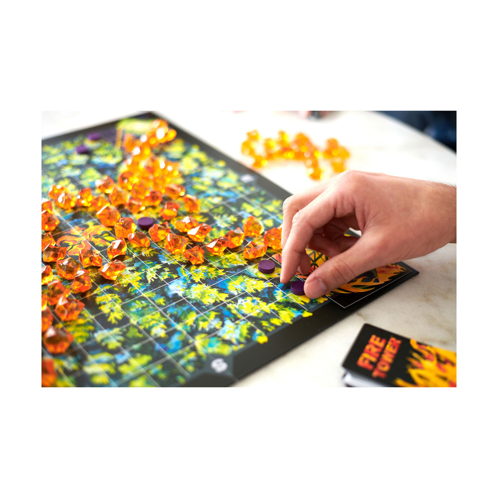 Fight fire with fire in this fast-paced, fiercely competitive strategy game of pattern building and hand management. Smoke rises on the horizon. Protect your fire tower from a rapidly spreading forest fire while setting your opponents' towers ablaze. Dispatch smokejumpers and fire engines to combat the blaze and construct firebreaks to fortify your tower. But there is a twist! In Fire Tower, you also take on the role of nature. Harness the power of the wind and the flames to push the blaze towards your opponents and take down their towers.