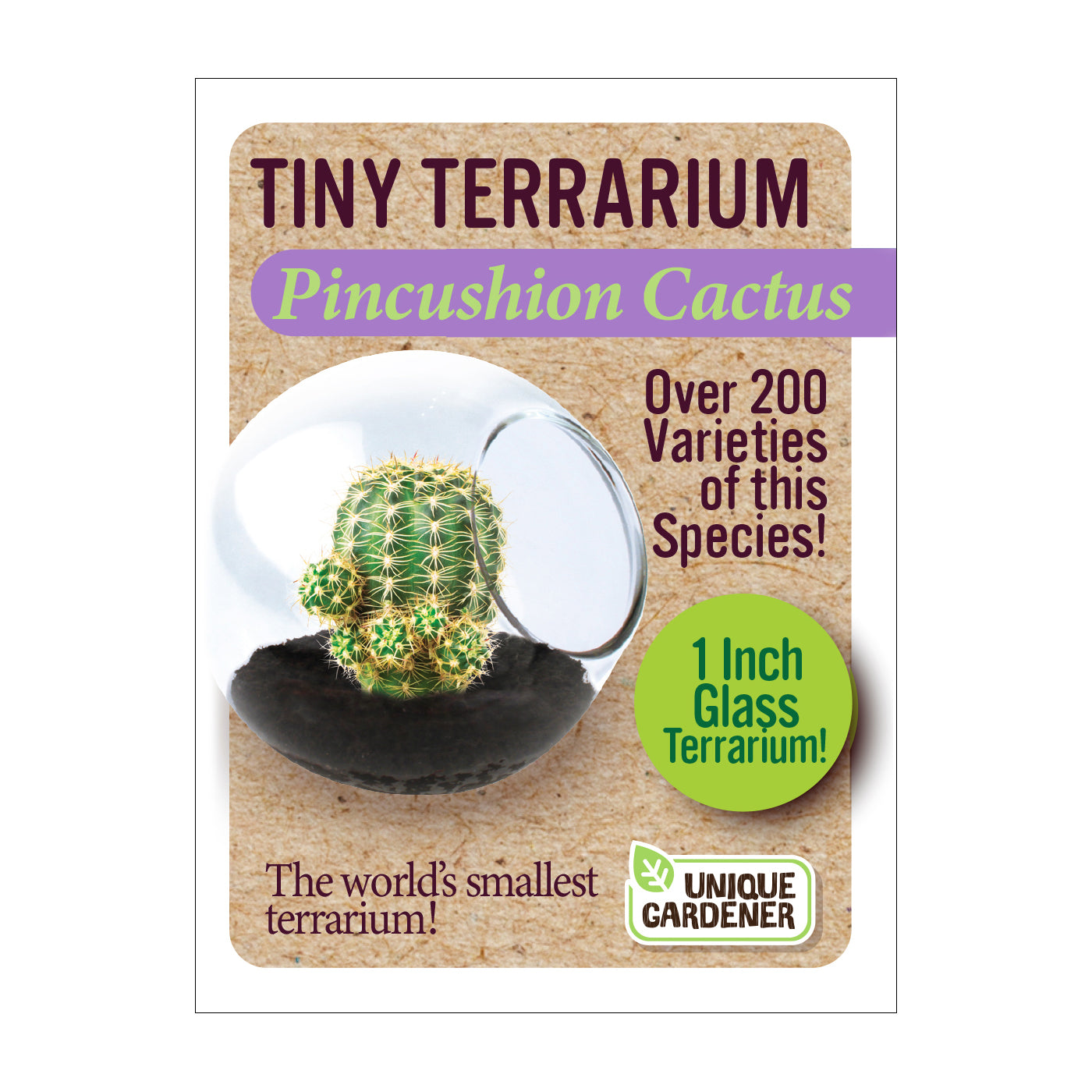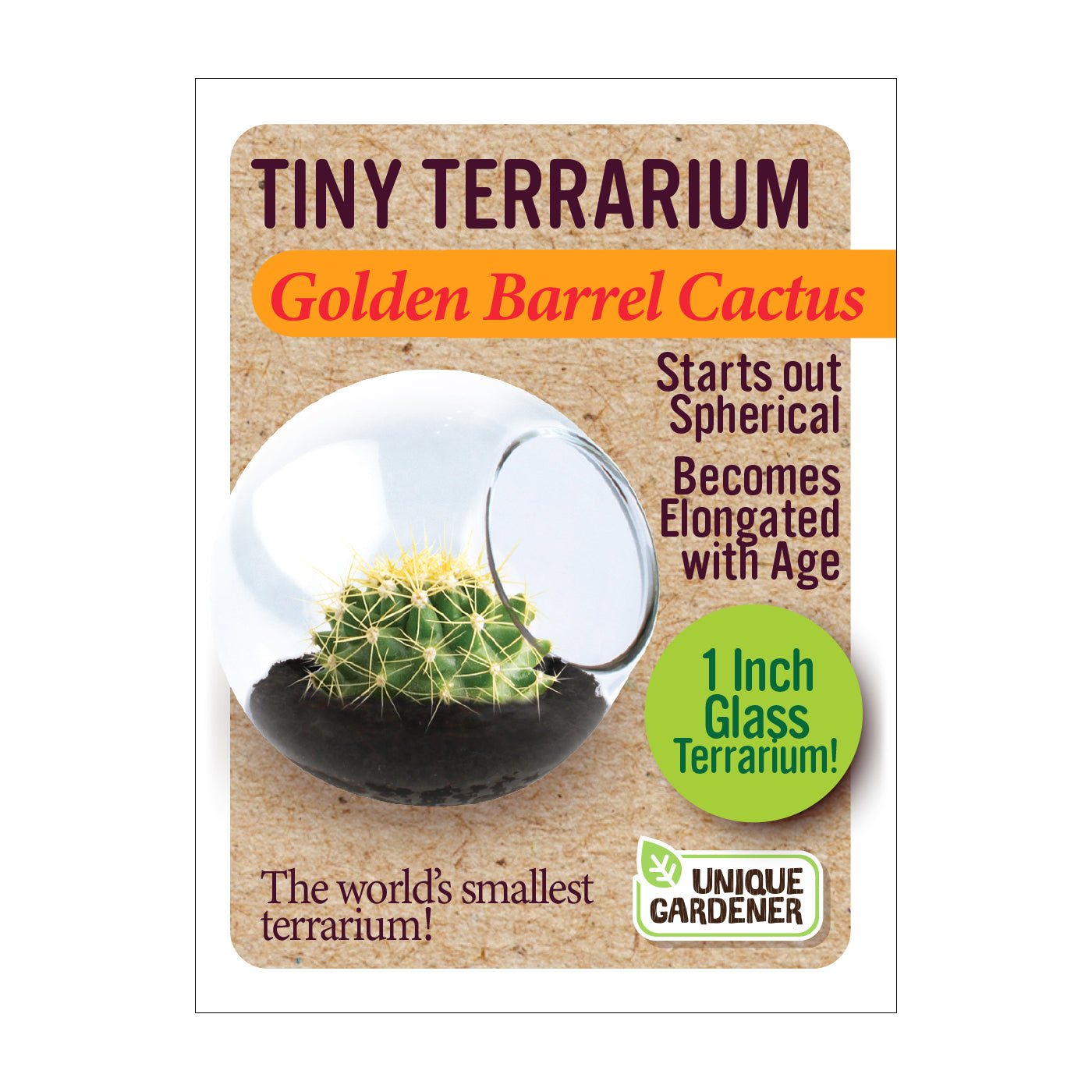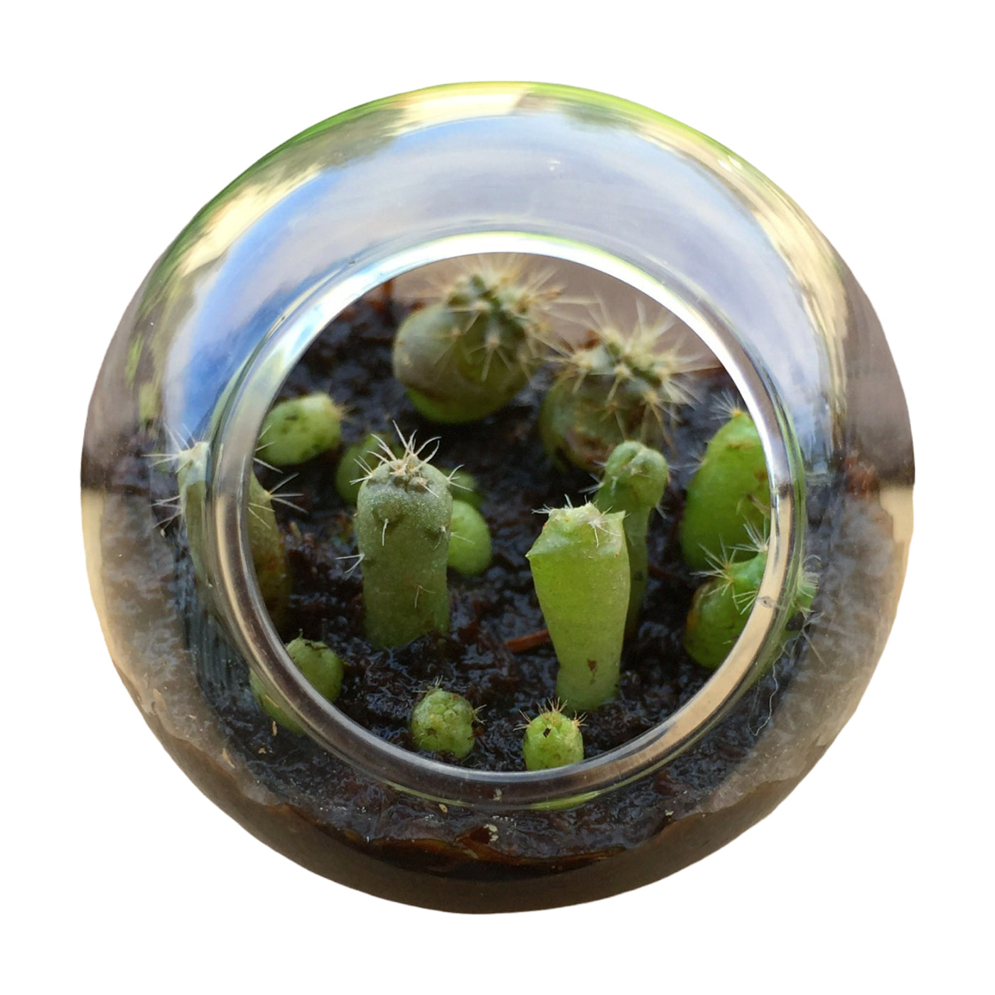 Each high-quality globe is handmade. The cacti will naturally conform to the container and stay small while growing in it. However, they can grow to full size if they are transplanted into progressively larger containers. With proper care, these miniature cactus terrariums become tiny, self-contained ecosystems designed to flourish for years. Cactus varieties include Fishhook Barrel Cactus, Golden Barrel Cactus, Giant Saguaro Cactus, Pincushion Cactus, Robust Hedgehog Cactus, and Spider Cactus.