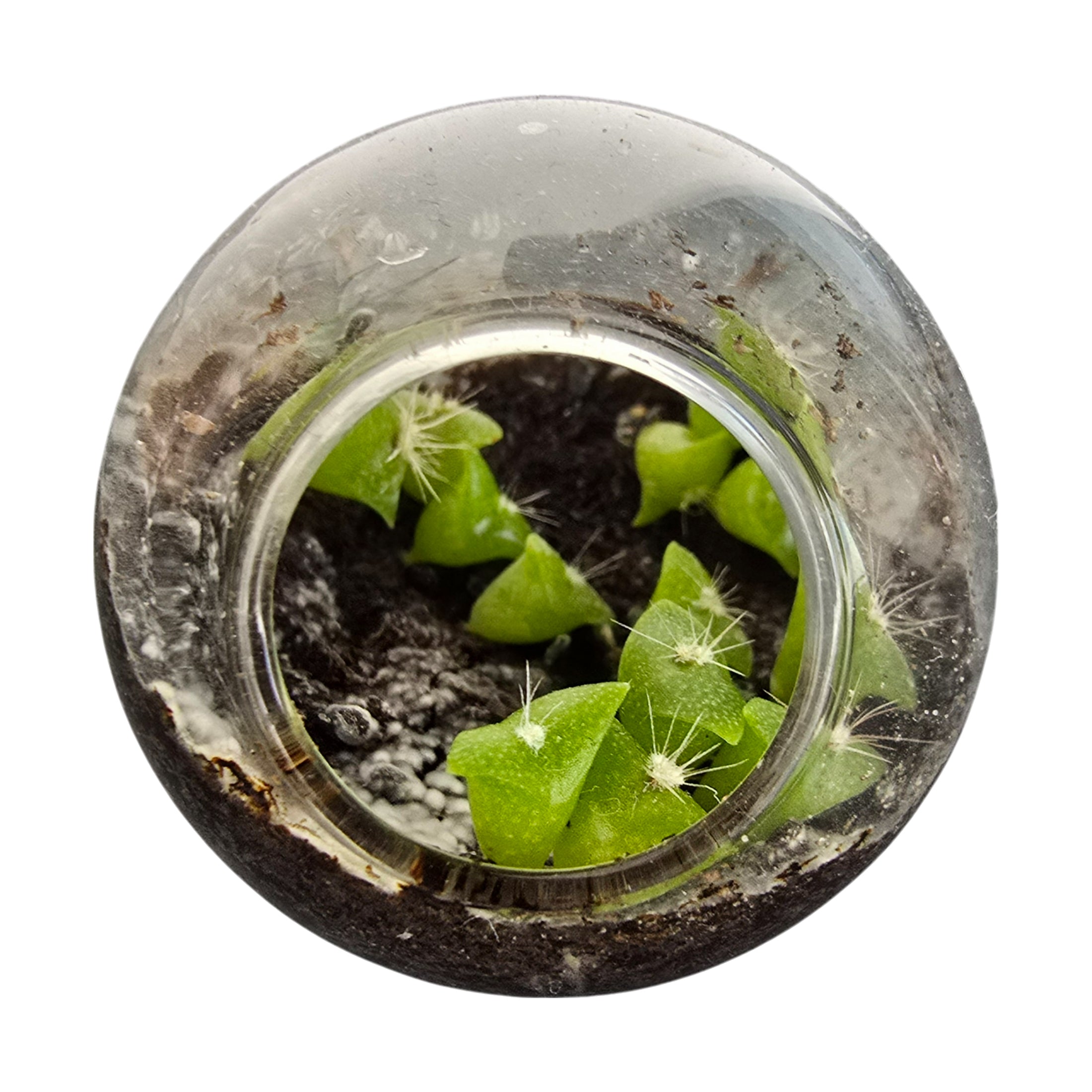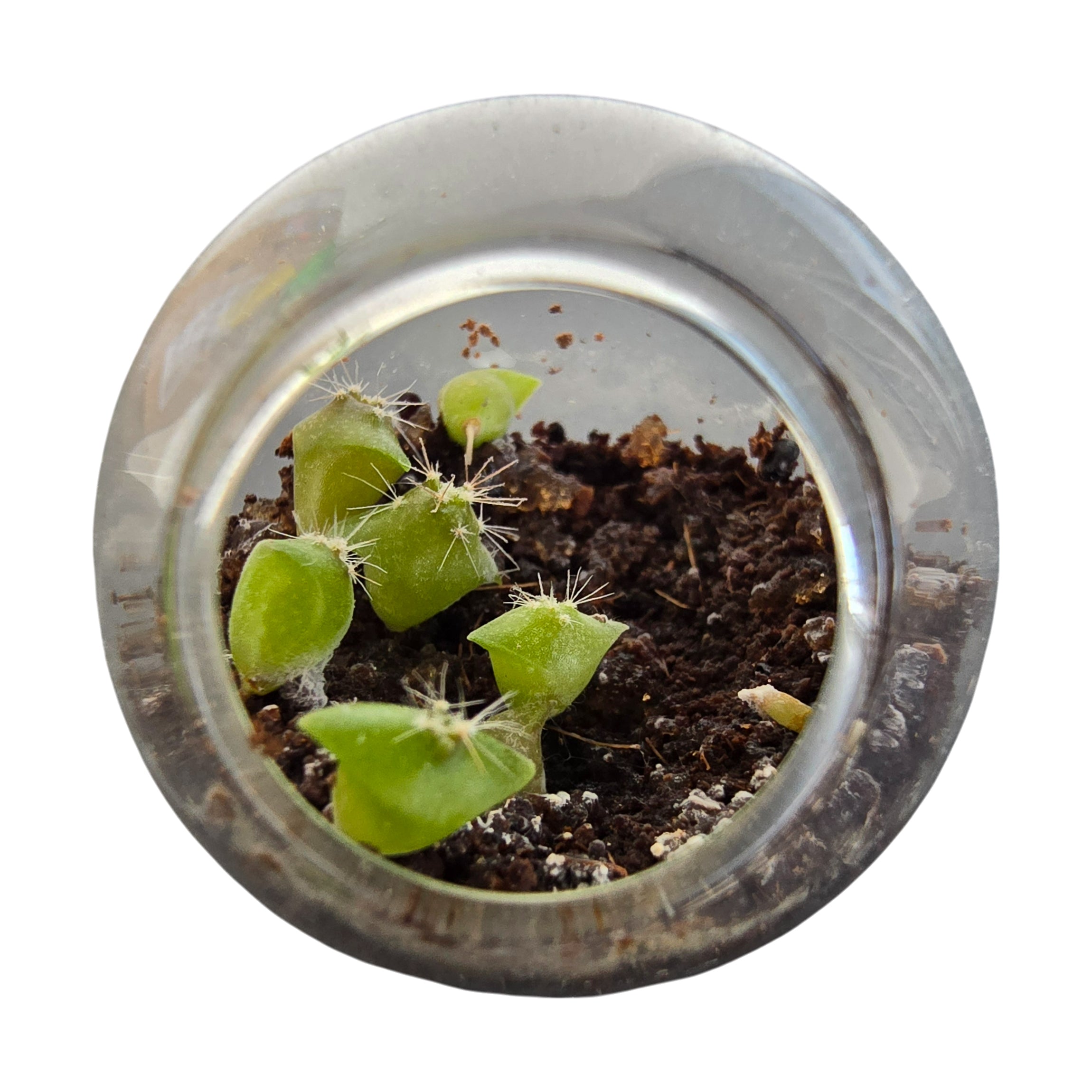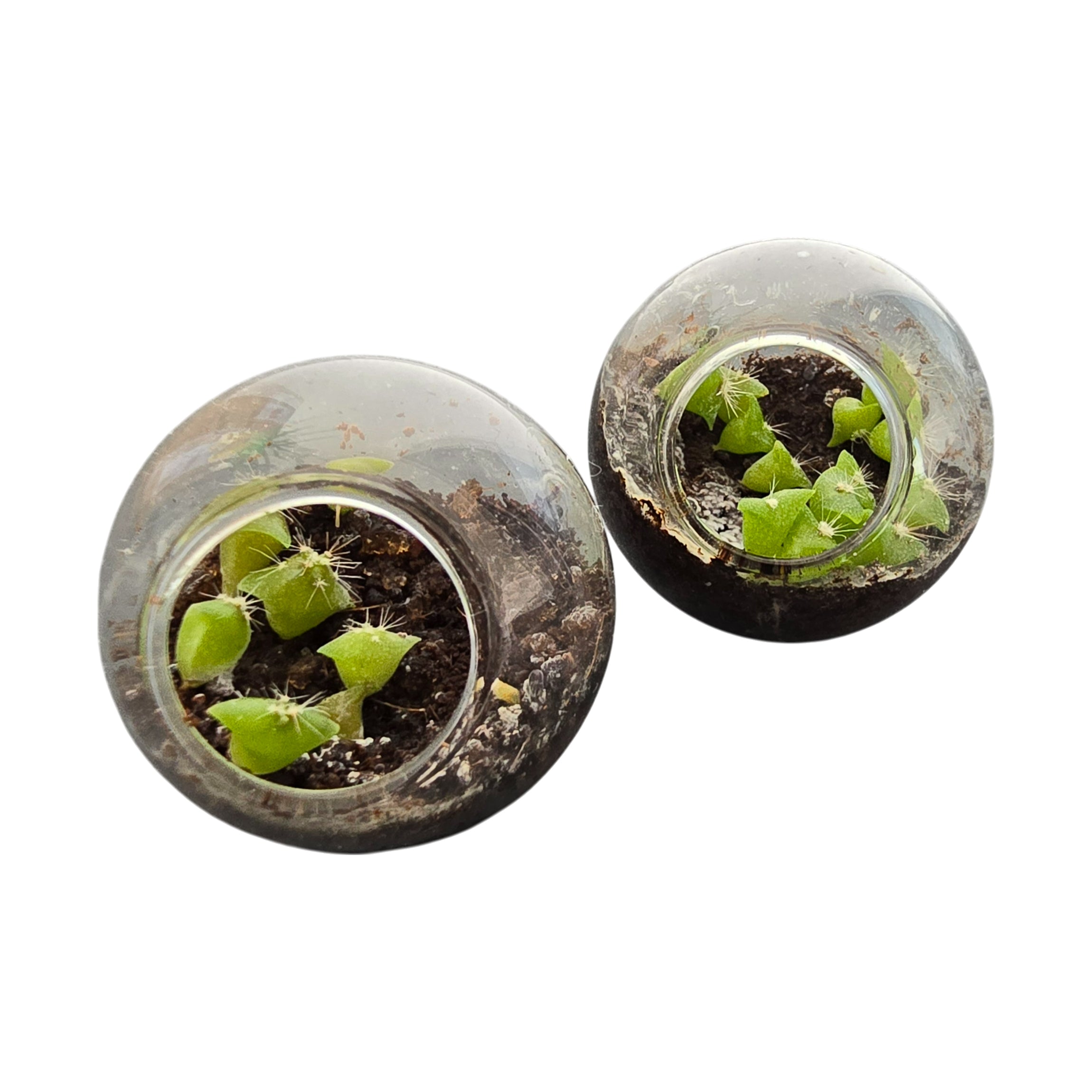 Create your own desert oasis with this set of six miniature glass cactus terrariums that are perfect for plant lovers, creative hands, and happy spaces. Despite their compact size, these glass terrariums are far from ordinary. Designed with a flat-bottom base, they stay put and can be placed almost anywhere with bright light. This variety pack features six unique cactus varieties, each thriving in a compact glass micro-environment.