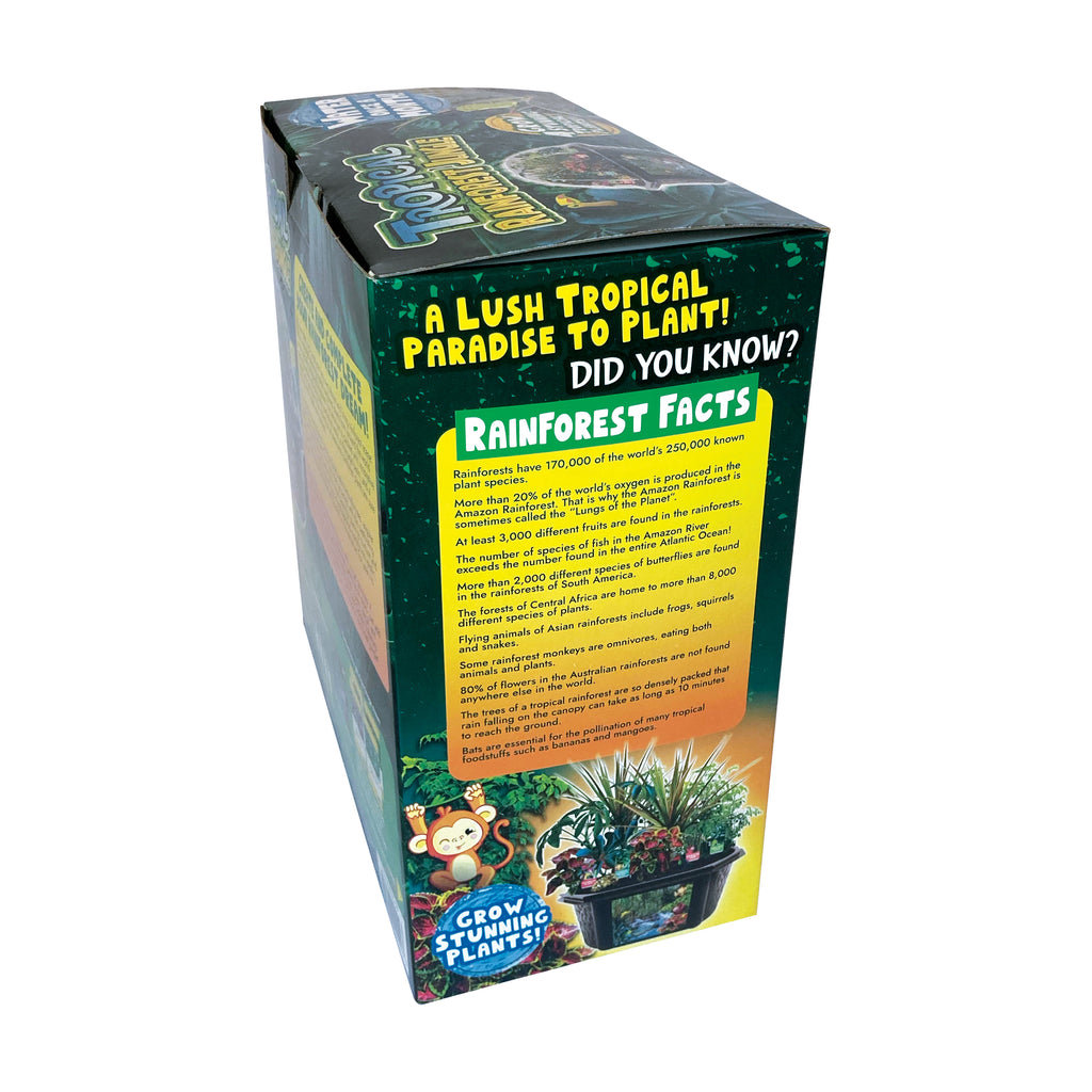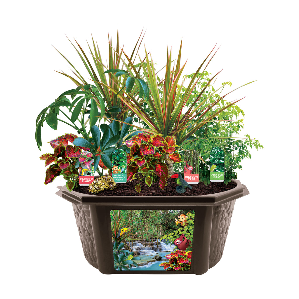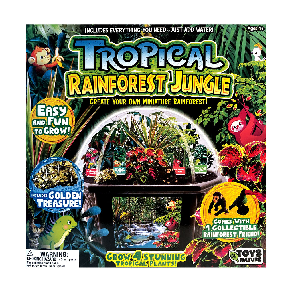This botanical cornucopia of plants includes bushy Umbrella trees, angular Dragon trees, and delicate China Doll trees accented with the captivating Rainbow Plants! These are some of the most beautiful plants to nurture and watch grow in the world. They will sprout and develop quickly into exotic, colorful, and unusual plants that will flourish in the terrarium for years to come! The complete kit comes with everything you need to get growing - just add water! Complete your scene with the included color stakes, decal, and Tropical Cover Bark. Place your Rainforest Friend and Golden Treasure anywhere you want to finish making your own tropical rainforest jungle!