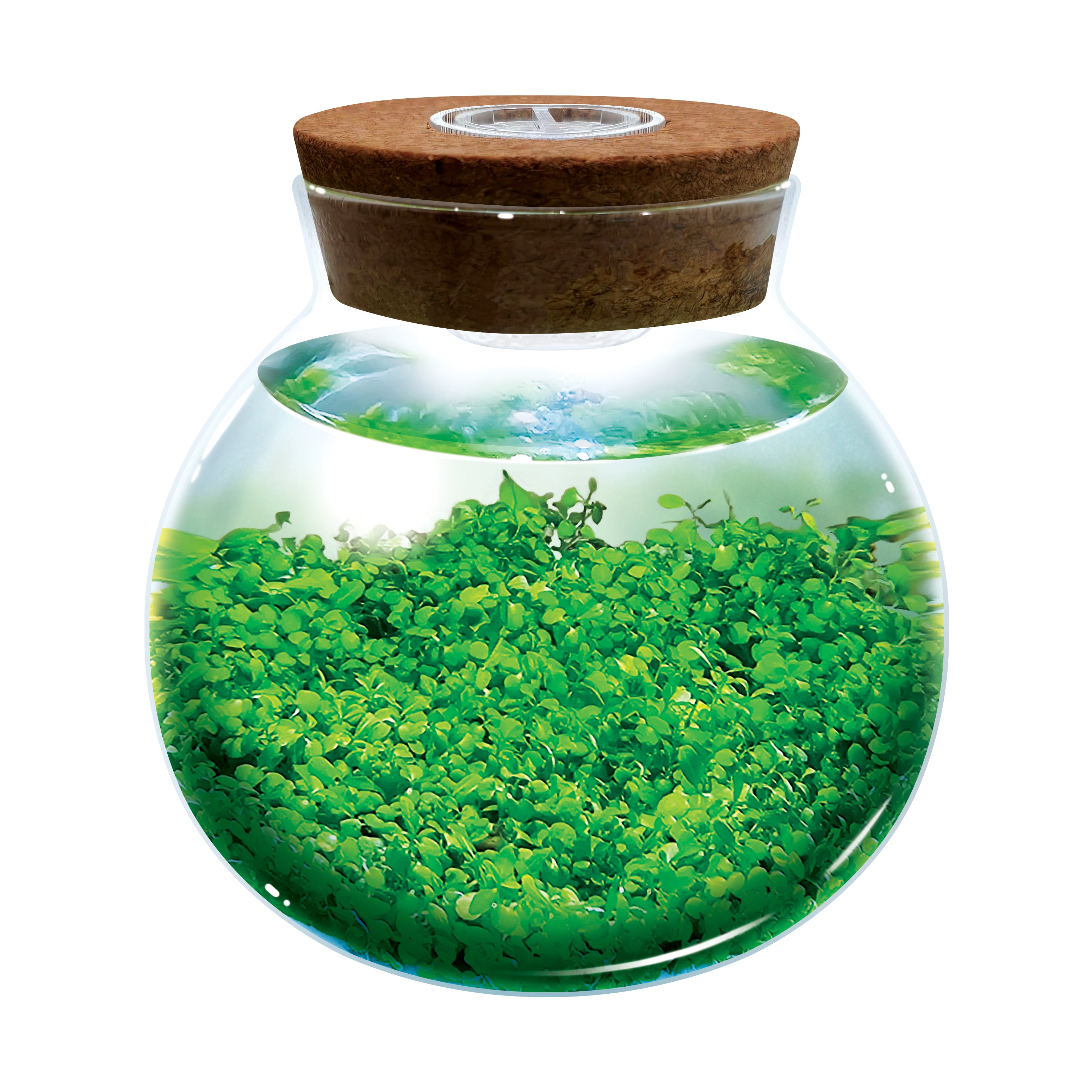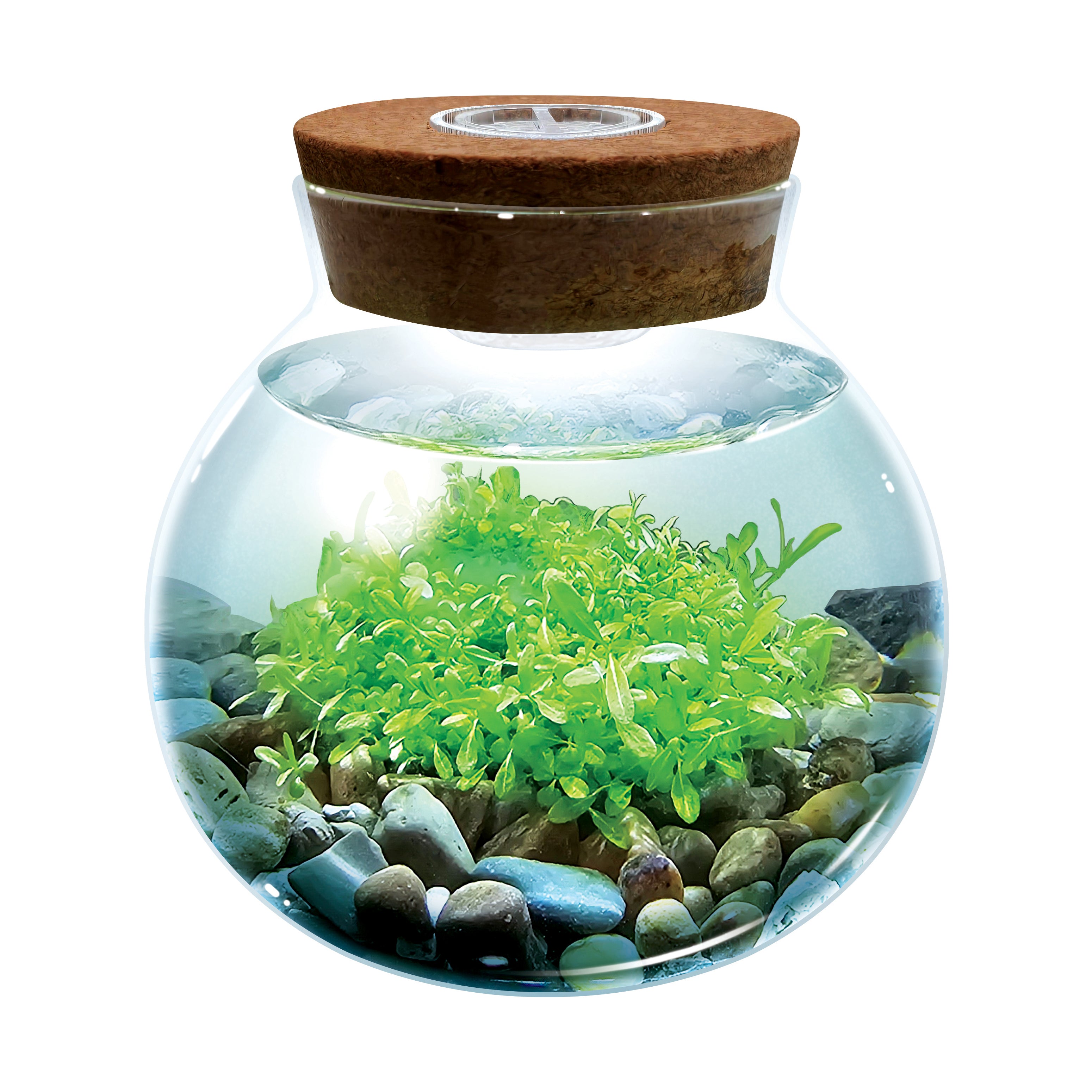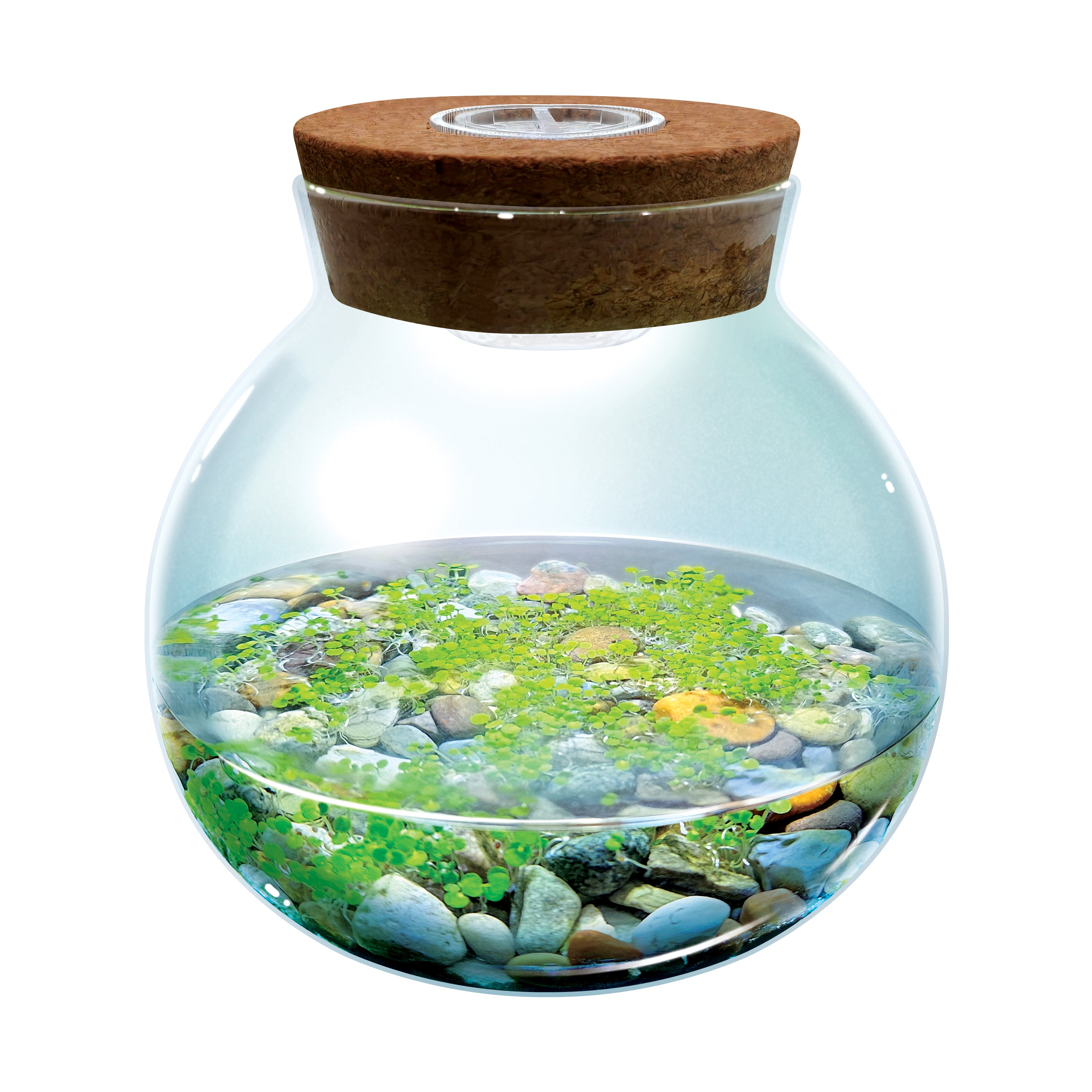 Transform any space with a stunning, self-sustaining aquascape using this unique and innovative WaterPlants kit. Grow some of the world's smallest aquatic plants that will thrive on the included gravel, accent stone, or both. The star of this aquascape, Water Jade, not only adds vibrant greenery, but also removes nitrates from the water, helping prevent algae growth. For added ambiance, the cork top features three bright LED accent lights to beautifully illuminate your vibrant aquatic creation. Once planted, these fascinating plants thrive in the included terrarium with almost no care or maintenance, offering years of enjoyment. Requires 2 CR2032 batteries (included).