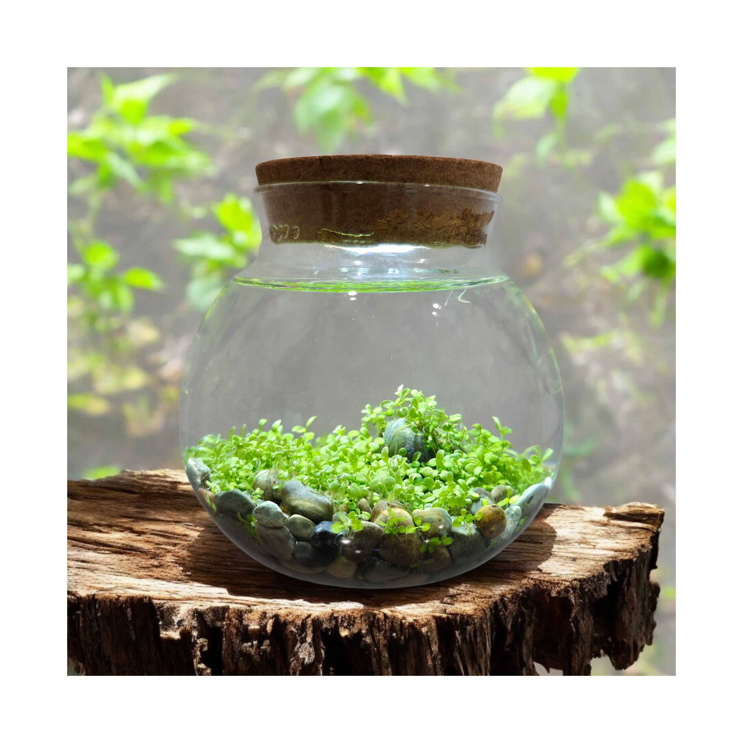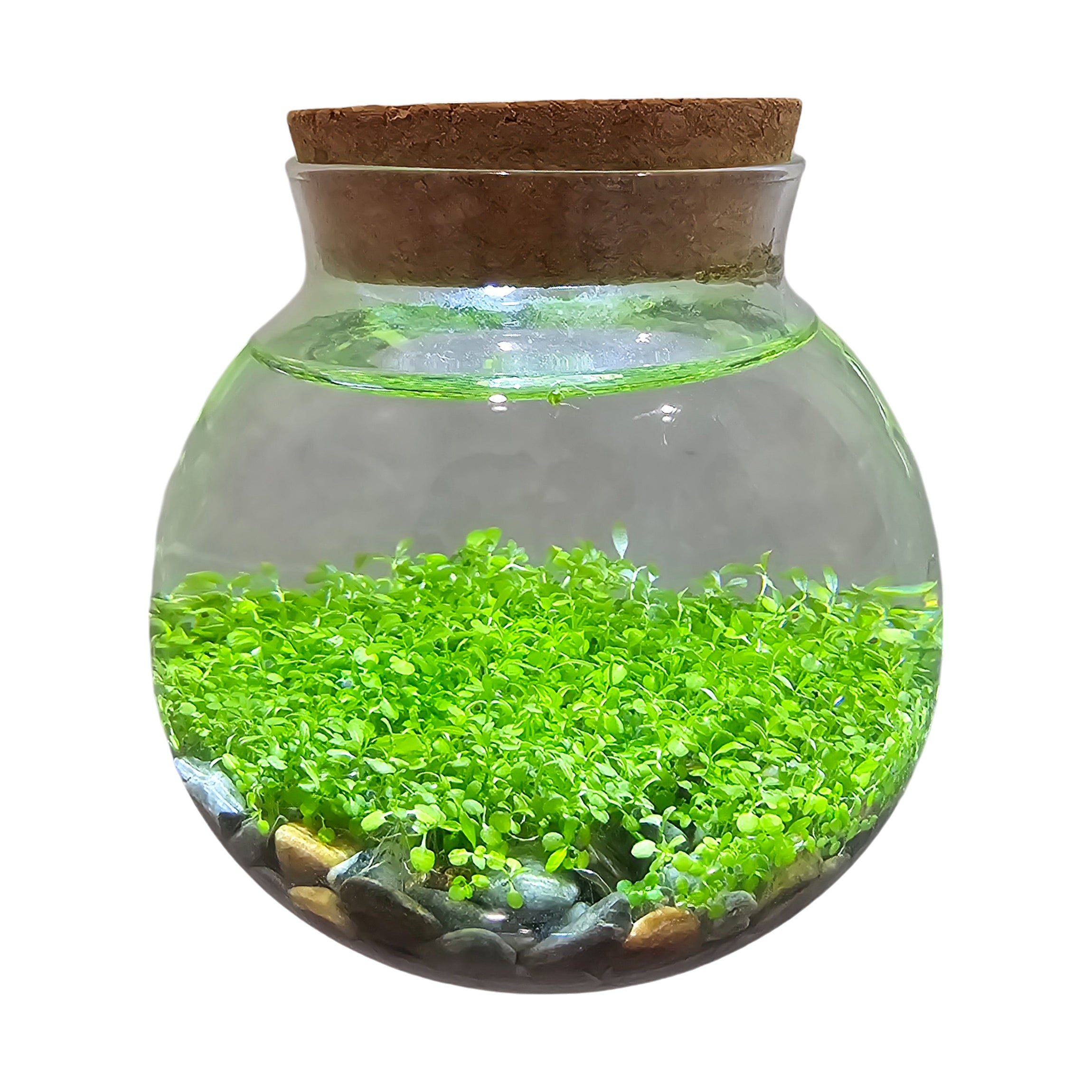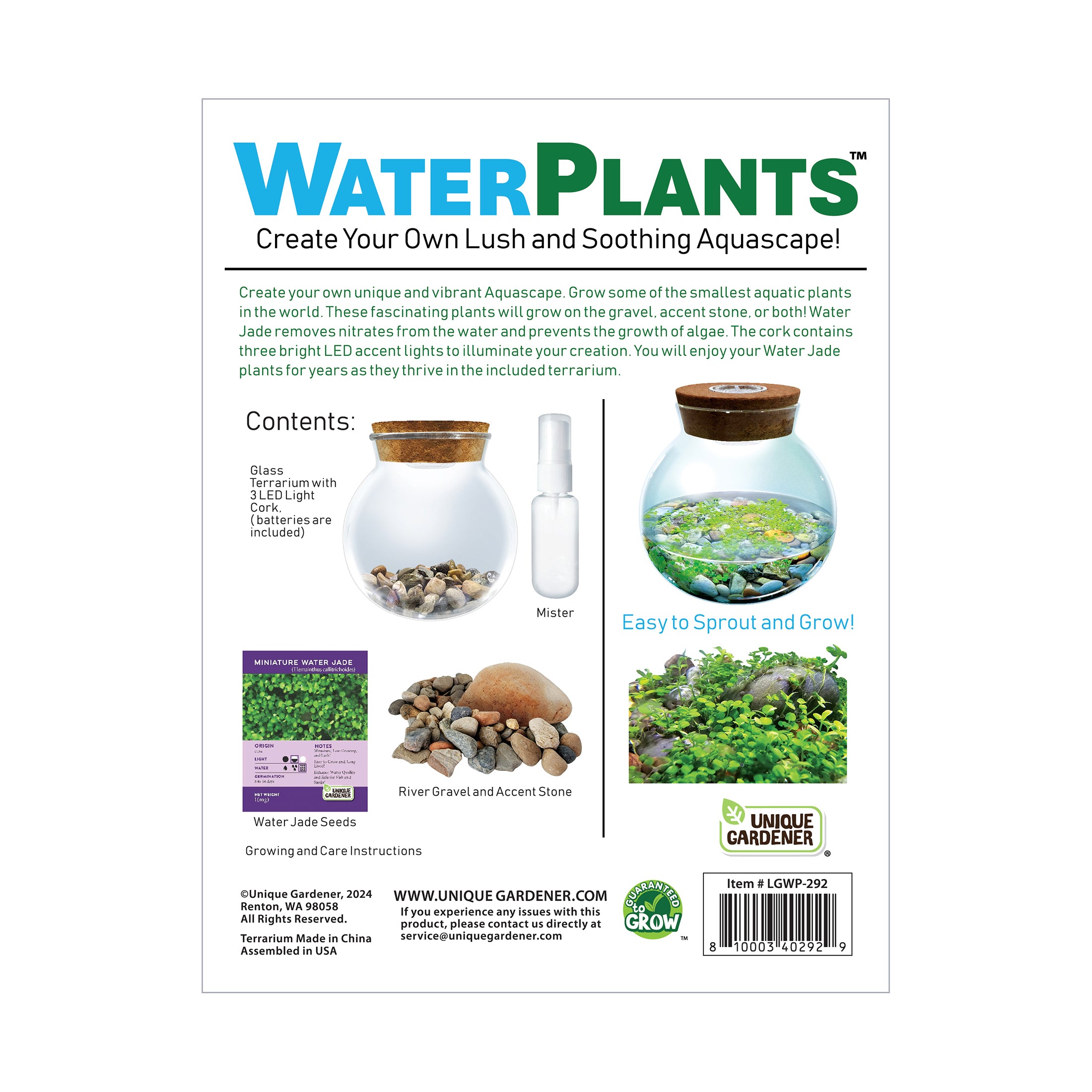 Transform any space with a stunning, self-sustaining aquascape using this unique and innovative WaterPlants kit. Grow some of the world's smallest aquatic plants that will thrive on the included gravel, accent stone, or both. The star of this aquascape, Water Jade, not only adds vibrant greenery, but also removes nitrates from the water, helping prevent algae growth. For added ambiance, the cork top features three bright LED accent lights to beautifully illuminate your vibrant aquatic creation. Once planted, these fascinating plants thrive in the included terrarium with almost no care or maintenance, offering years of enjoyment. Requires 2 CR2032 batteries (included).